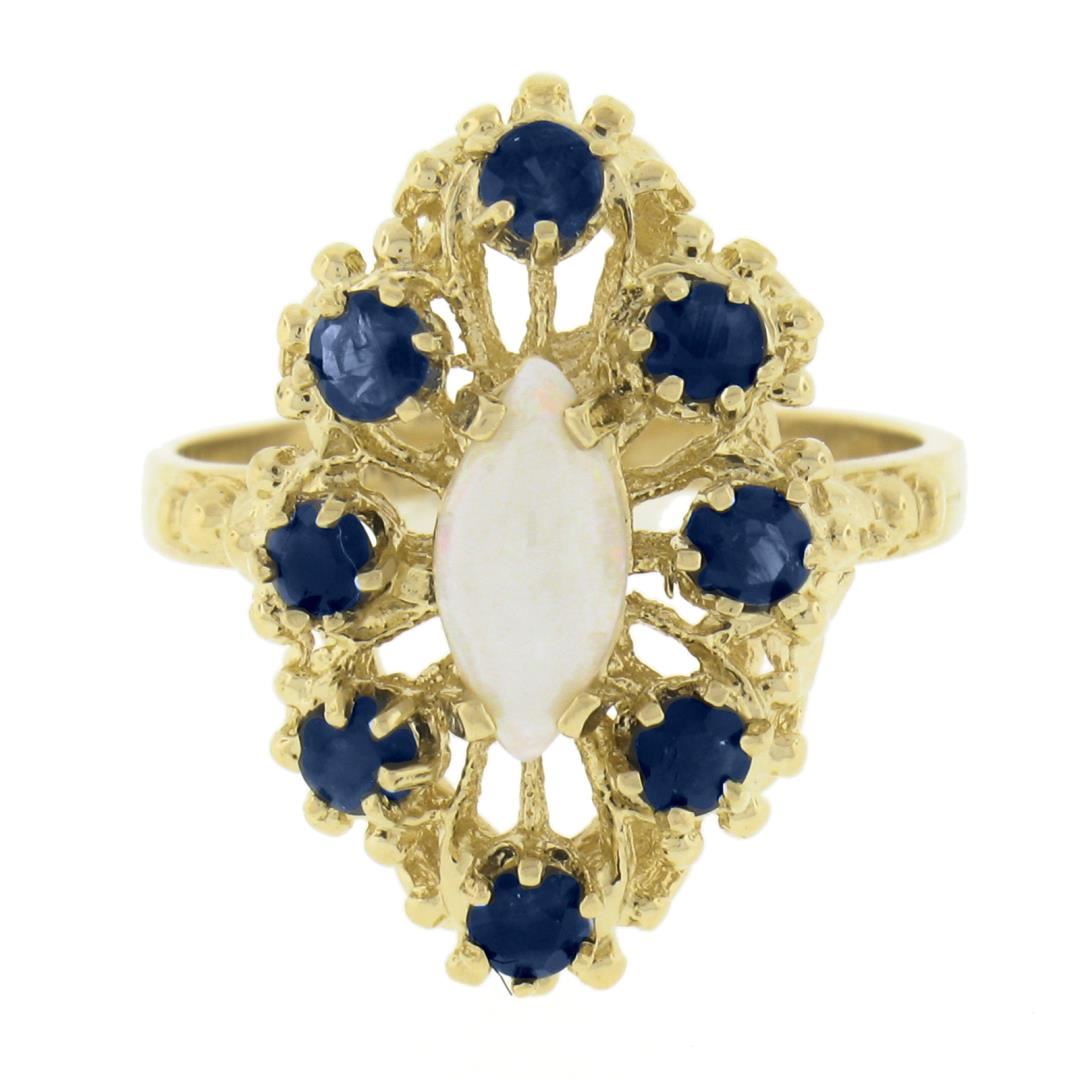 A vintage solid 14k yellow gold ring, with 1 marquise cut natural opal (8.4x4mm), surrounded with a halo of 8 round cut natural sapphires (0.40ctw). The ring is size 5.5, weighs a total of 3.58 grams, and measures 19.5mm wide.
