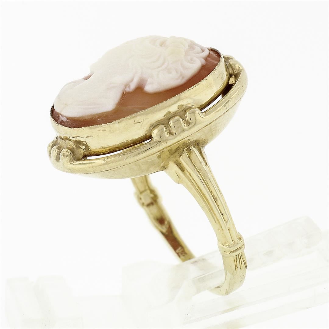 A vintage solid 14k yellow gold ring, featuring 1 oval shape natural carved shell. The ring is size 5.5, weighs a total of 4.14 grams, and measures 19.2mm wide.