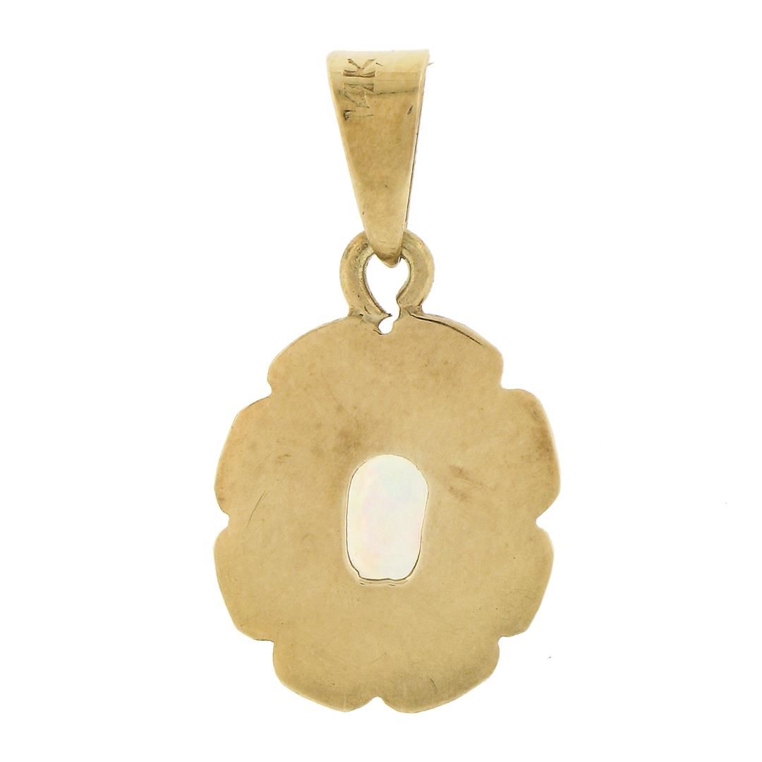 A vintage solid 14k rosy yellow gold pendant, with 1 oval cabochon cut natrual opal (7.4x5.9mm). The pendant weighs a total of 2.87 grams, measures 28.1x14.5mm including the bail.