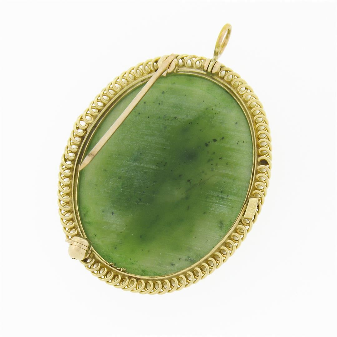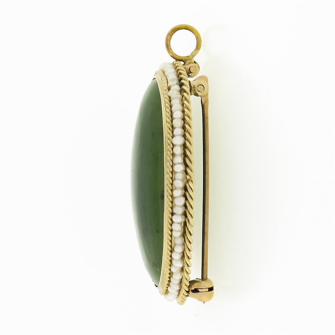 A vintage solid 14k yellow gold brooch pendant, with 1 oval cabochon cut natural jade (29.80x23.50mm), surrounded with a halo of seed pearls (0.7mm each). Measures 39.65x29mm and weighs a total of 9.32 grams.