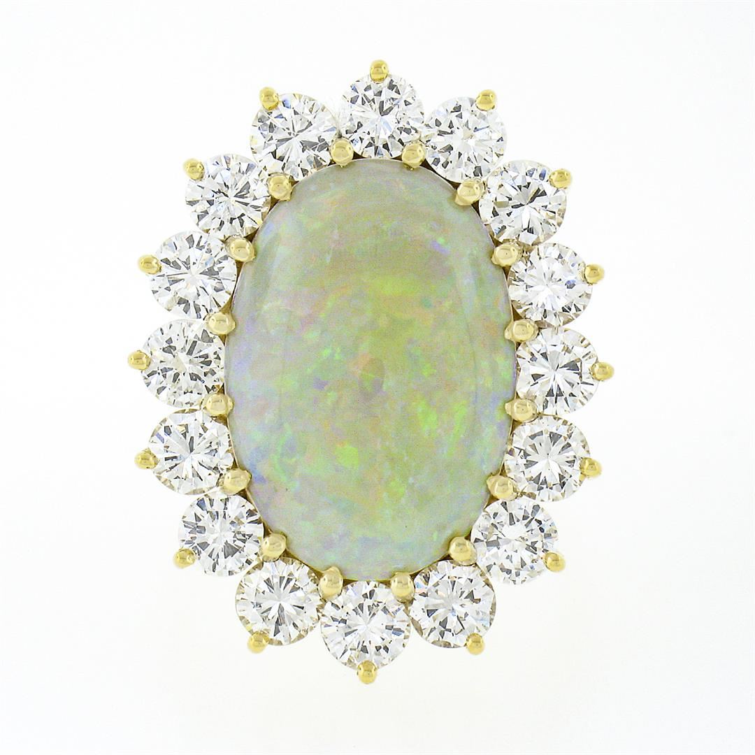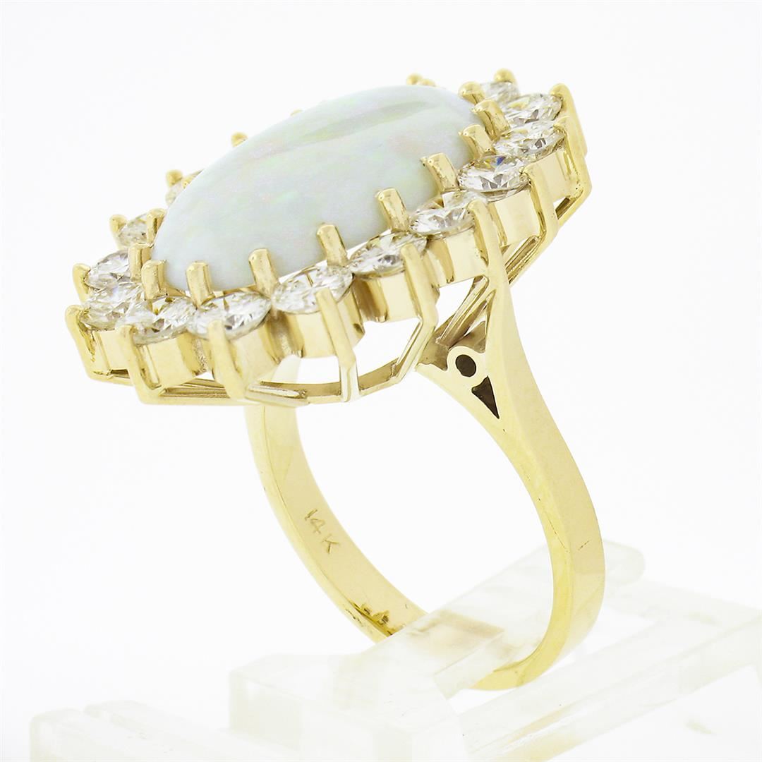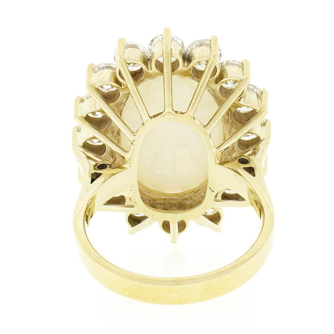 A solid 14k yellow gold ring, with 1 oval cabochon cut natural opal (18x12.45mm), surrounded with a halo of 16 round brilliant cut natural diamonds (G/H - VS1-SI1 ; 4.0ctw). The ring is size 7.0, weighs a total of 8.72 grams, and measures 26.70mm wide.