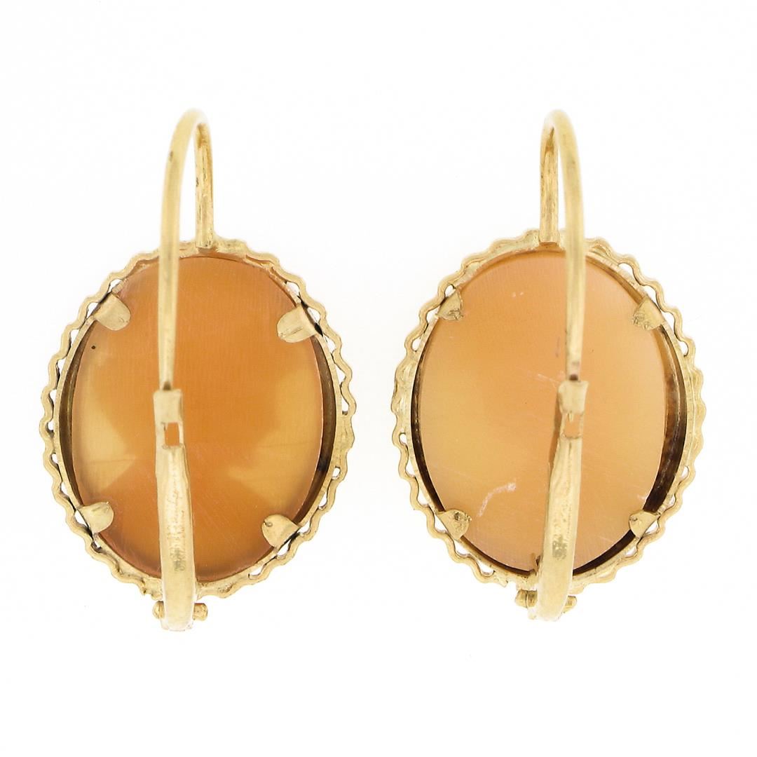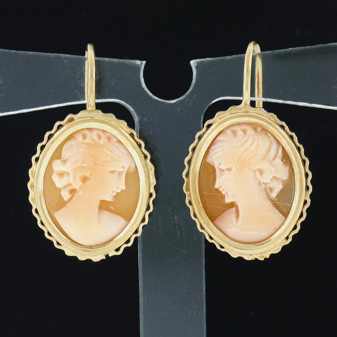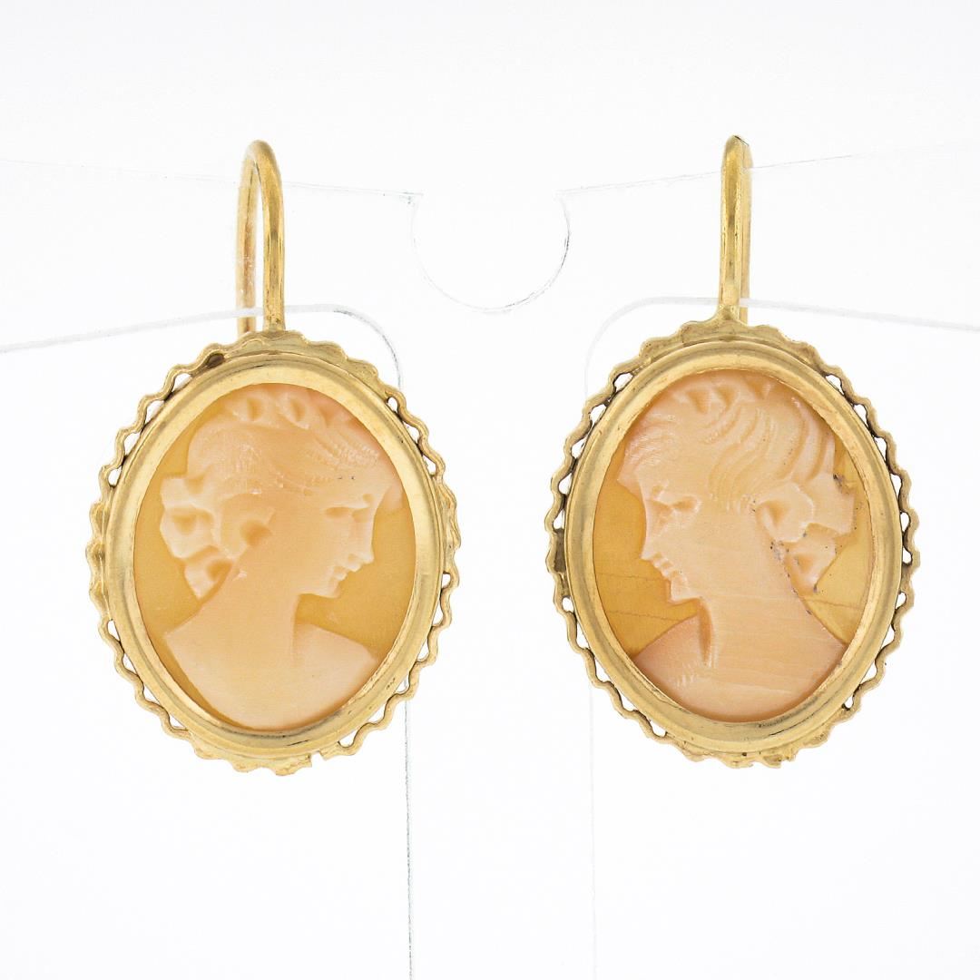Vintage 14k Gold Oval Carved Shell Cameo w/ Wavy Wire Frame Drop Dangle Earrings