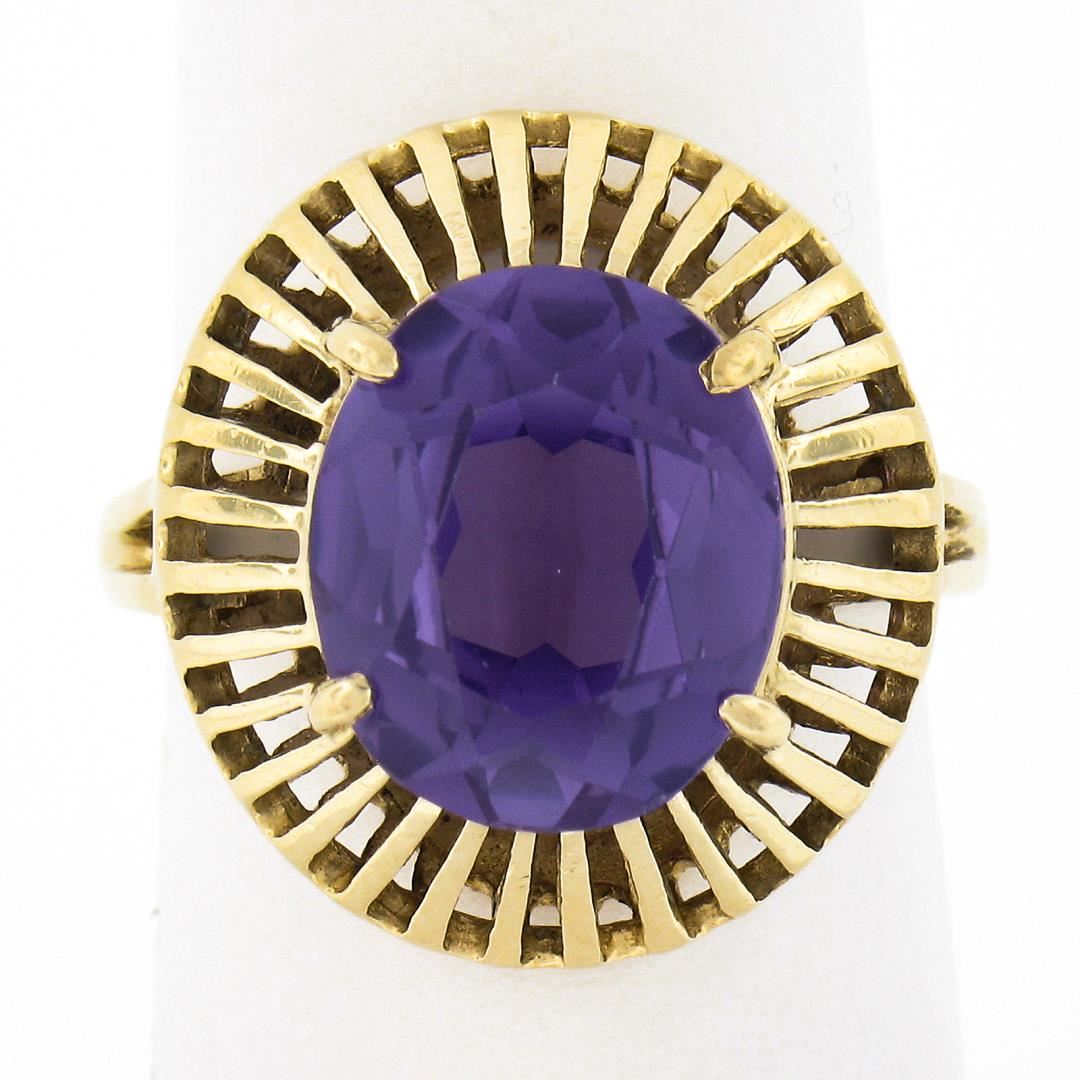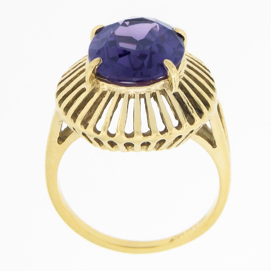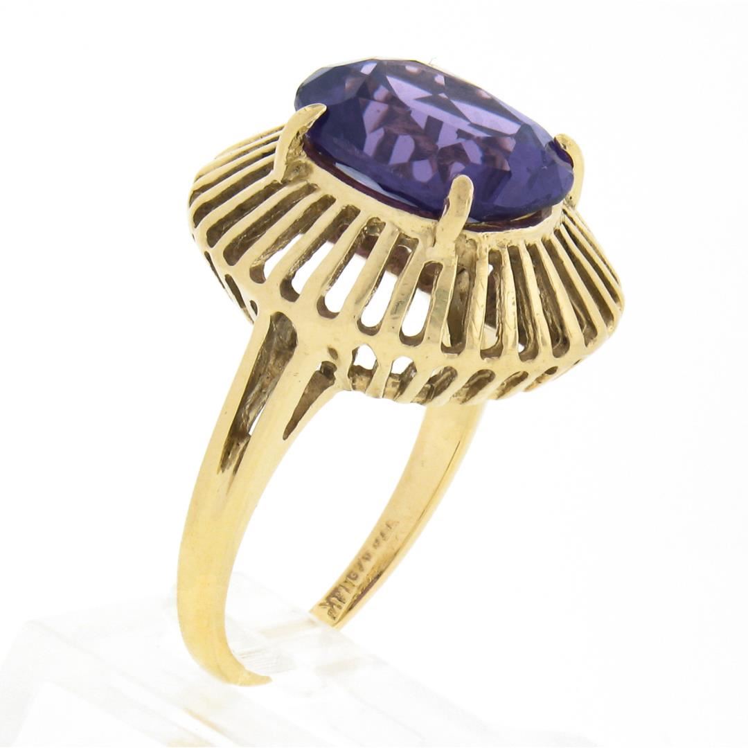 A vintage solid 14k yellow gold solitaire ring, with 1 oval cut synthetic alexandrite (11.9x10mm). The ring is size 6.5, weighs a total of 5.47 grams, and measures 18.4mm wide.