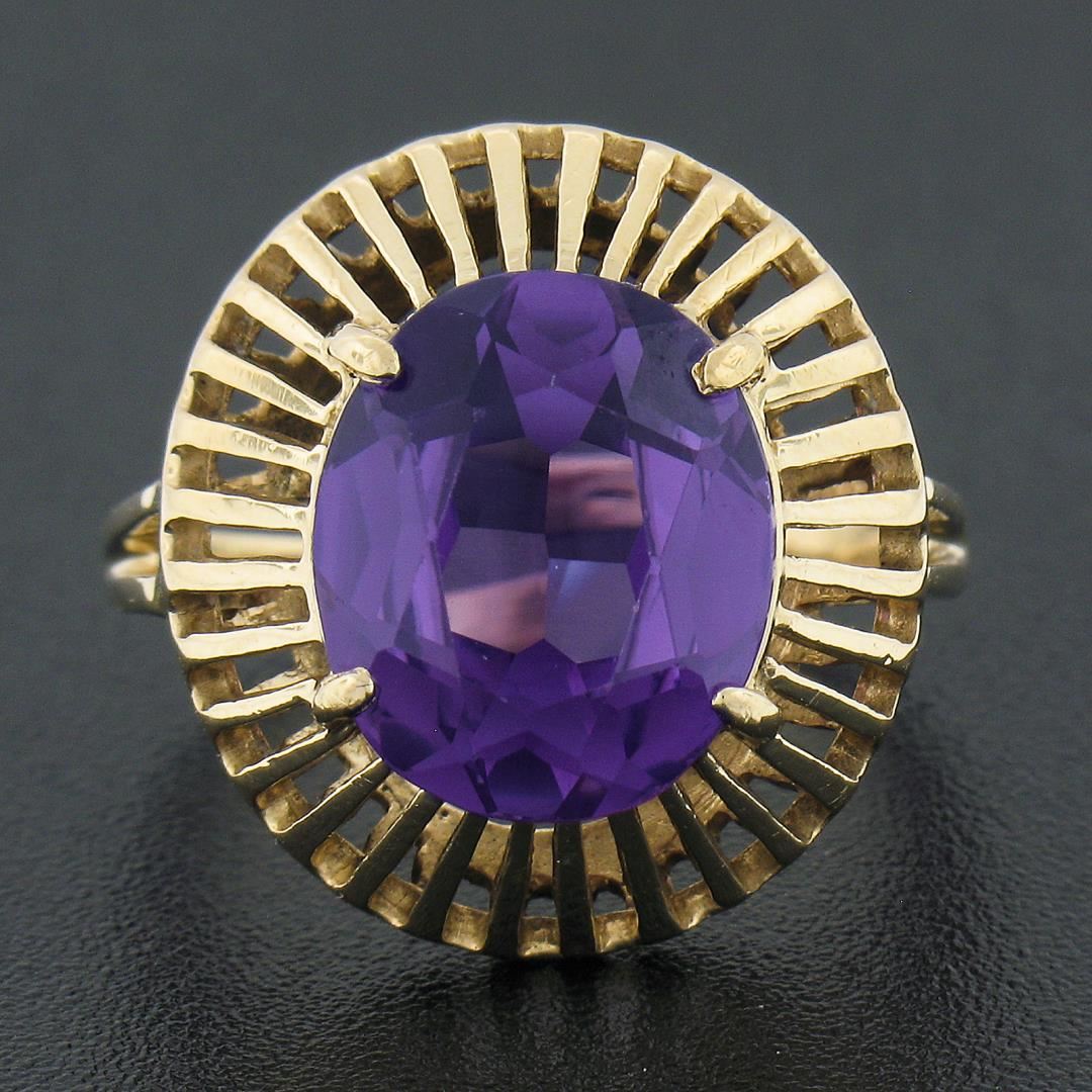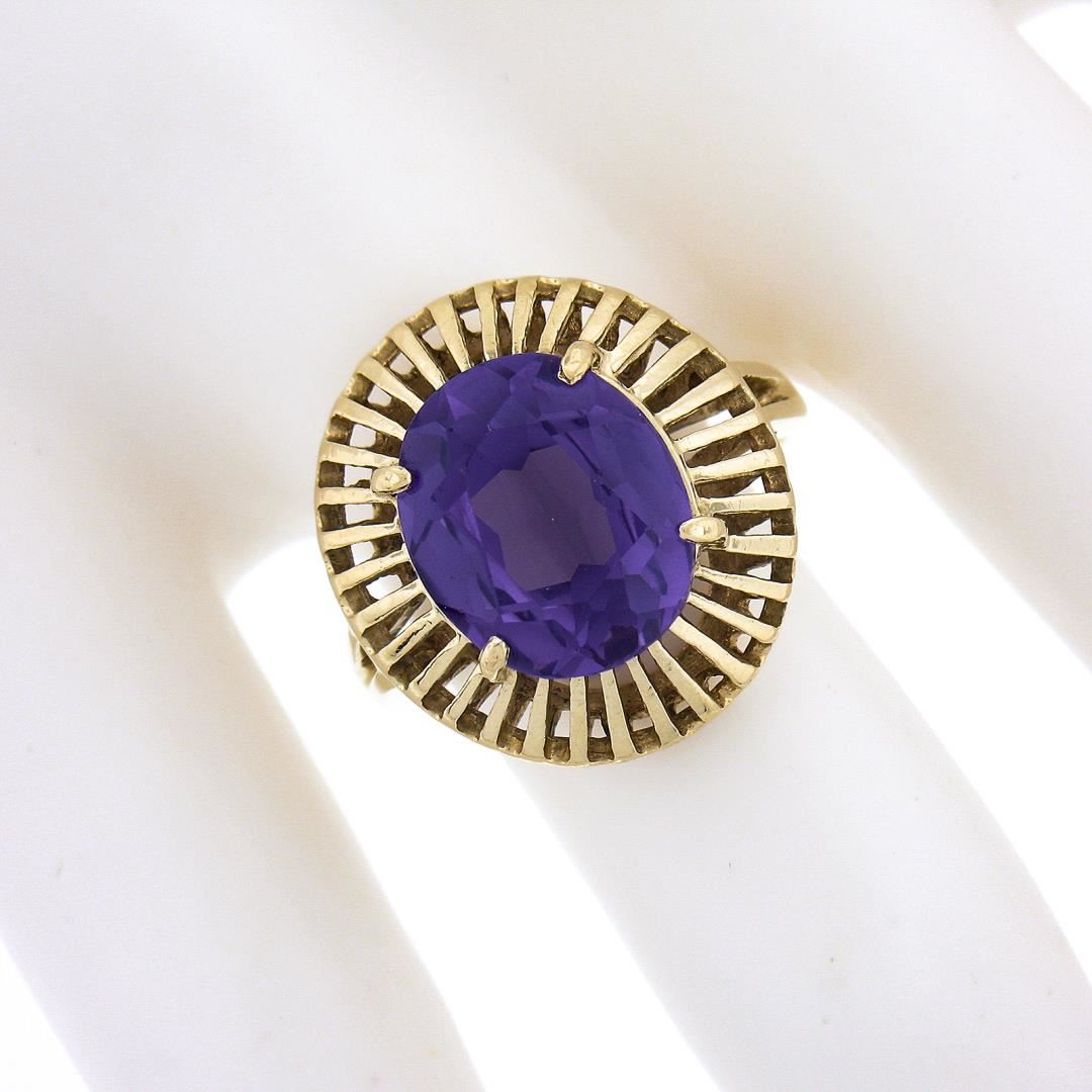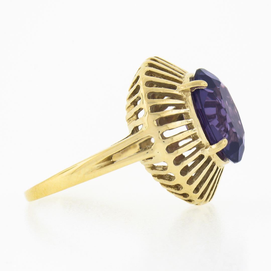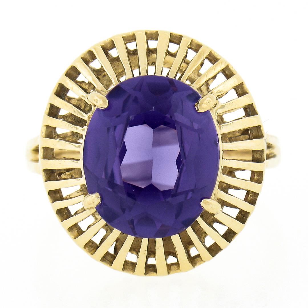 A vintage solid 14k yellow gold solitaire ring, with 1 oval cut synthetic alexandrite (11.9x10mm). The ring is size 6.5, weighs a total of 5.47 grams, and measures 18.4mm wide.
