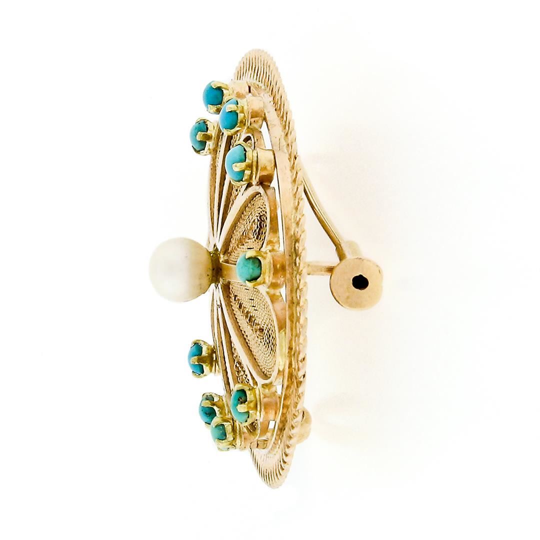 A vintage 14k yellow gold filigree work brooch or pendant with 1 round shaped cultured pearl (5.55mm) surrounded with 10 round cabochon cut natural turquoise (2.85mm). Measures 45.72x35.04mm and weighs a total of 15.00 grams.