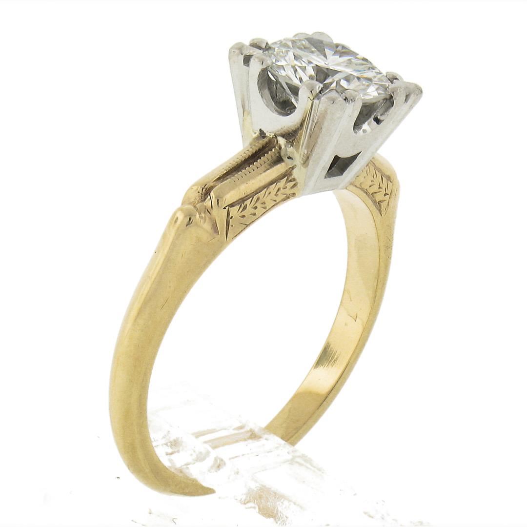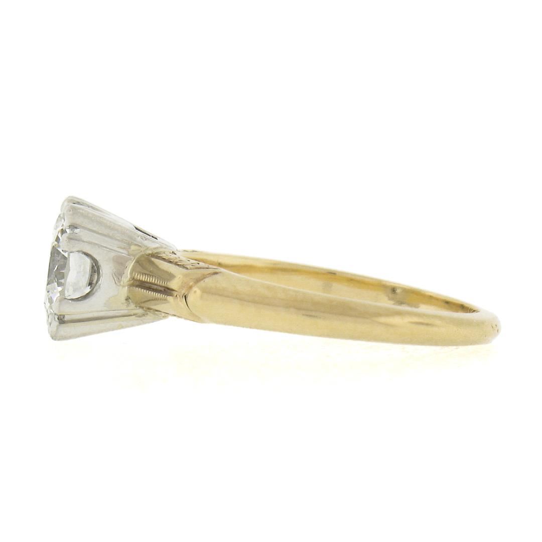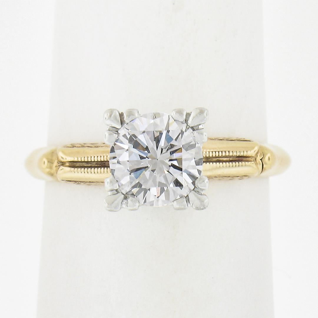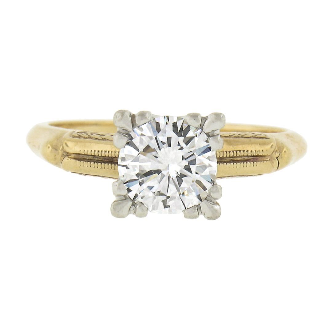 A vintage solid 14k yellow gold & platinum engagement ring, with 1 round cut natural diamond (G - VS1 ; 0.82ct). The ring is size 4.5, weighs a total of 3.15 grams, and measures 6.6mm wide.