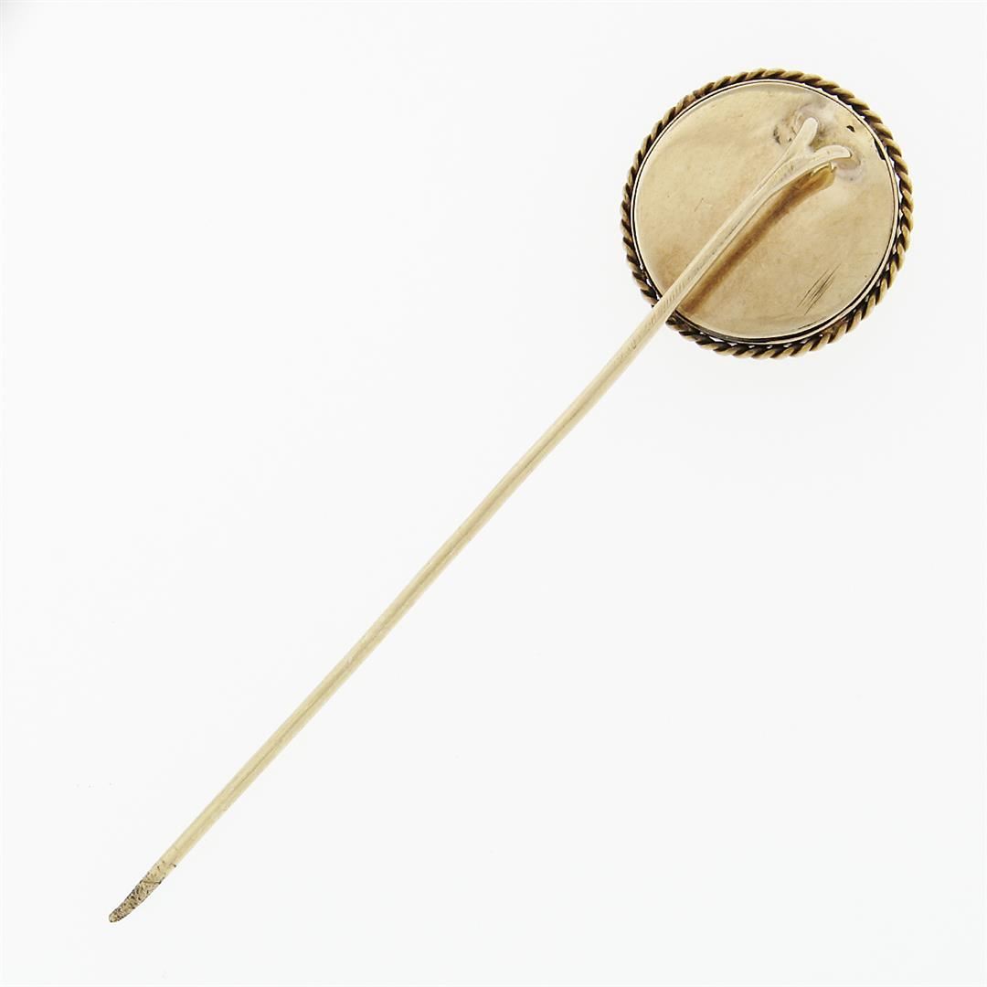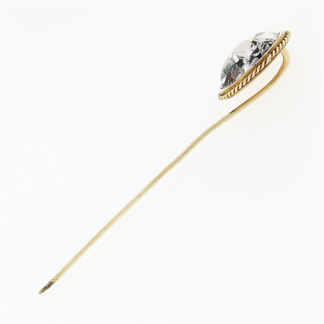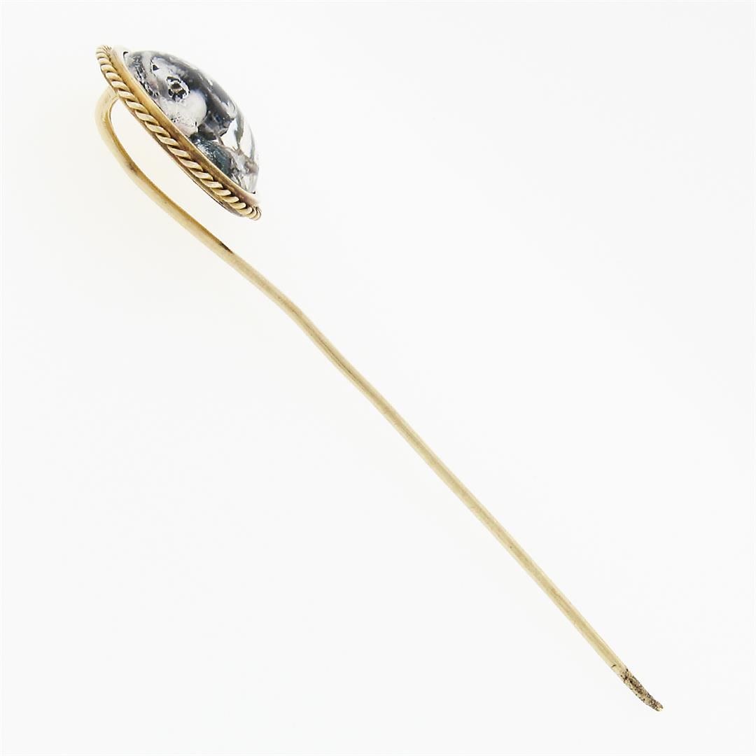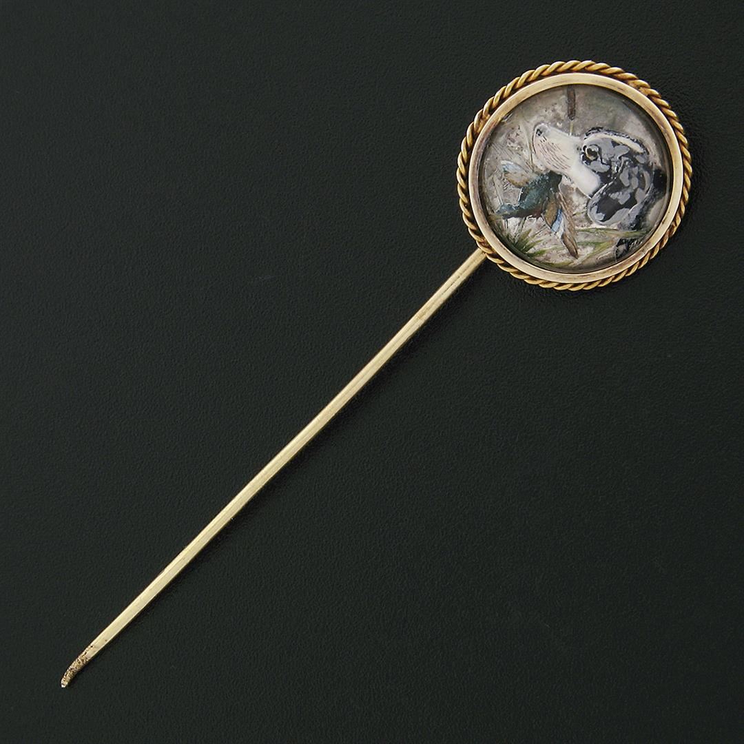 A vintage solid 14k yellow gold stick pin, with hand painted dog & bird portrait. Measures 79.40x21.20mm and weighs a total of 7.2 grams.