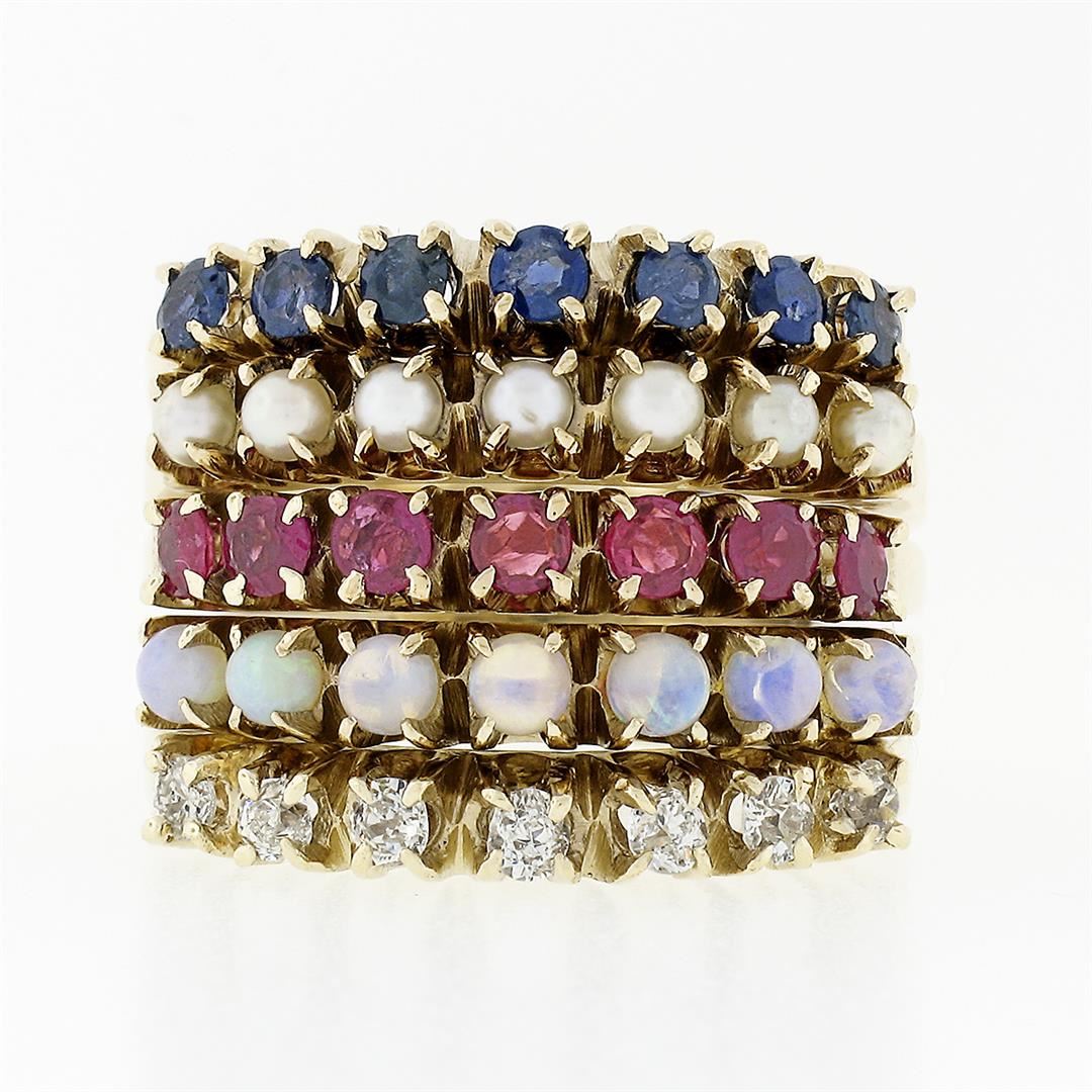 A vintage solid 14k yellow gold 5 band harem stack ring, featuring round shape 7 sapphires (0.60ctw ), 7 rubies (0.70ctw), 7 cultures pearls (2.30mm), 7 natural diamonds (F - VS1/VS2 ; 0.35ctw), 7 natural opals (2.51mm). The ring is size 7, weighs a total of 13.23 grams, and measures 16.96mm wide.