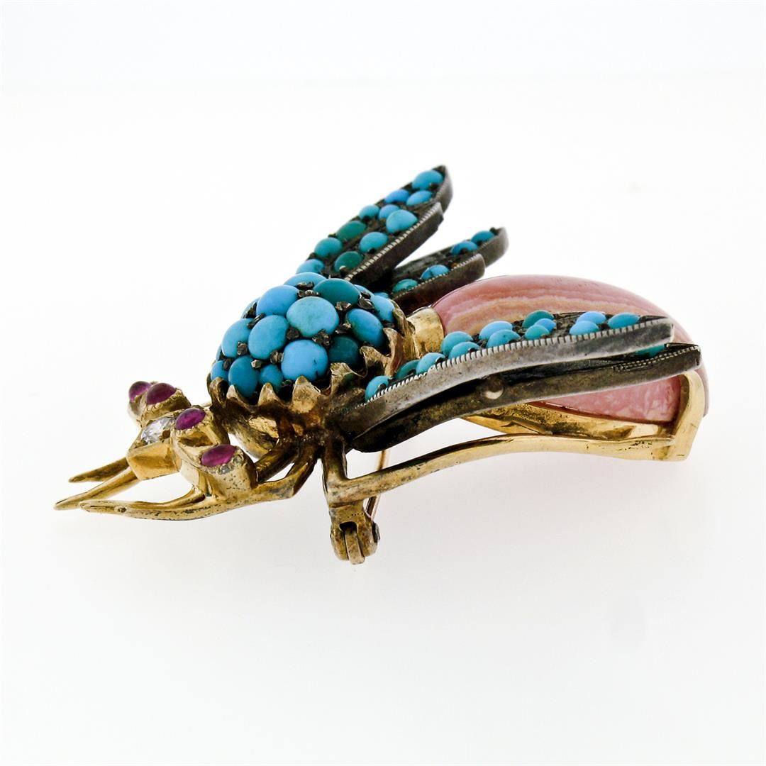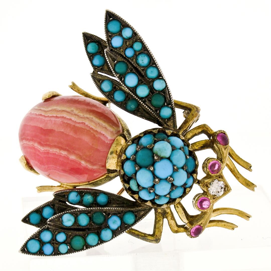 A vintage 14k yellow gold and sterling silver bee fly pin brooch, featuring 55 cabochon cut natural turquoises (1.5mm-3.3mm), and 4 cabochon cut natural rubies (0.20ctw ), with 1 transitional cut natural diamond ( G- VS2; 0.09ctw), and 1 oval cabochon cut natural rhodochrosite (20.25x15.0mm). Measures 41.75x42.30mm and weighs a total of 18.79 grams.