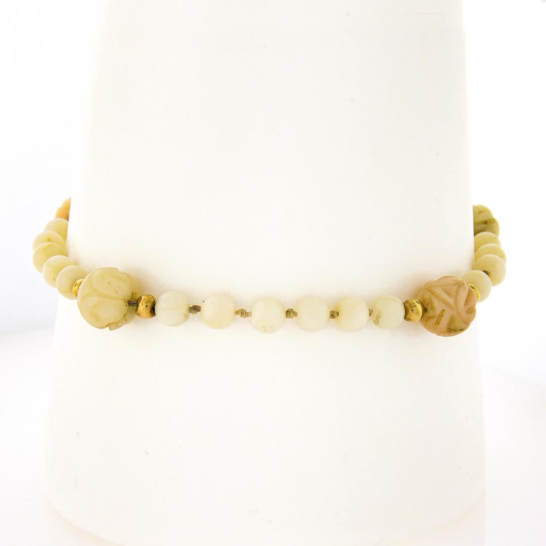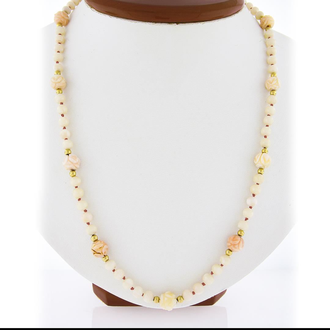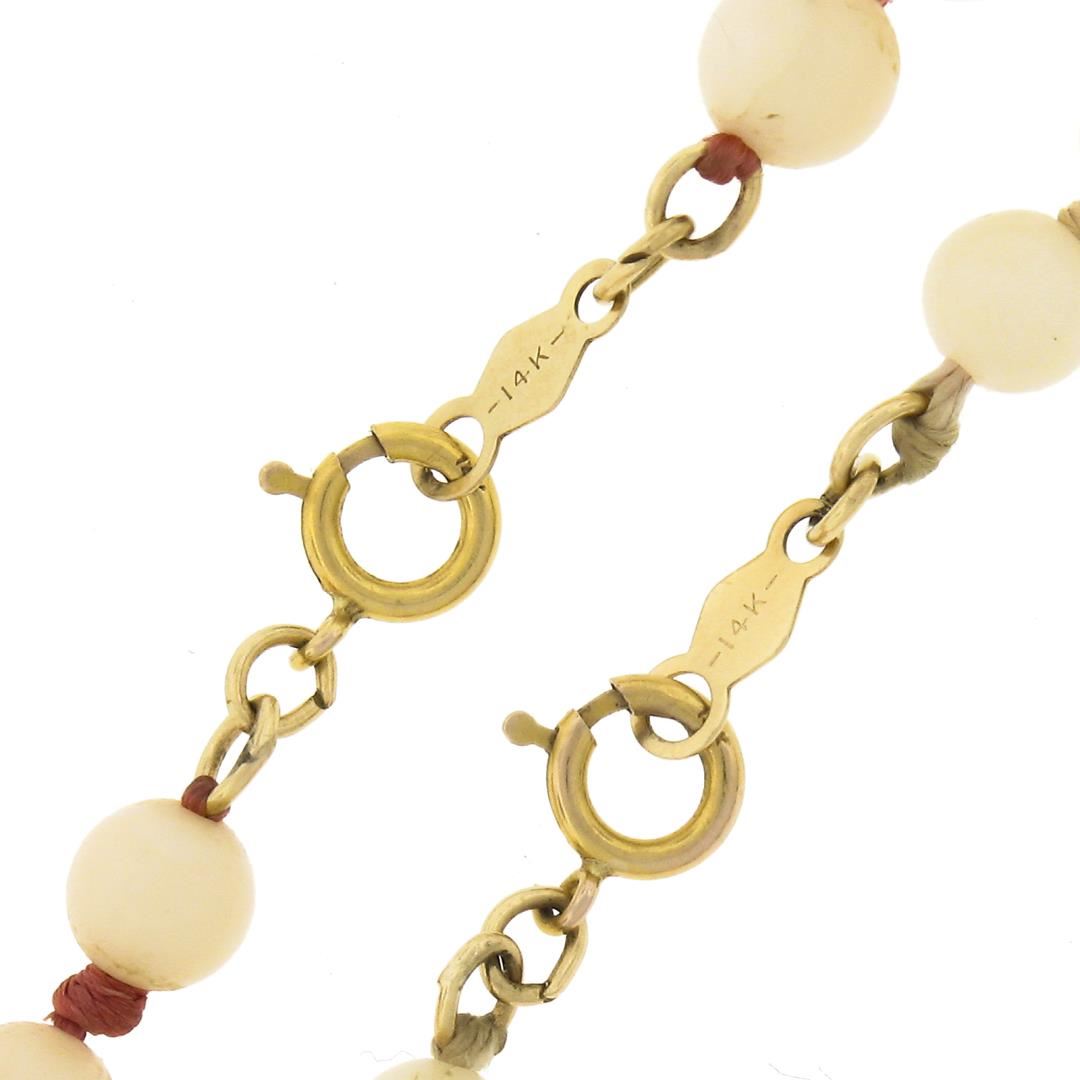 A vintage sp;od 14k yellow gold set of necklace & bracelet, featuring numerous of round bead shape natural carved corals (4.9-8.0mm each). It weighs a total of 32.14 grams, measures 8.0mm wide, the bracelet measures 7 inches in length, and the necklace measures 30 inches in length.