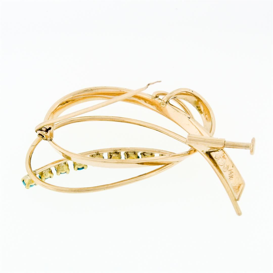 A vintage solid 14k rose gold pin brooch, with 9 round cabochon cut natural turquoise (2.8-2.85mm). Measures 45.8x30.1mm and weighs a total of 7.81 grams.