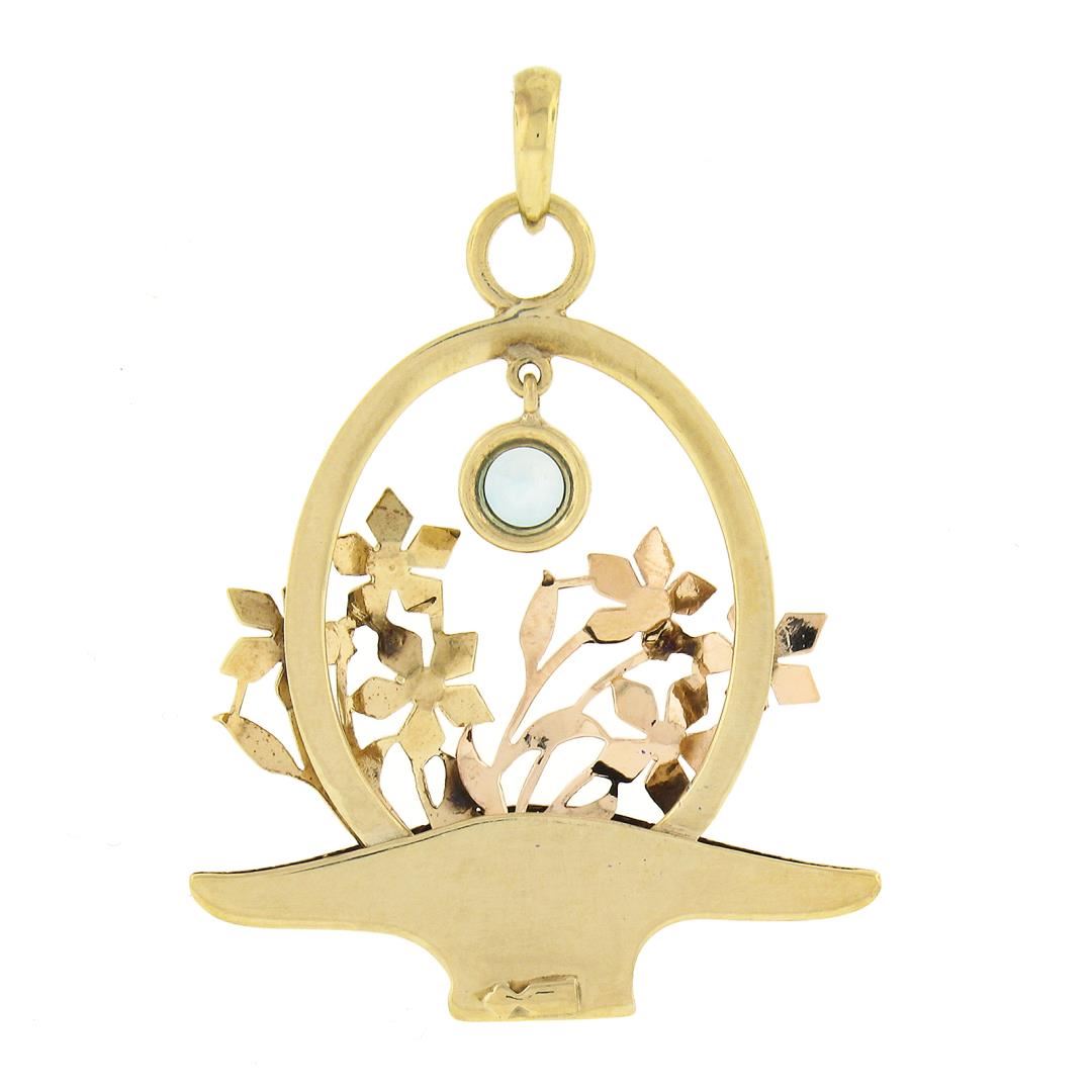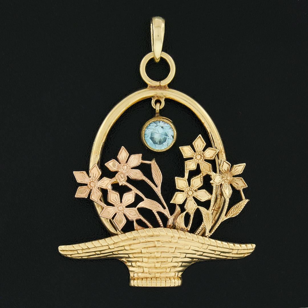 A vintage solid 14k yellow and rose gold charm pendant, with 1 round cut natural blue zircon (0.75ct). The pendant weighs a total of 5.41 grams, measures 45.2x33.3mm including the bail, and the inside of the bail measures 4.9x3.7mm.