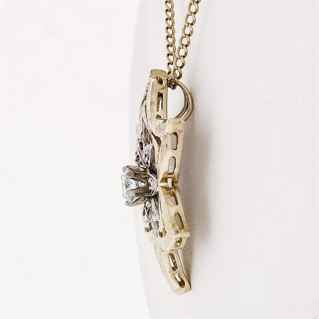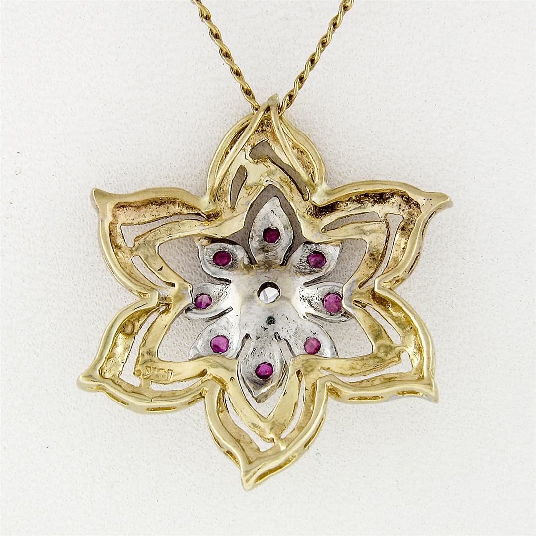 Vintage 14k Two Tone Gold Diamond Ruby Florentine Finish Flower Pendant Necklace