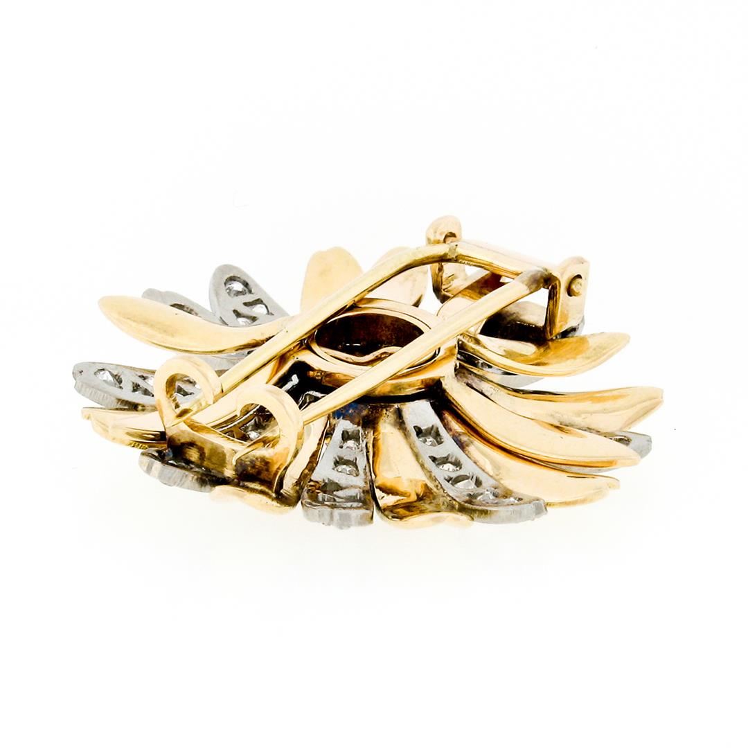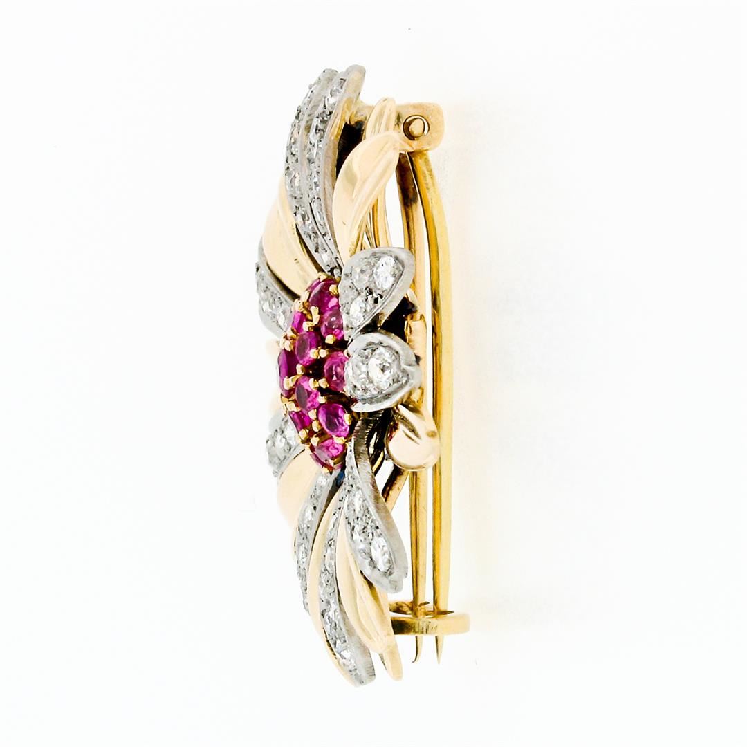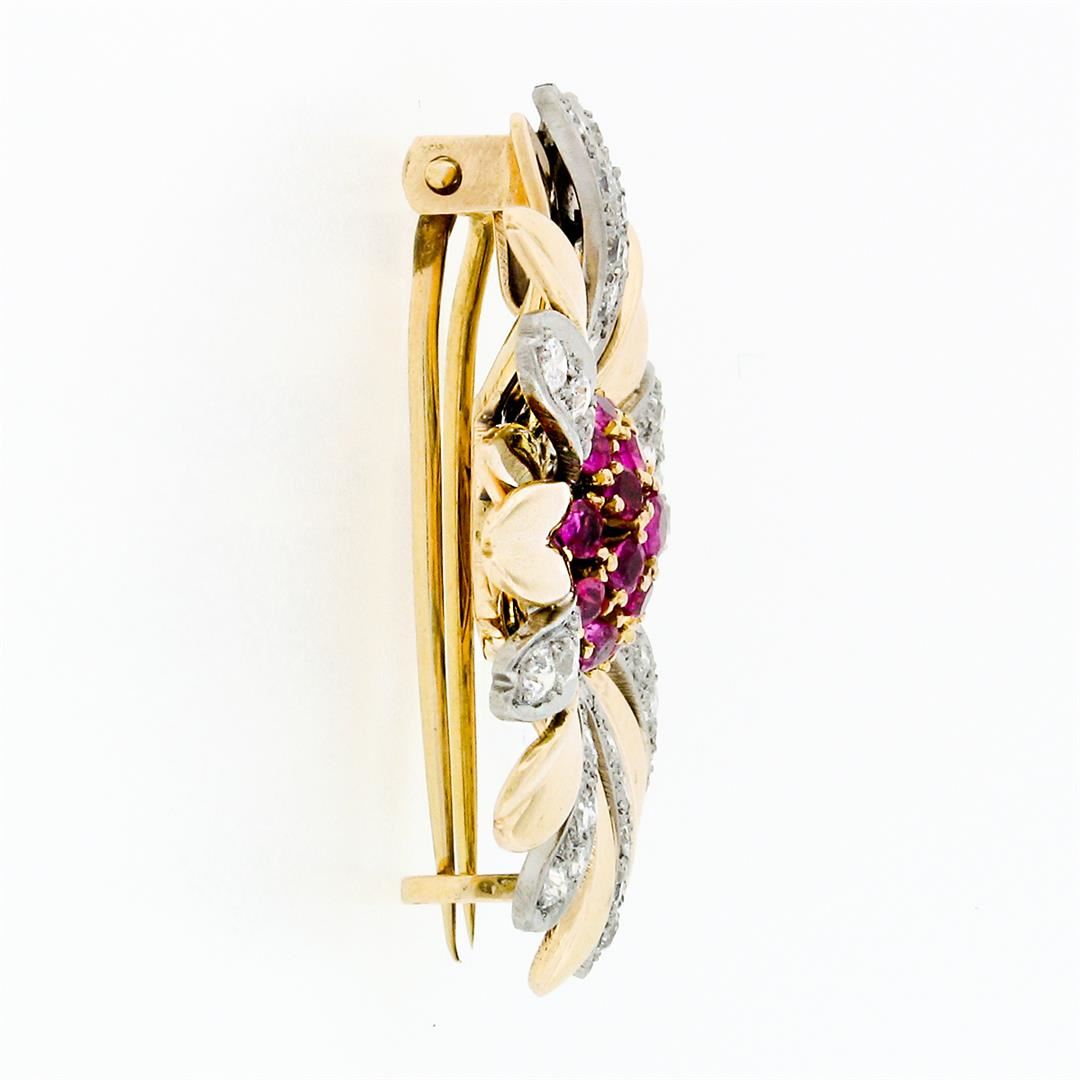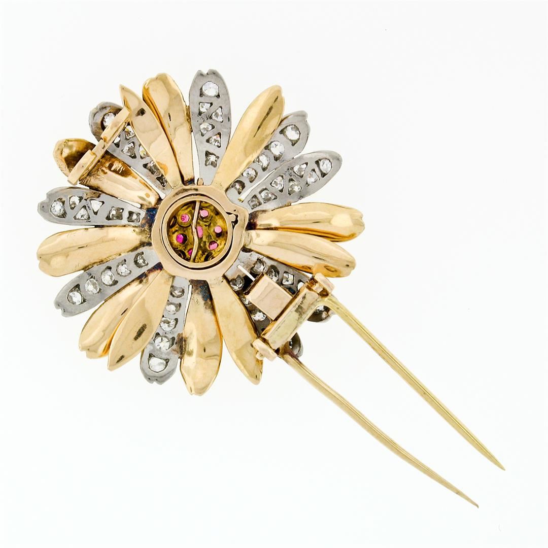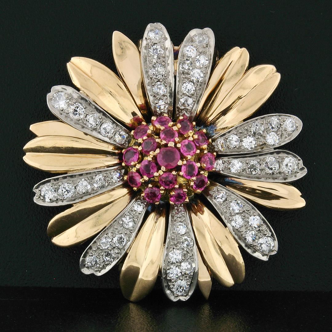 Vintage 14k Two Tone Gold Ruby Cluster & Diamond Layered Daisy Flower Brooch Pin