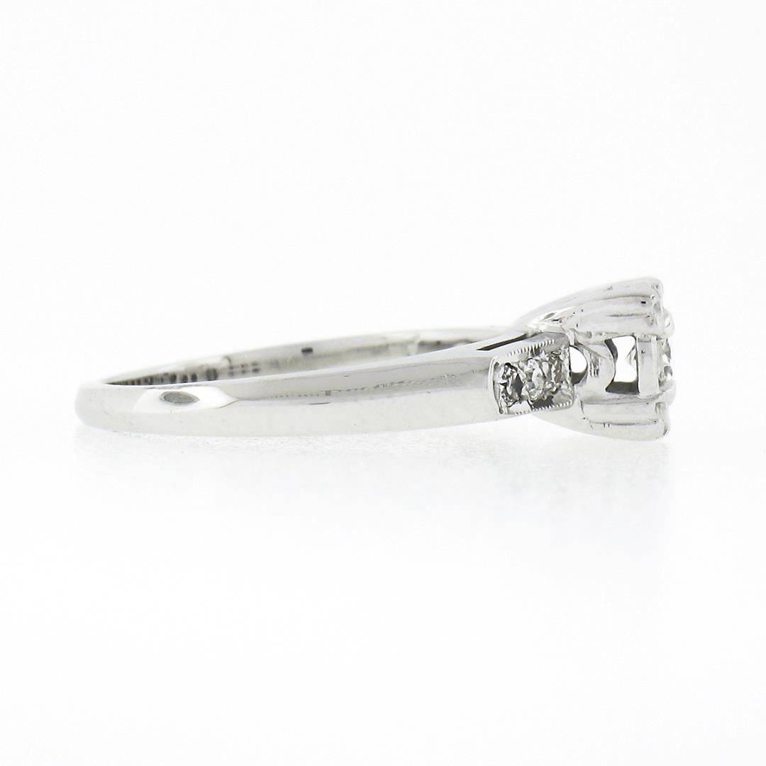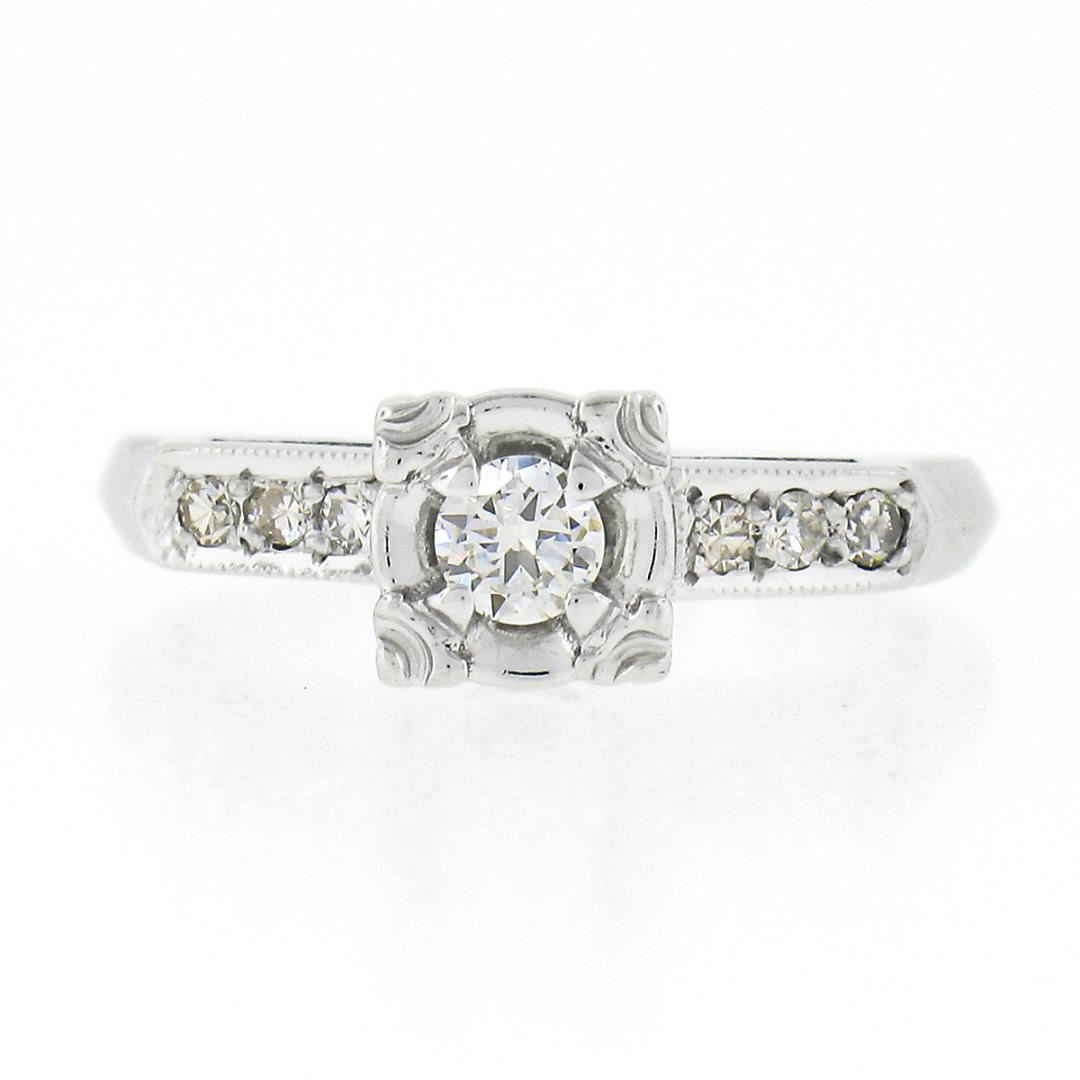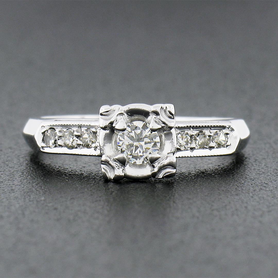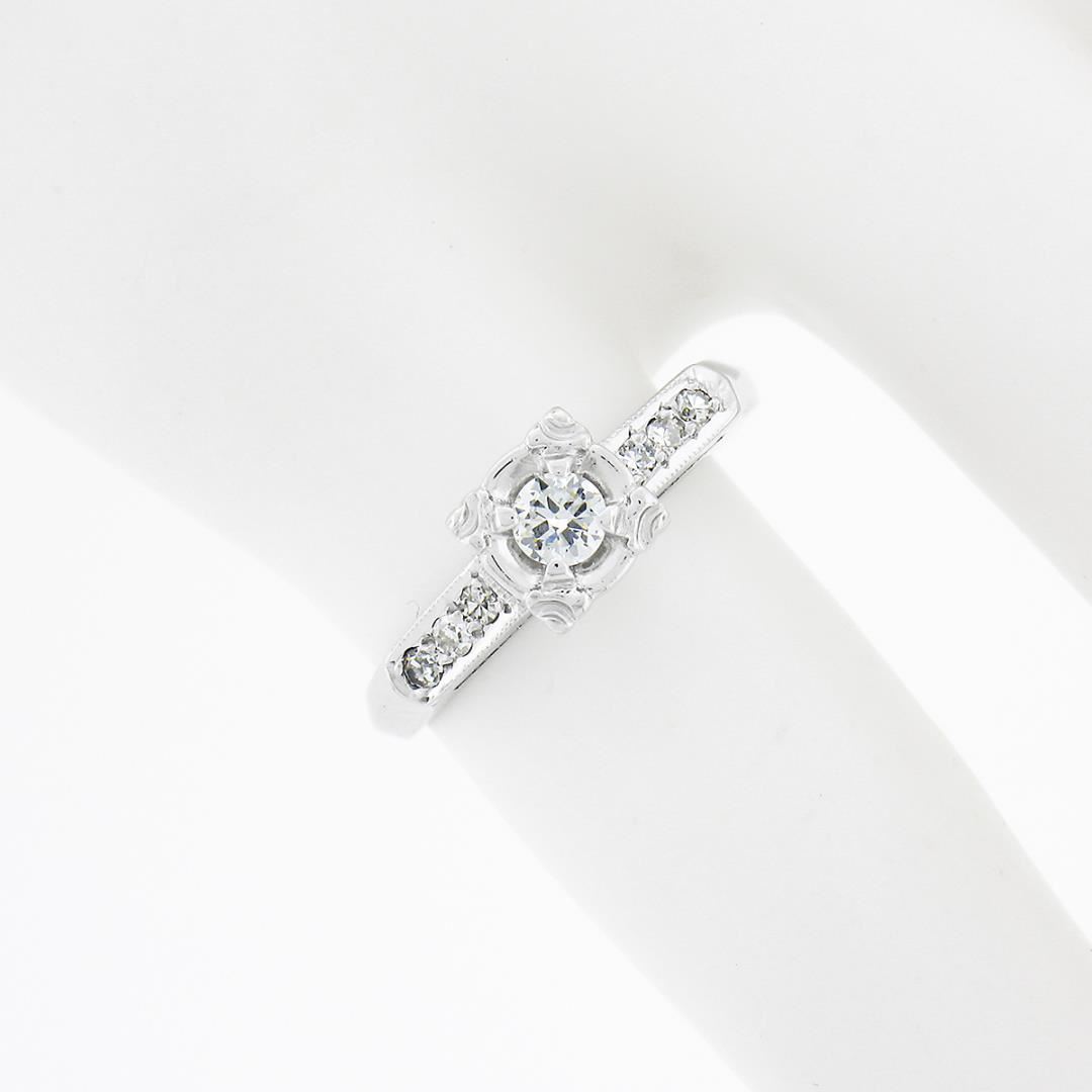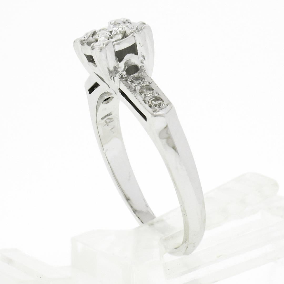 A vintage solid 14k white gld engagement ring, with 1 old transitional cut natural diamond (F - VS1 ; 0.14ct), and 6 old single cut natural diamonds (F/G - VS1/VS2 ; 0.10ctw). The ring is size 4.5, weighs a total of 2.58 grams, and measures 5.80mm wide.