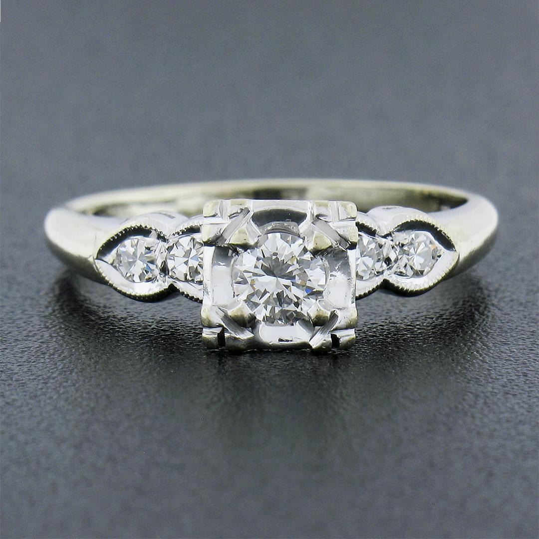 A vintage solid 14k white gold engagement ring, with 1 round cut natural diamond (F - VS1 ; 0.23ct), accented with 4 old single cut natural diamonds (E/F - VS1/VS2 ; 0.12ctw). The ring is size 8.0, weighs a total of 2.59 grams, and measures 6.5mm wide.