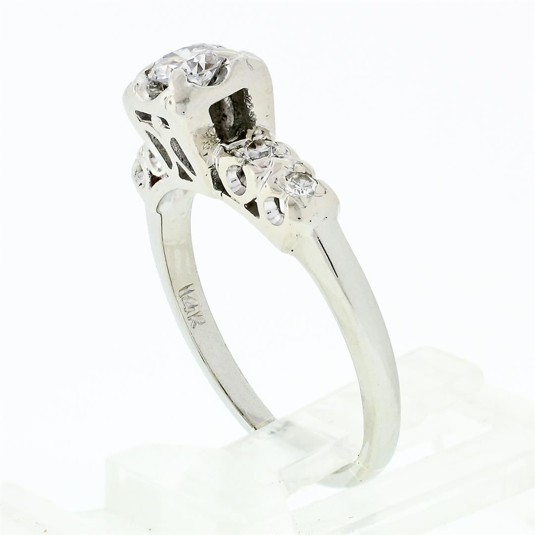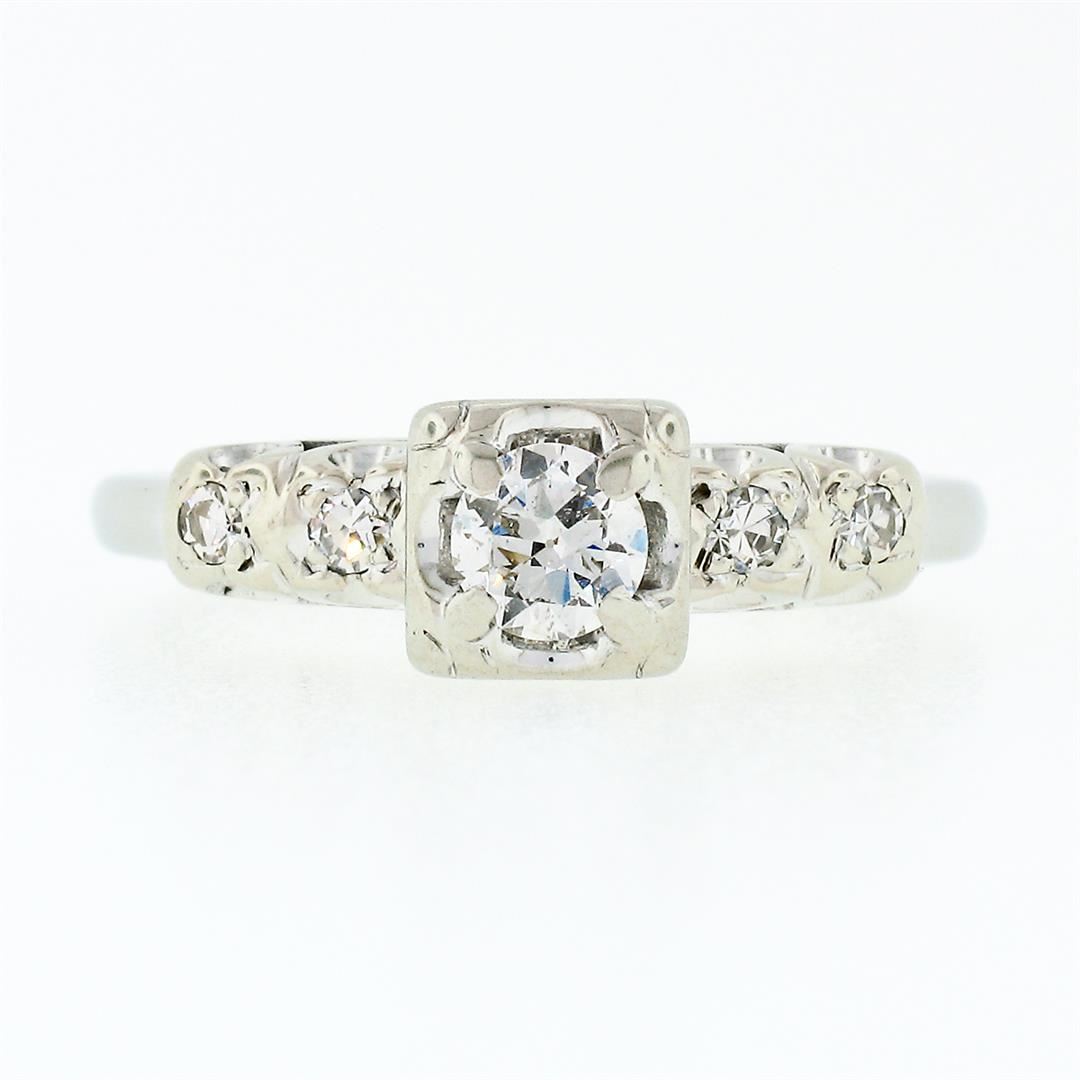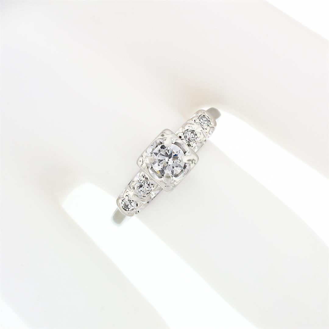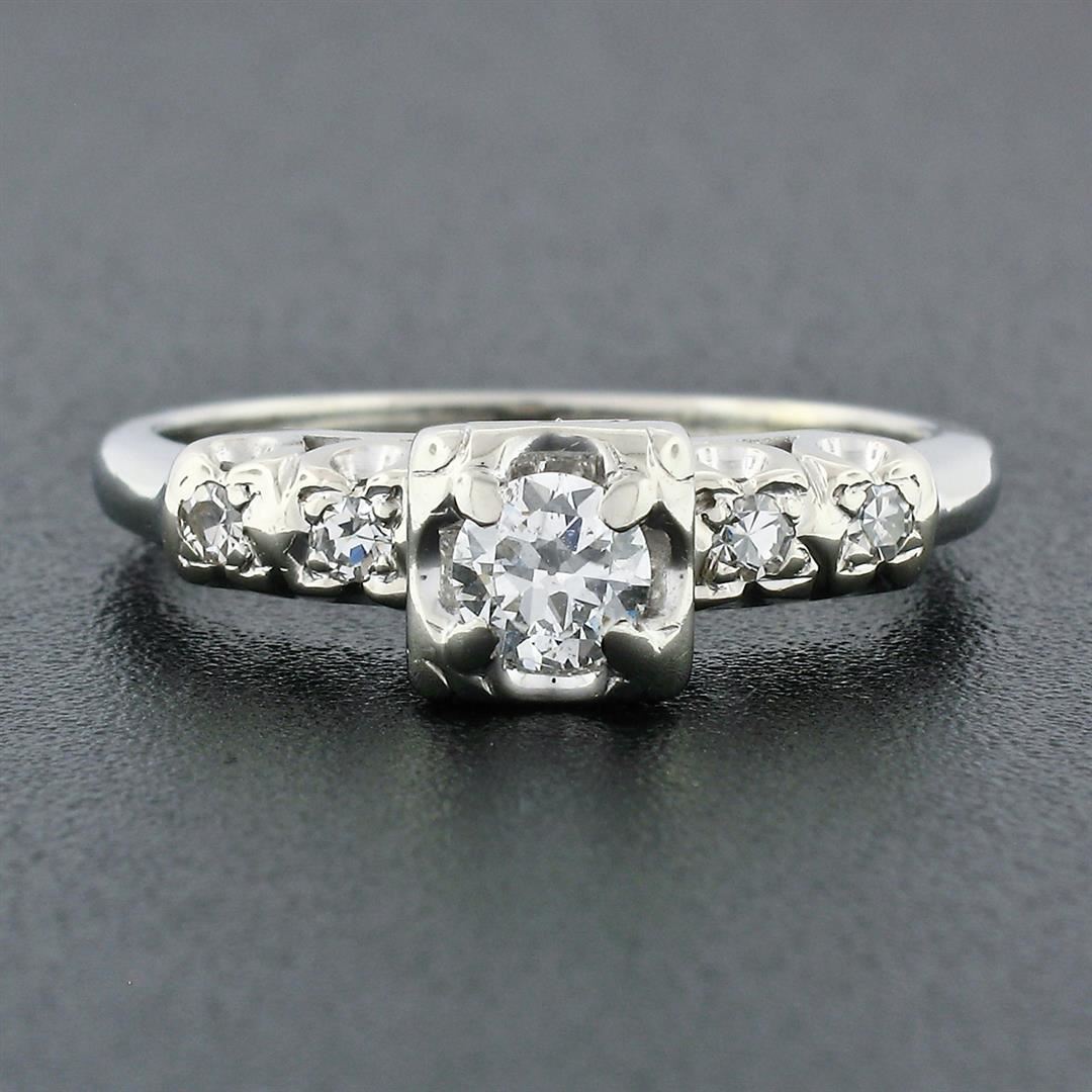 A vintage solid 14k white gold ring with 1 round transitional cut natural diamond (G - VS2; 0.27ct) and 4 round single cut natural diamonds (G/H - VS2; 0.10ctw). The ring is size 6.0, weighs a total of 2.90 grams, and measures 5.90mm wide.