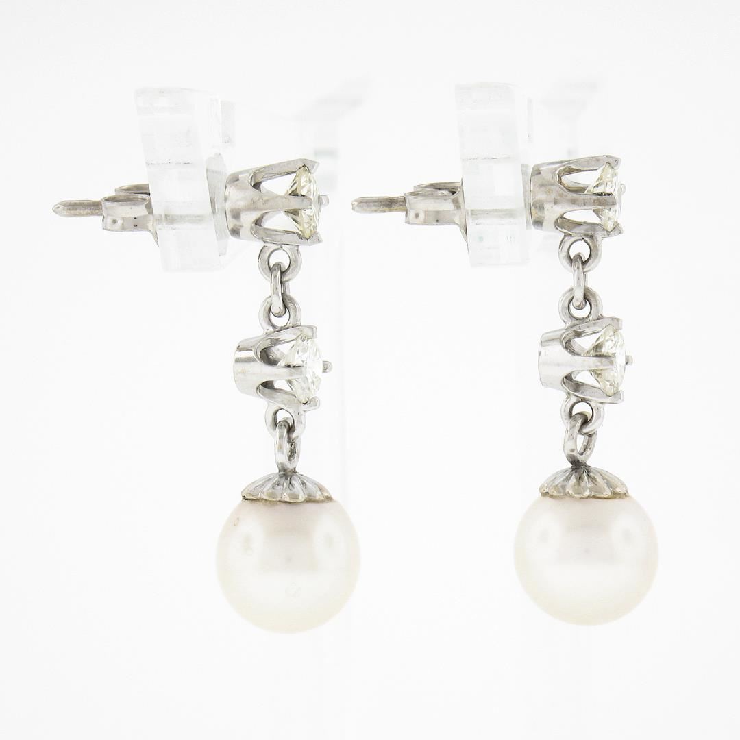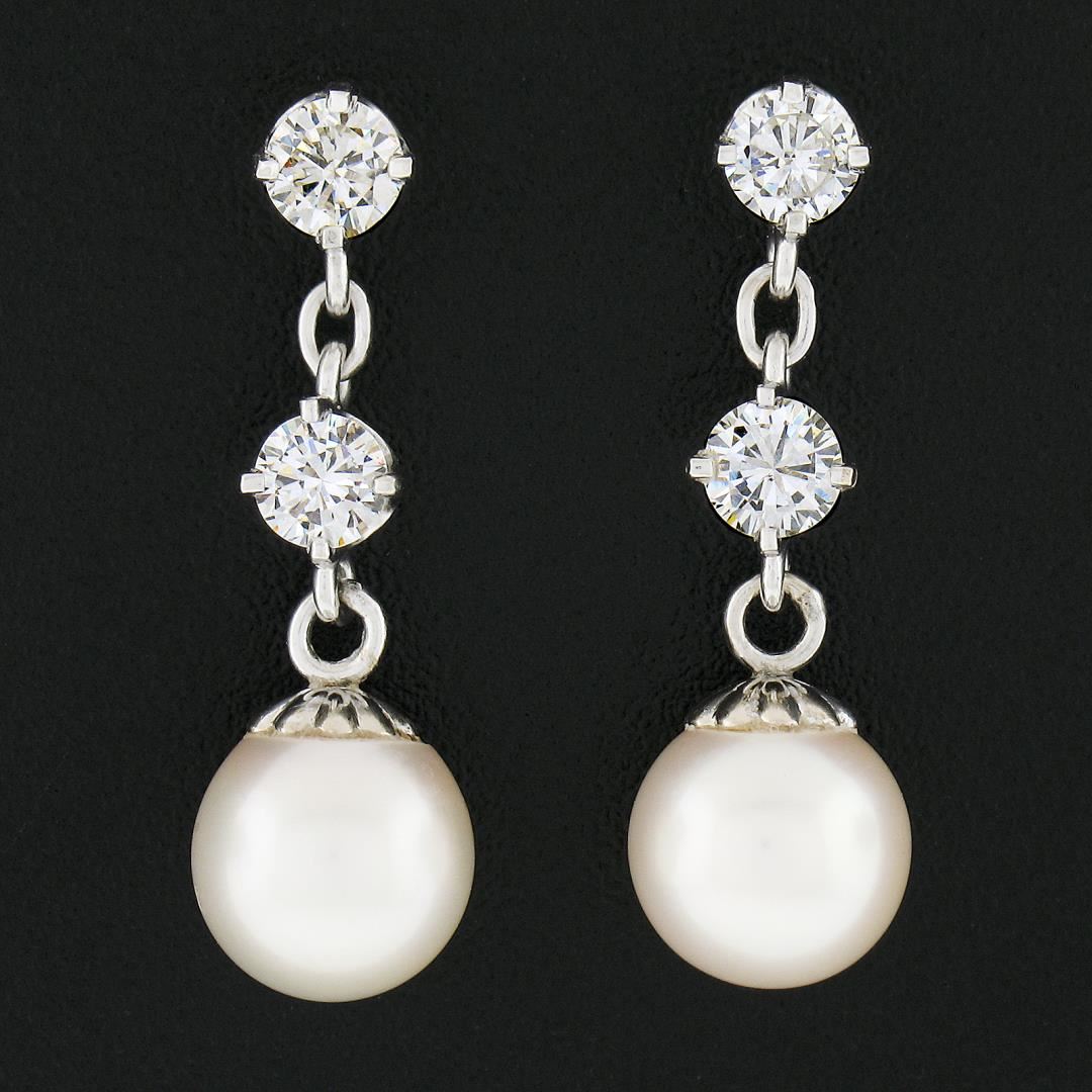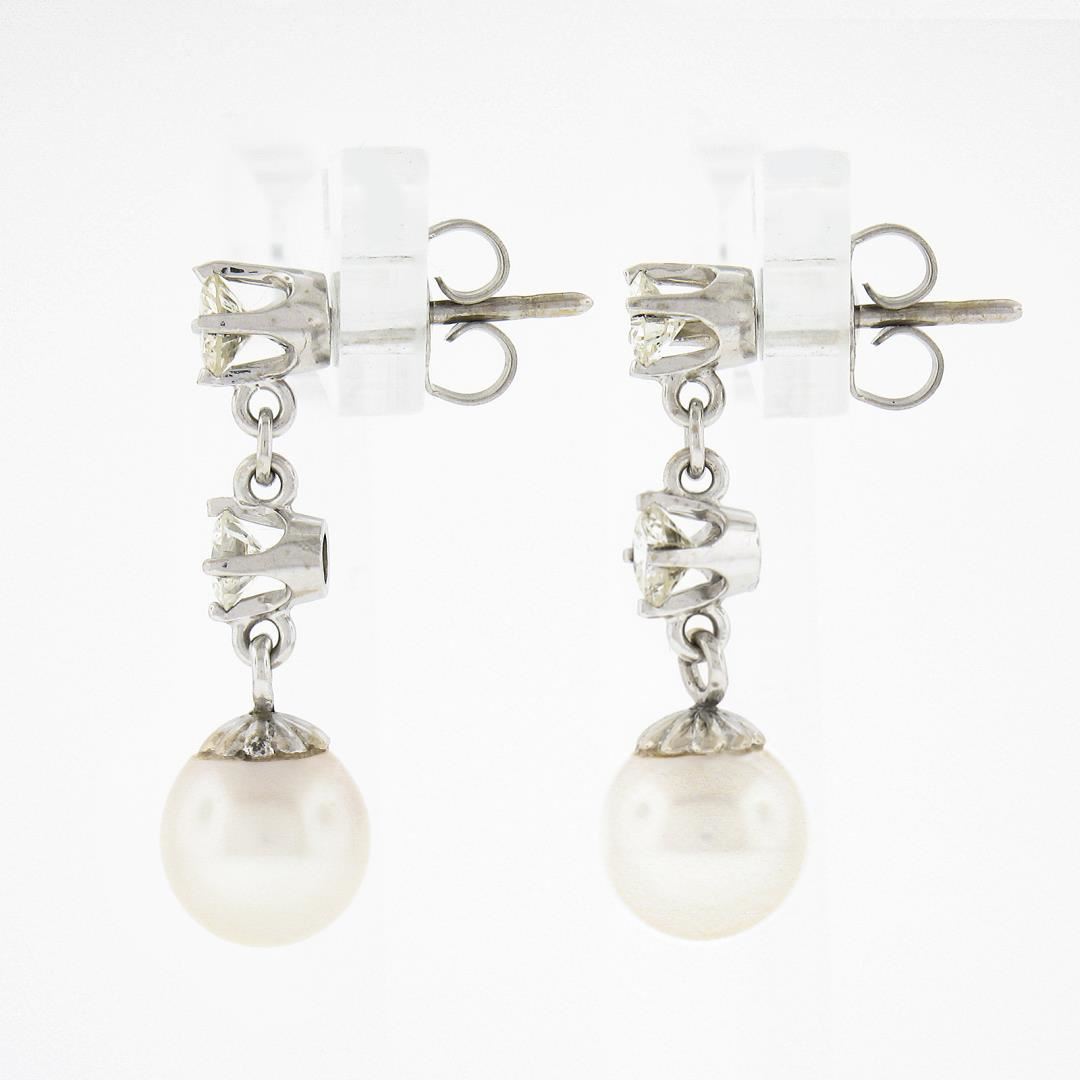 A vintage solid 14k white gold drop dangle earrings, featuring 4 round brilliant cut natural diamonds (H/I - VS1/VS2 ; 0.72ctw) and 2 rounds shape cultured pearls (7.5mm each). The earrings measure approximately 24.20x7.5mm and weigh a total of 2.83 grams.