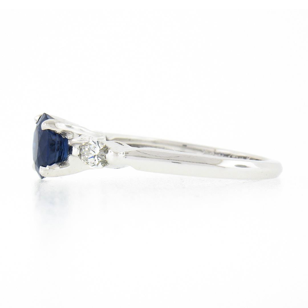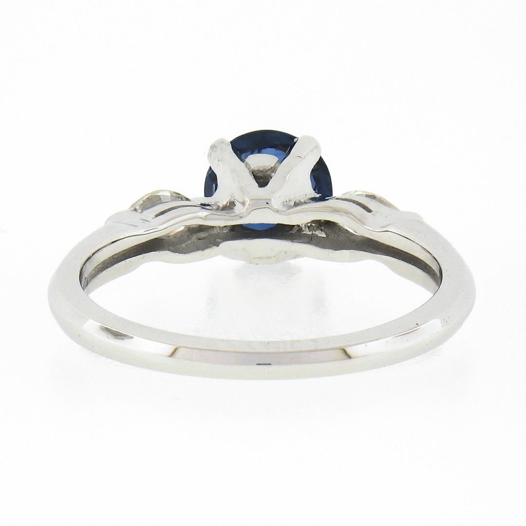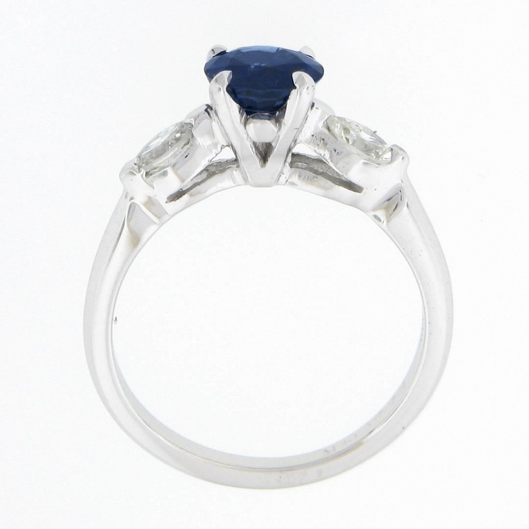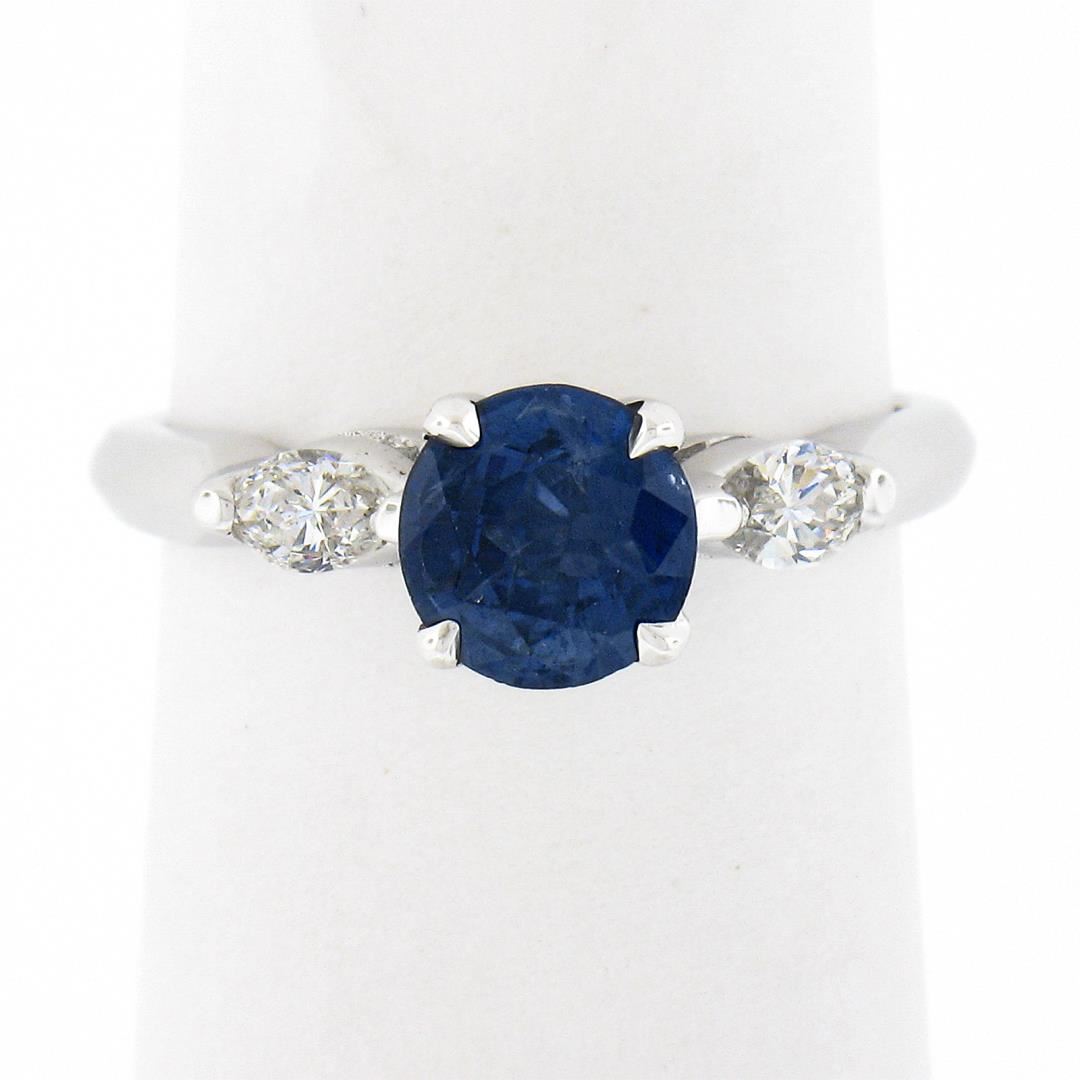 A vintage solid 14k white gold ring, with 1 GIA certified round brilliant cut natural sapphire (0.98ct ), and 2 marquise cut natural diamonds (G/H - VS1/VS2 ; 0.30ctw). The ring is size 4.5, weighs a total of 2.45 grams, and measures 6.12mm wide. Comes with all original relevant certifications.