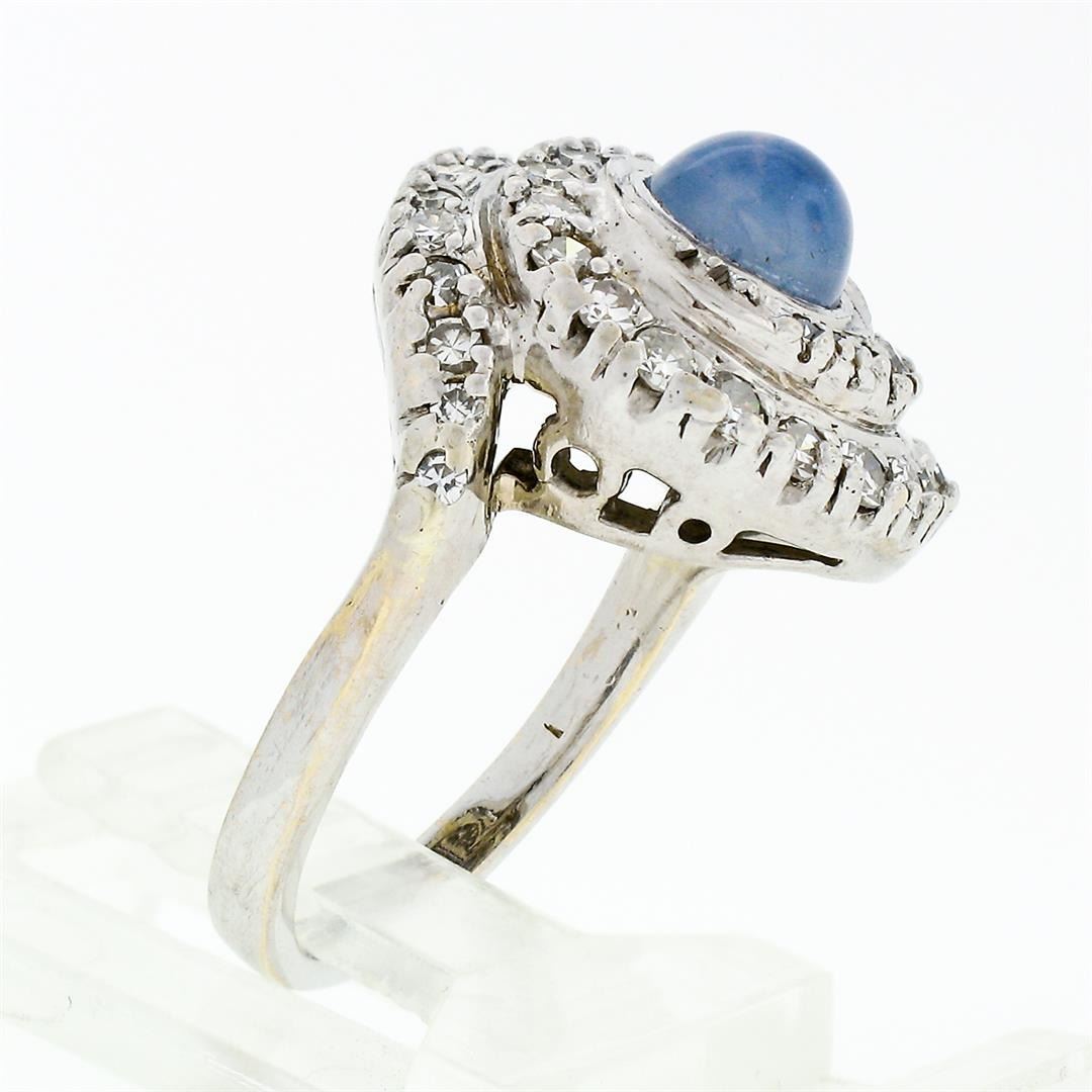 A solid 14k white gold swirl ring, with 1 oval cabochon cut natural star sapphire (5.5x6.0mm ; 1.54ct ), surrounded with a halo of 38 round single cut natural diamonds (G/H - VS1/VS2 ; 0.75ctw ). The ring is size 4.25, weighs a total of 5.00 grams, and measures 14.93mm wide.