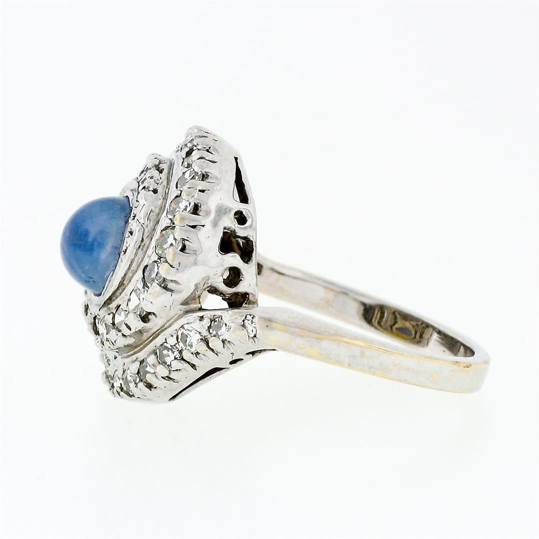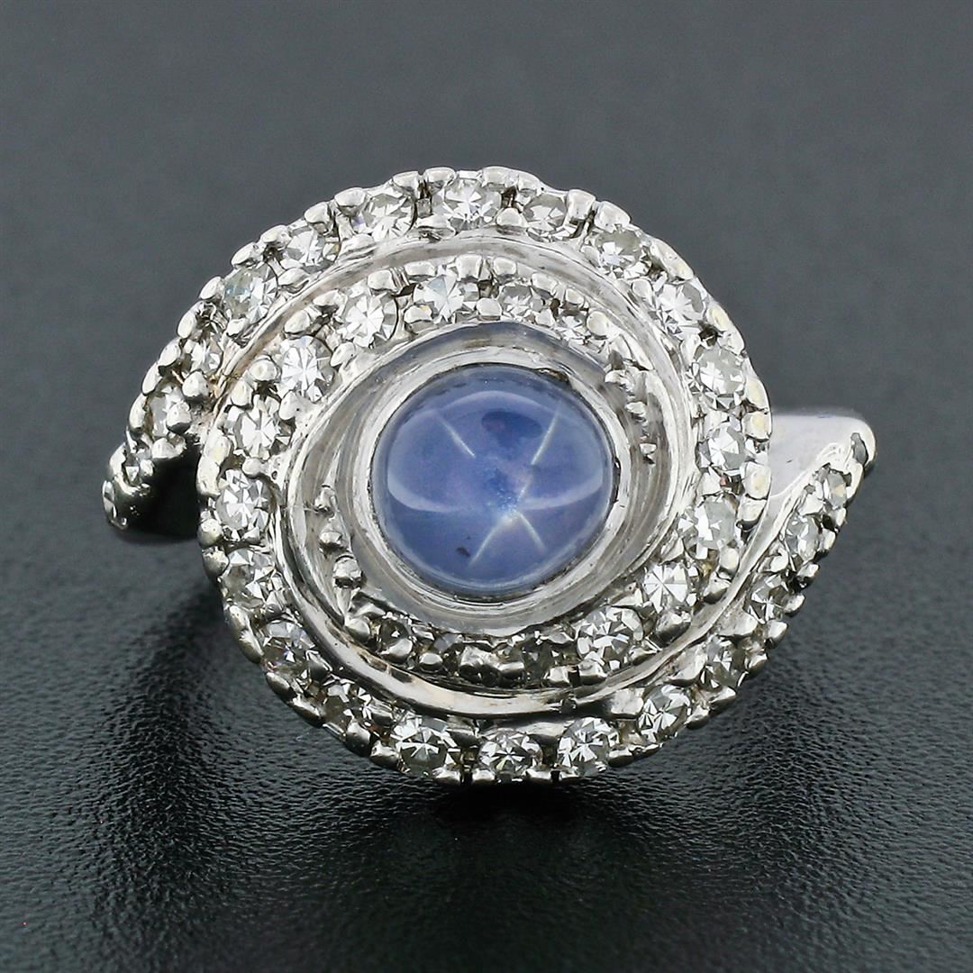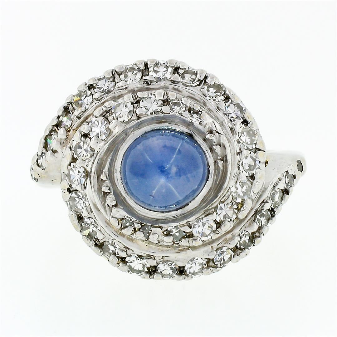 A solid 14k white gold swirl ring, with 1 oval cabochon cut natural star sapphire (5.5x6.0mm ; 1.54ct ), surrounded with a halo of 38 round single cut natural diamonds (G/H - VS1/VS2 ; 0.75ctw ). The ring is size 4.25, weighs a total of 5.00 grams, and measures 14.93mm wide.