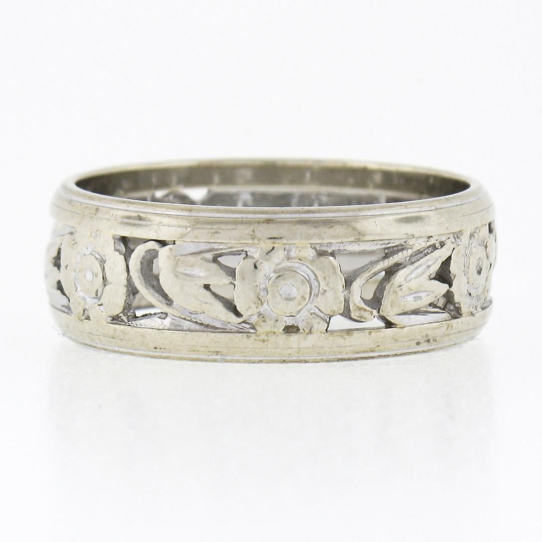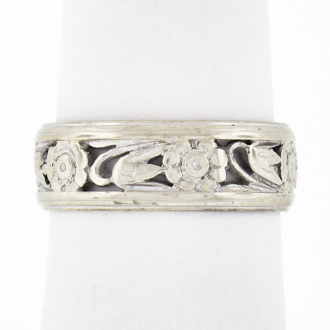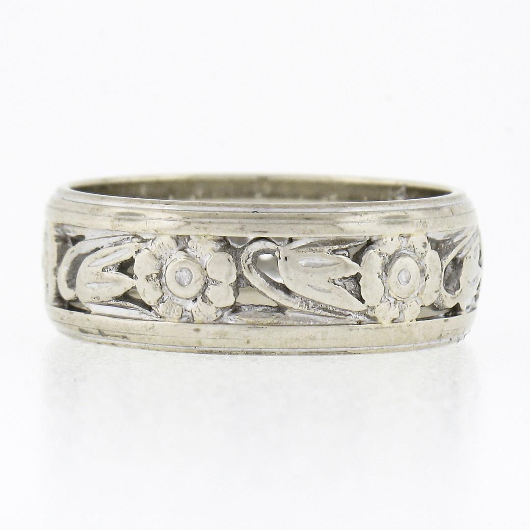 A vintage solid 14k white gold floral etetnity band ring. The ring is size 5.5, weighs a total of 3.14 grams, and measures 6.3mm wide.