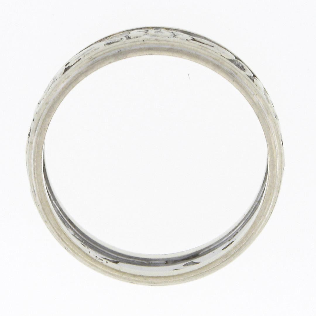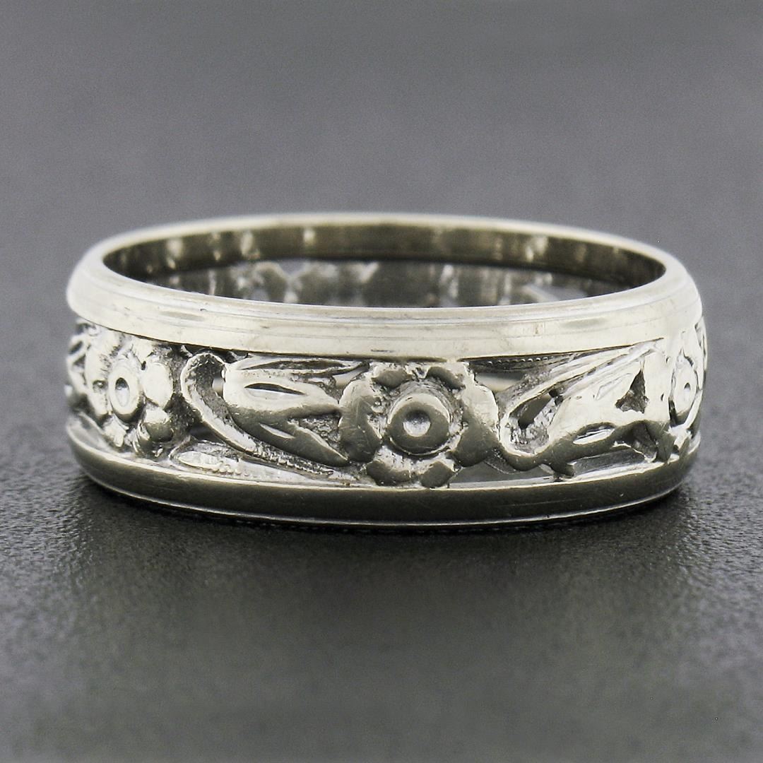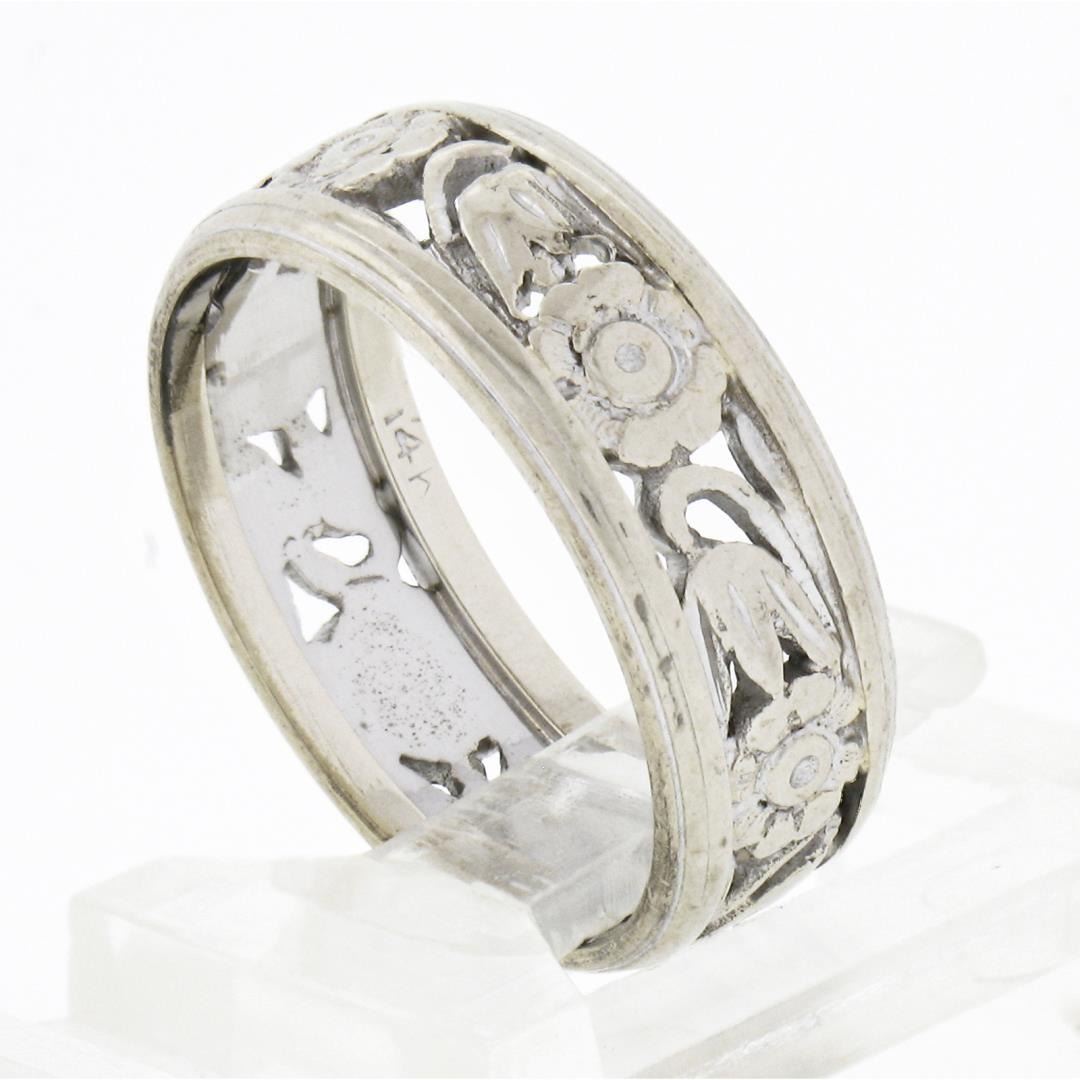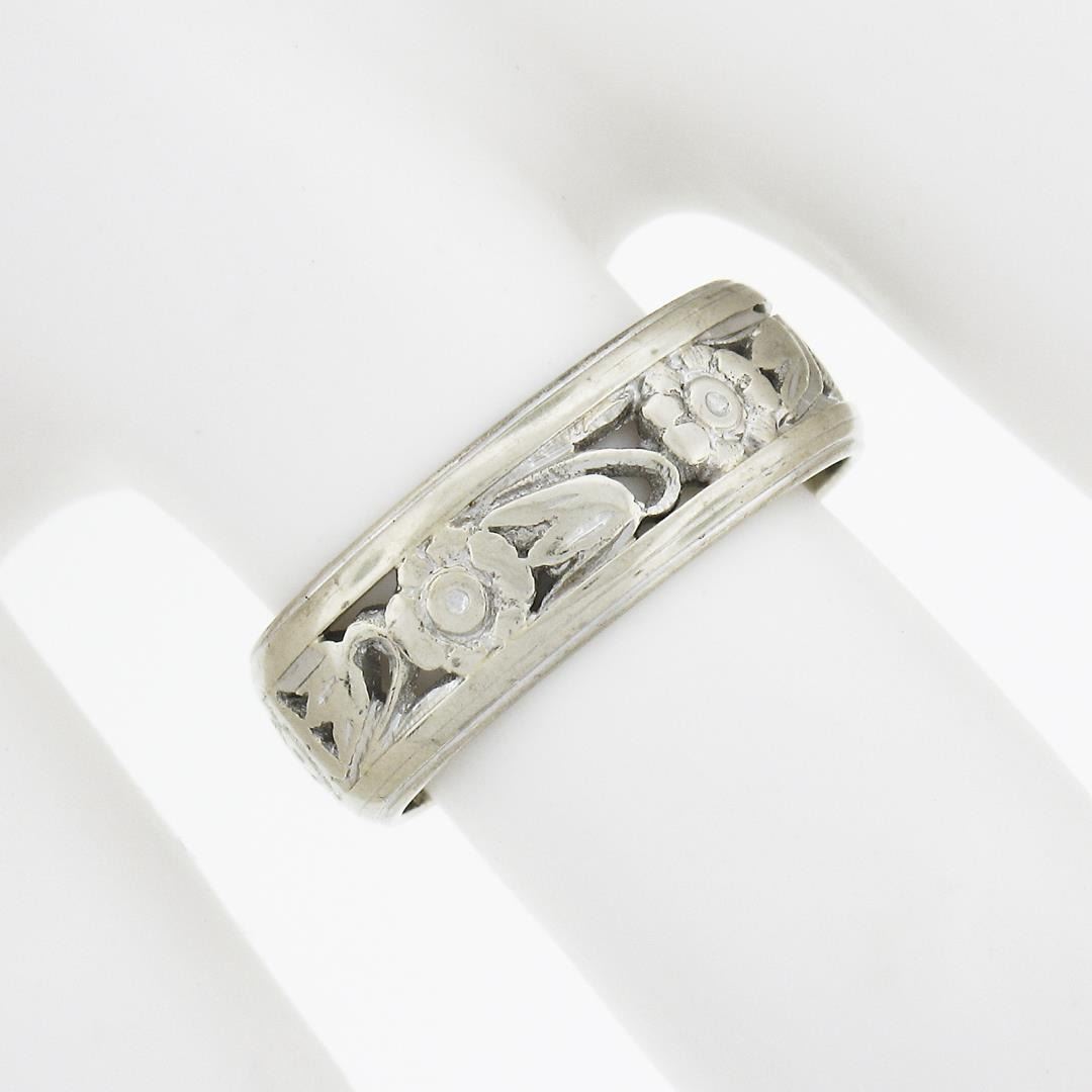 A vintage solid 14k white gold floral etetnity band ring. The ring is size 5.5, weighs a total of 3.14 grams, and measures 6.3mm wide.