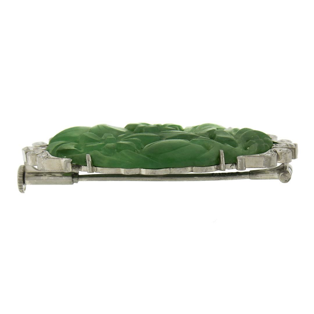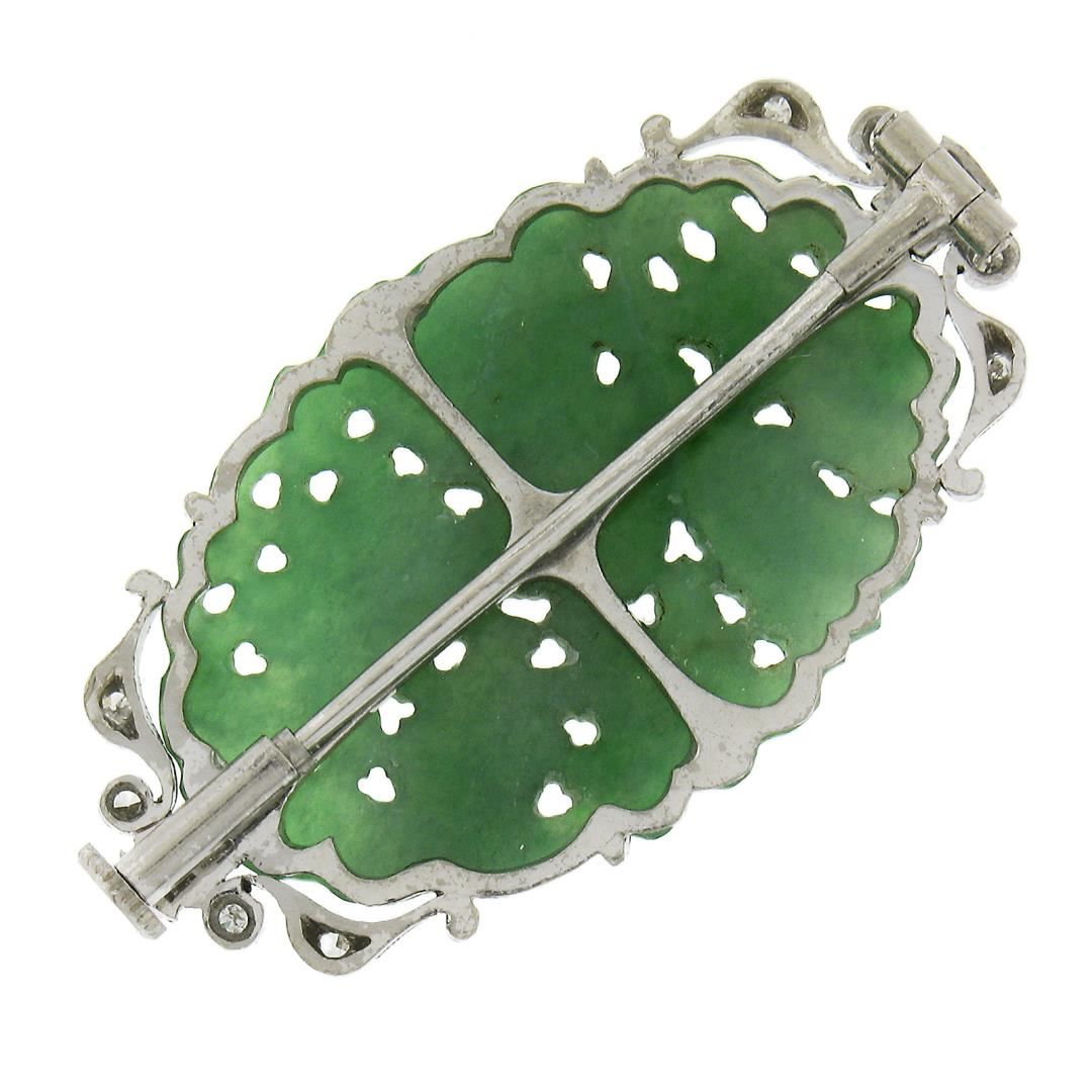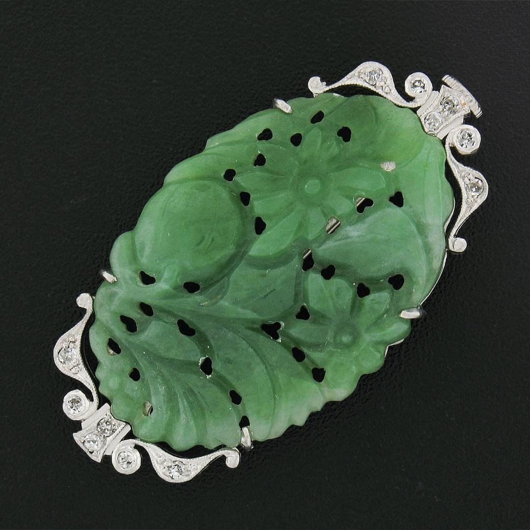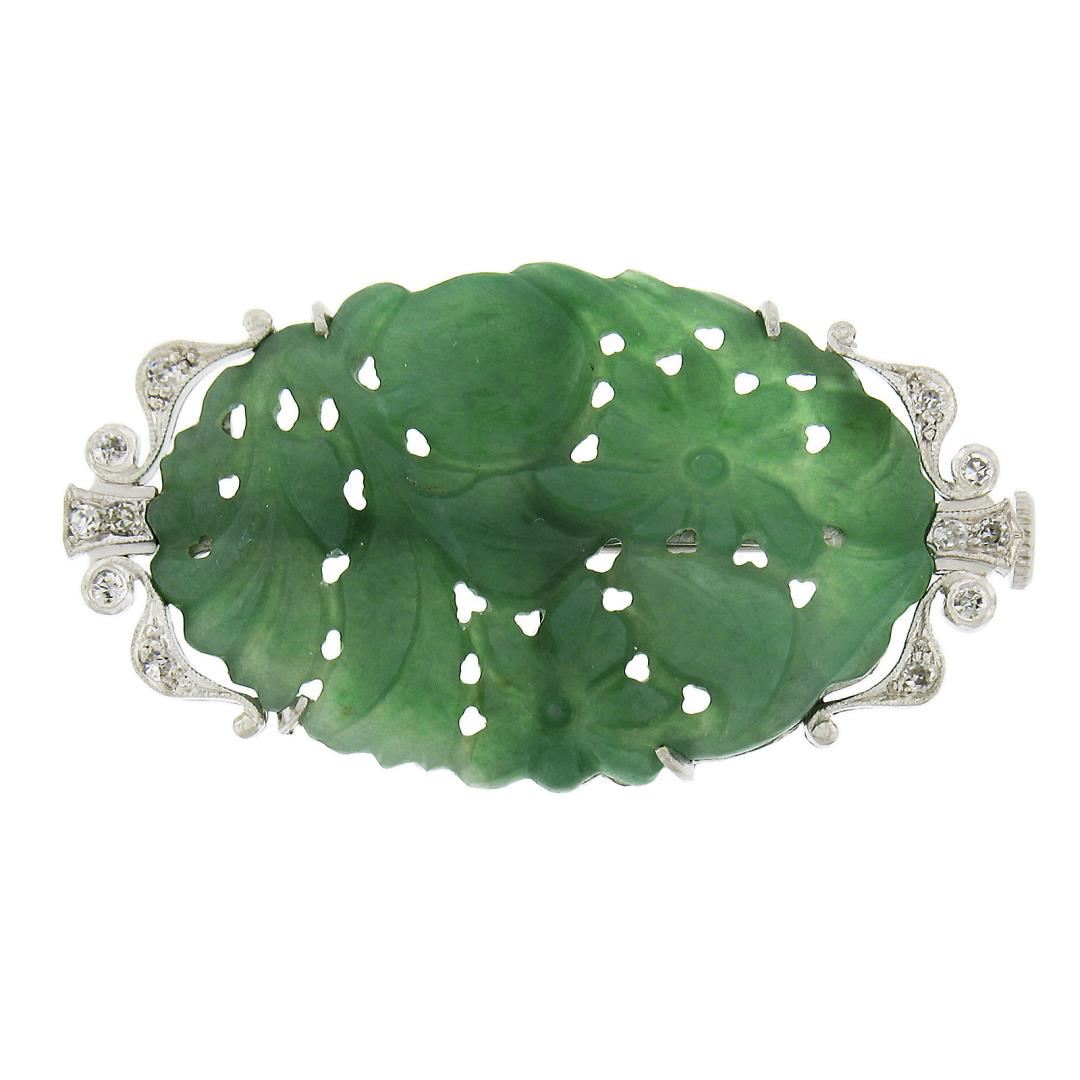 A vintage solid 14k white gold brooch, with 1 oval shaped carved natural jade, and 12 old single cut natural diamonds (0.10ctw). Measures 21.1x37.9mm and weighs a total of 7.08 grams.