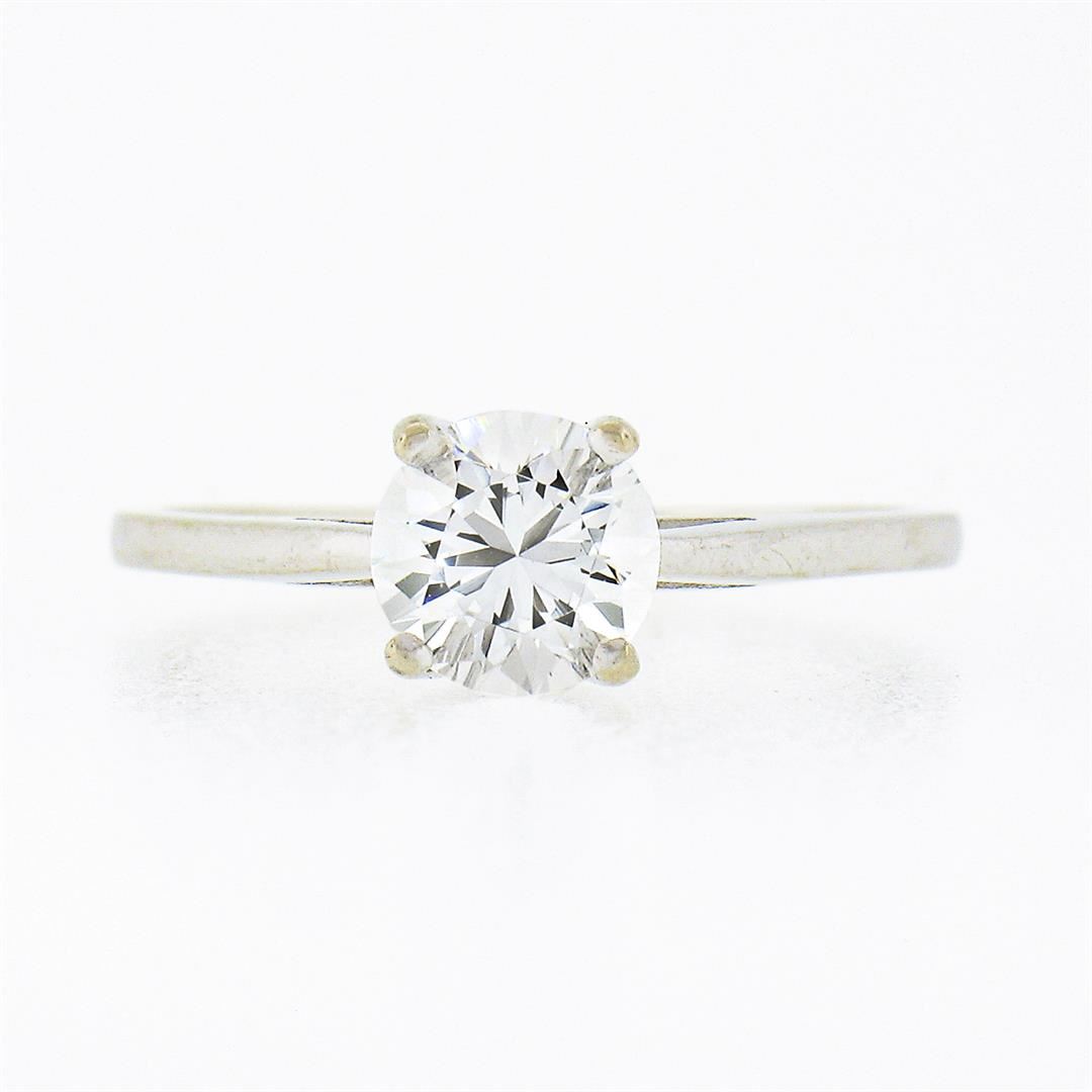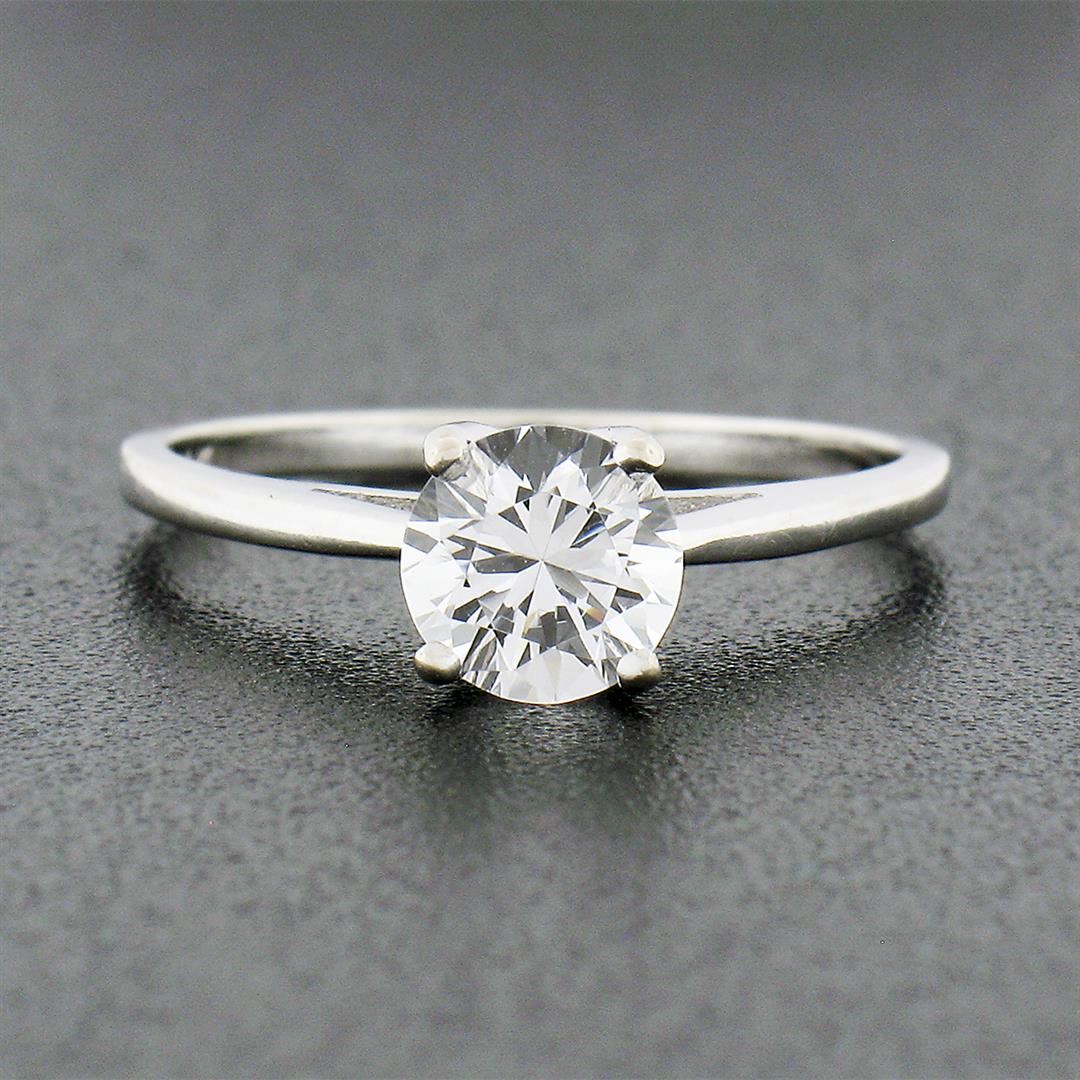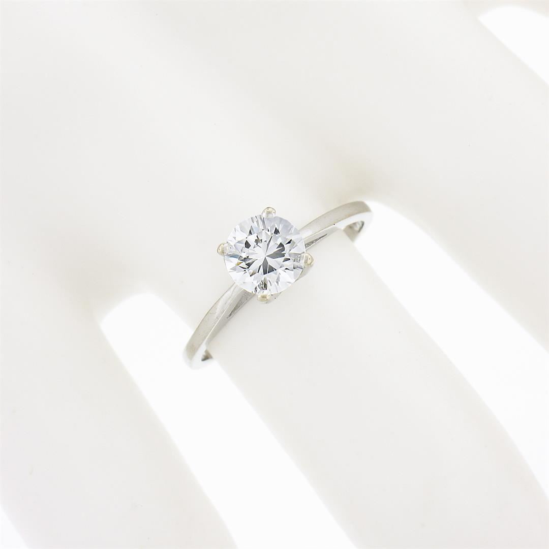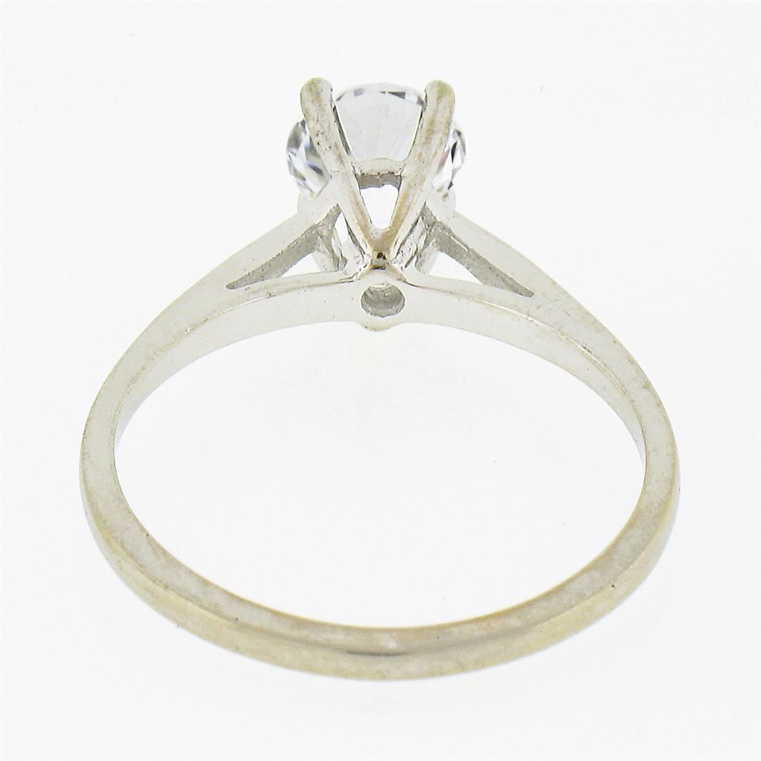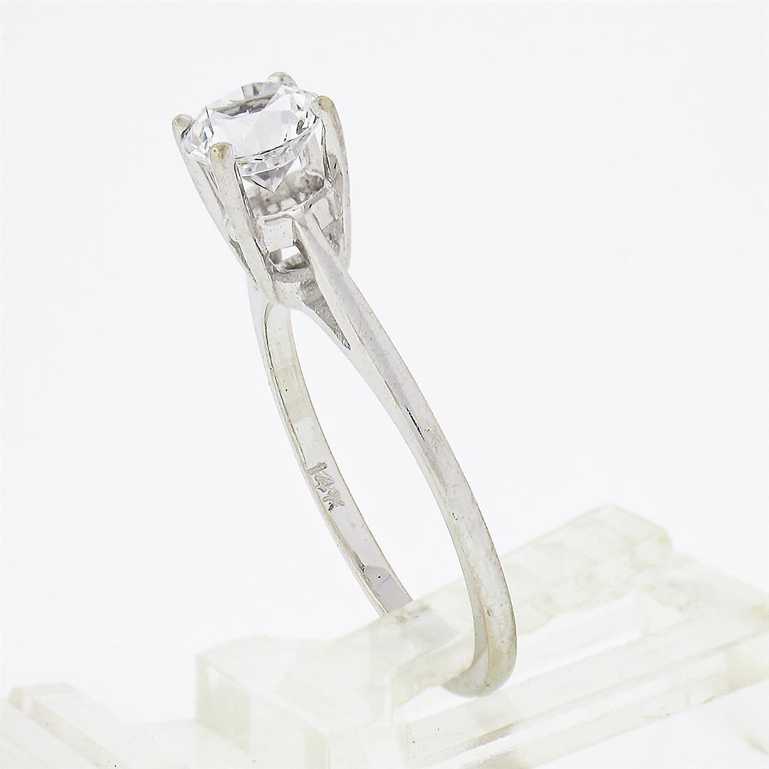 A vintage solid 14k white gold solitaire ring, with 1 round brilliant cut cubic zirconia (5.7mm). The ring is size 5.5, weighs a total of 1.80 grams, and measures 5.7mm wide.