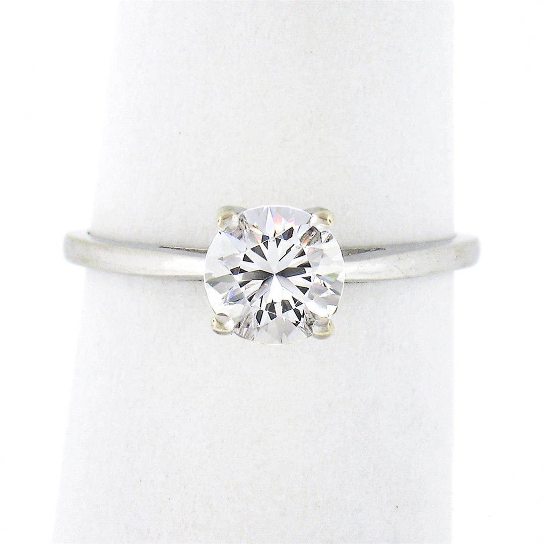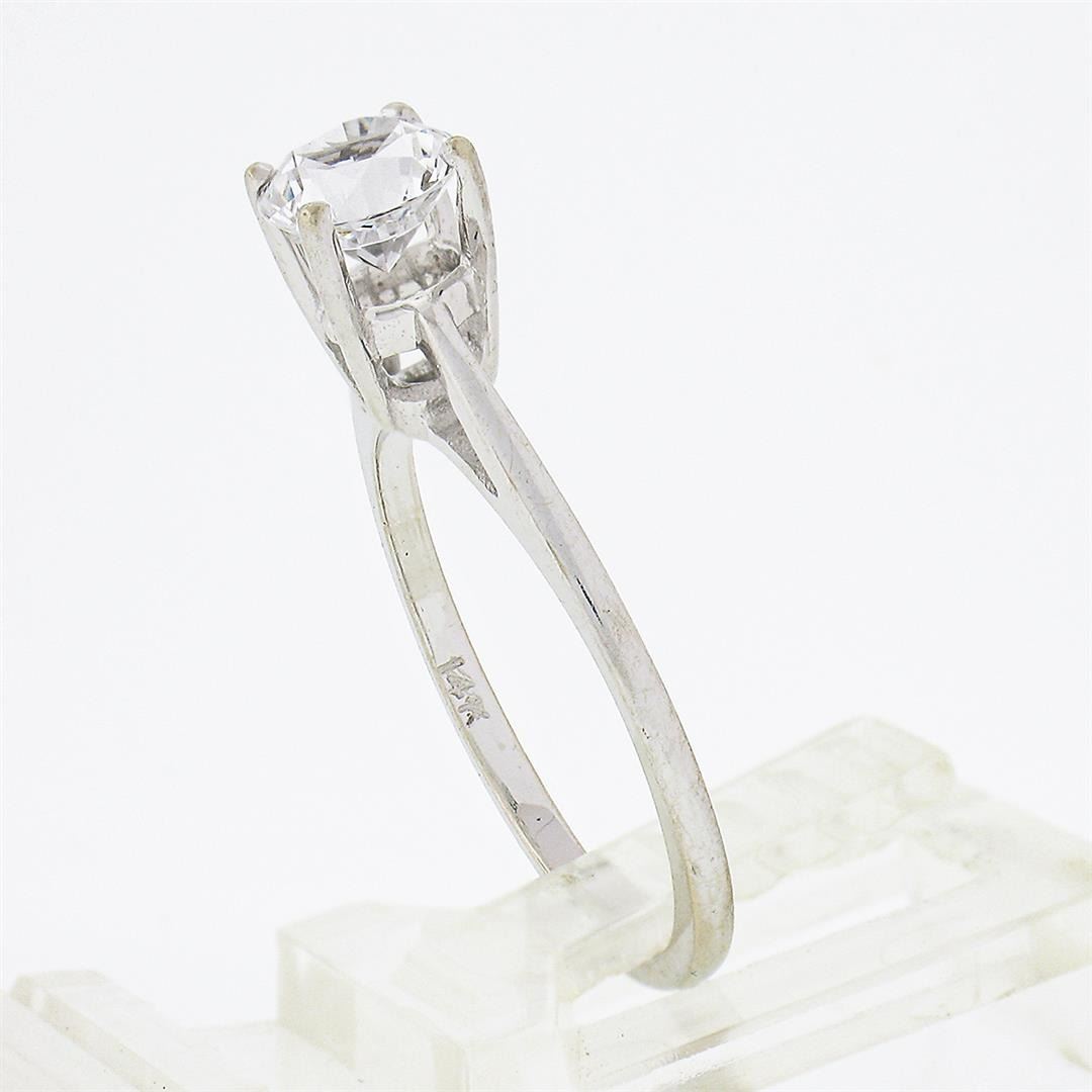 A vintage solid 14k white gold solitaire ring, with 1 round brilliant cut cubic zirconia (5.7mm). The ring is size 5.5, weighs a total of 1.80 grams, and measures 5.7mm wide.