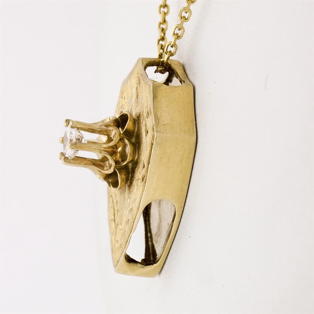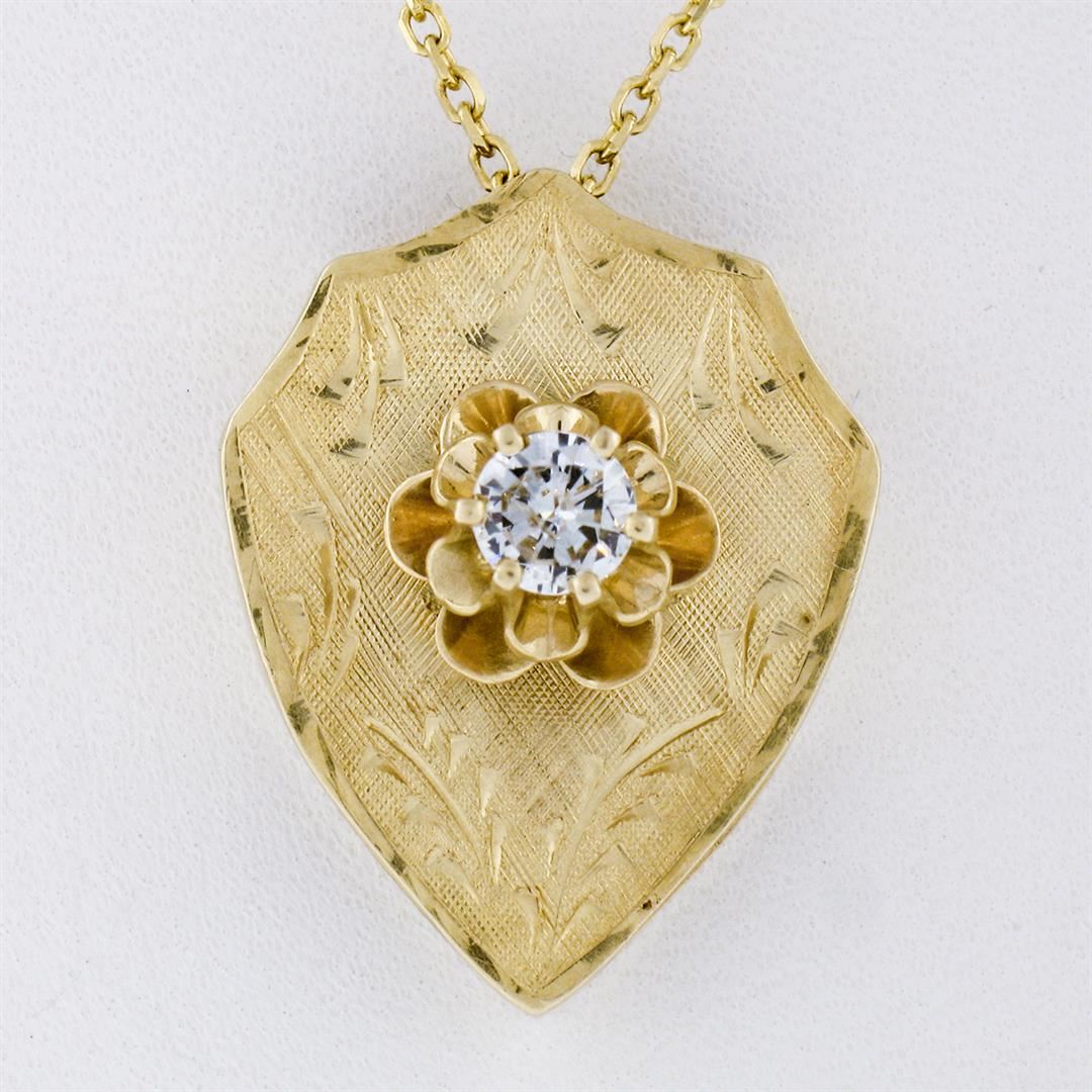 A vintage 14k yellow gold necklace featuring a hand-etched reversible shield pendant that is topped with a 0.40ct round transitional cut diamond (F - SI1) 6-prong set above a dual flower motif. 18 inch cable link chain, 7.76 grams total weight, pendant measures 12.15x9.50mm.