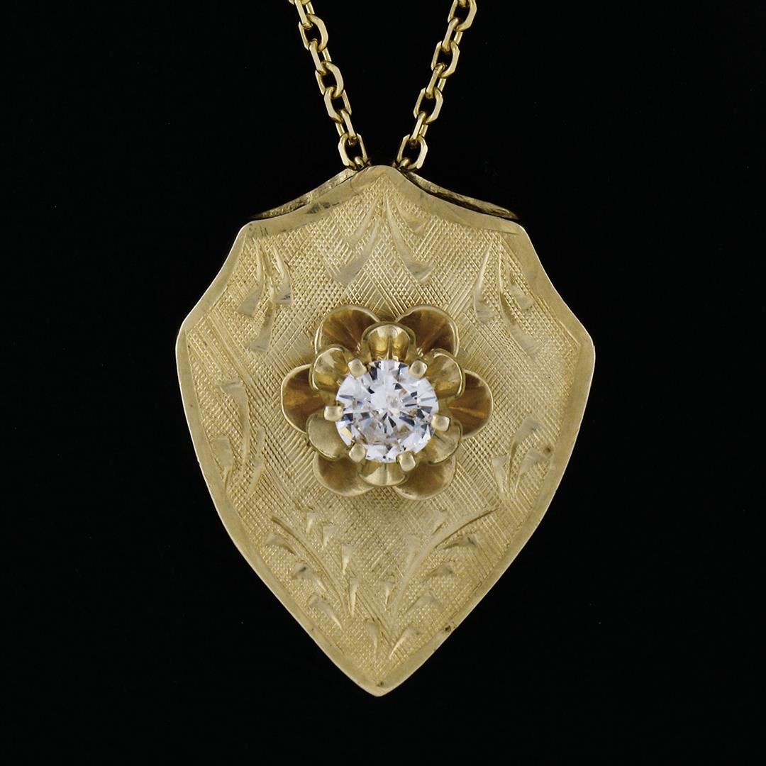 A vintage 14k yellow gold necklace featuring a hand-etched reversible shield pendant that is topped with a 0.40ct round transitional cut diamond (F - SI1) 6-prong set above a dual flower motif. 18 inch cable link chain, 7.76 grams total weight, pendant measures 12.15x9.50mm.