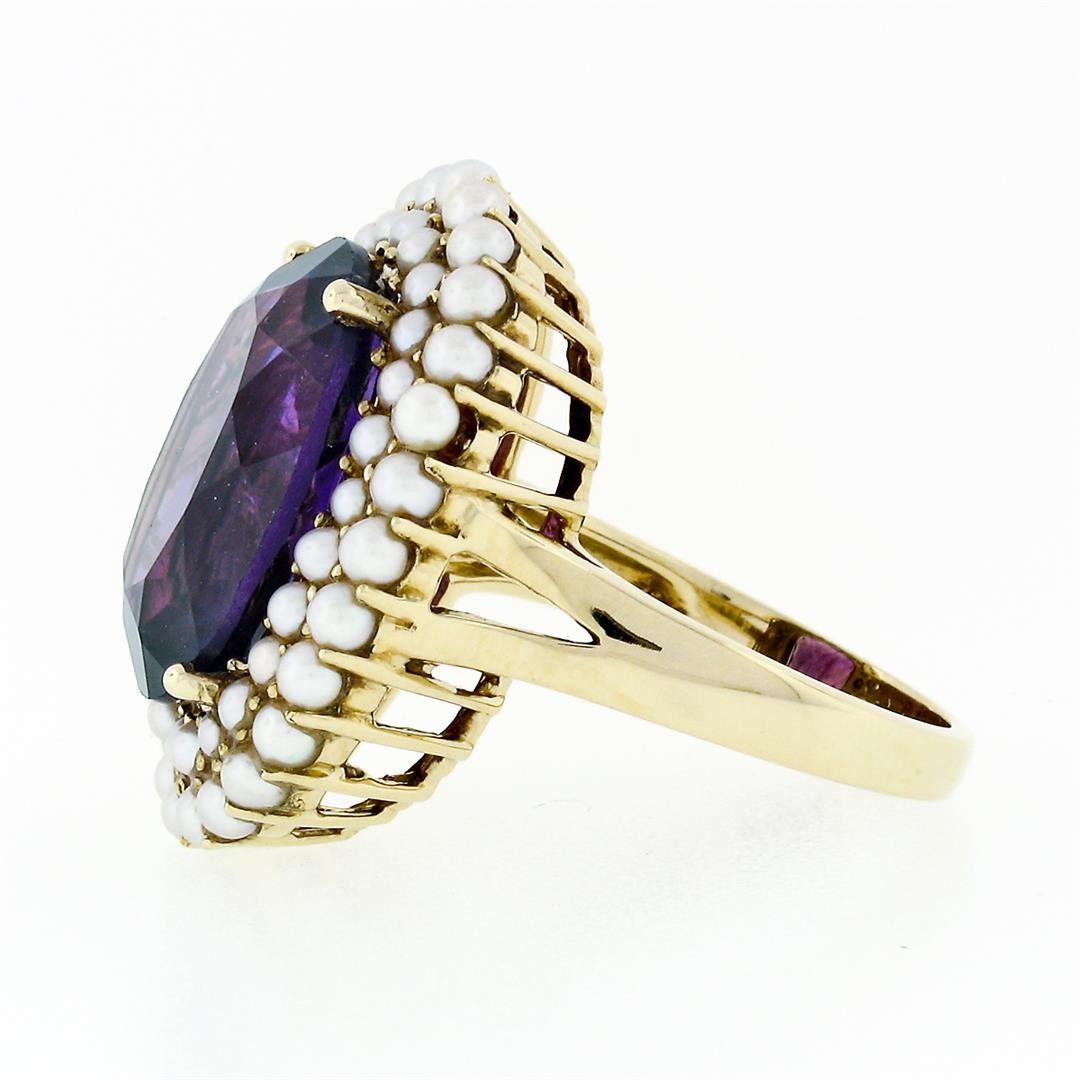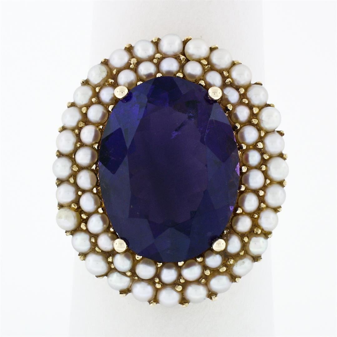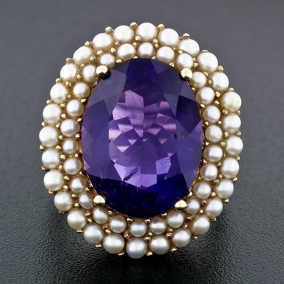 A vintage solid 14k yellow gold ring, with 1 oval cut natural amethyst (15.95x12.05mm - 7.13ct), surrounded with a halo of round shape natural seed pearls (1.75 and 2.25mm). The ring is size 7.0, weighs a total of 9.84 grams, and measures 23.81mm wide.