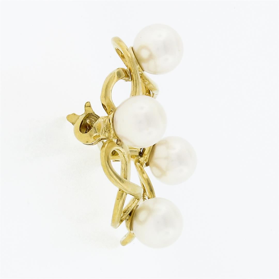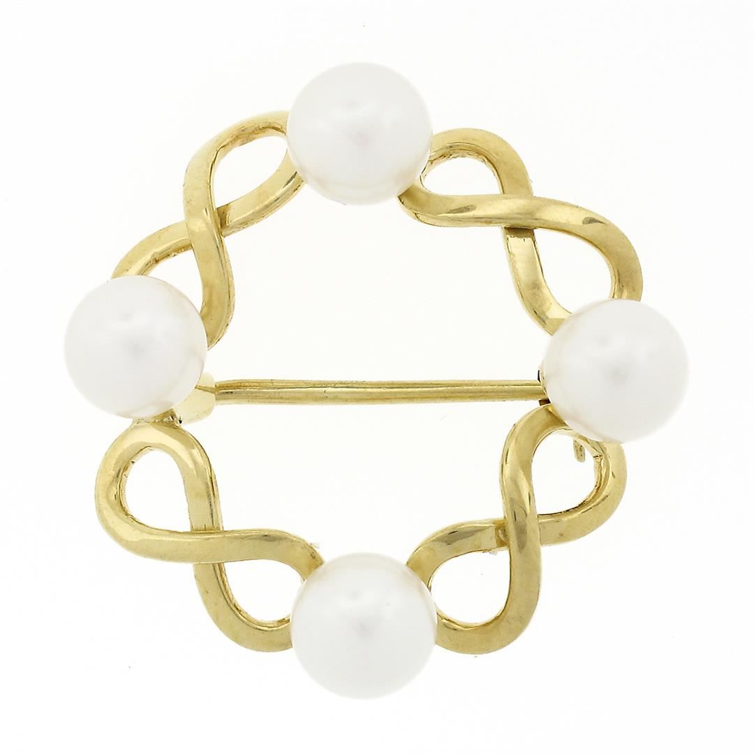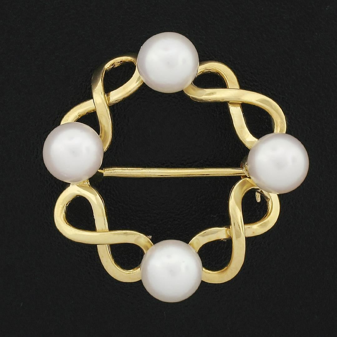 A vintage solid 14k yellow gold wreath infinity pin brooch, with 4 round shape cultured pearls (5.9mm each). Measures 25.90x25.30mm and weighs a total of 3.60 grams.