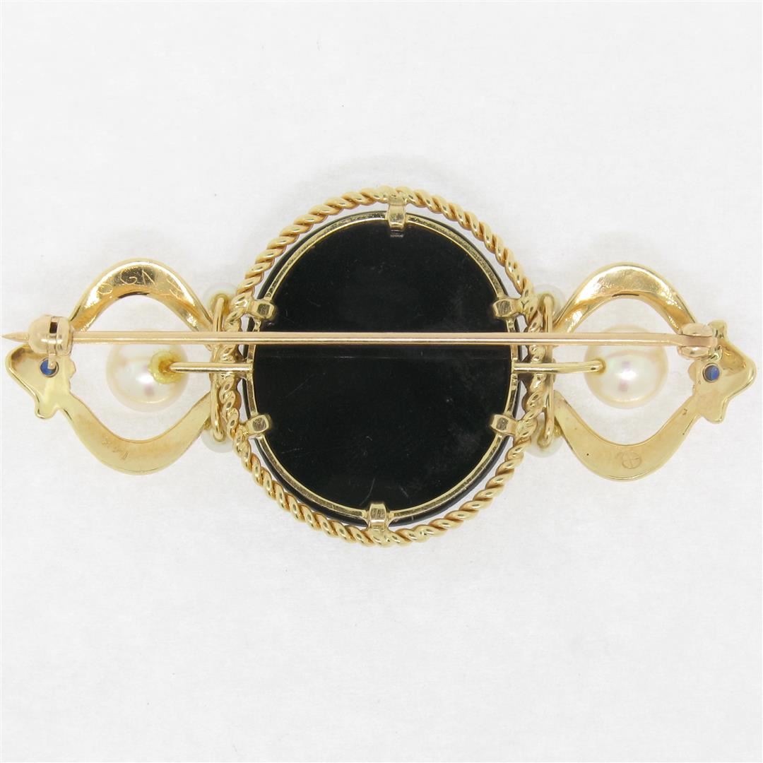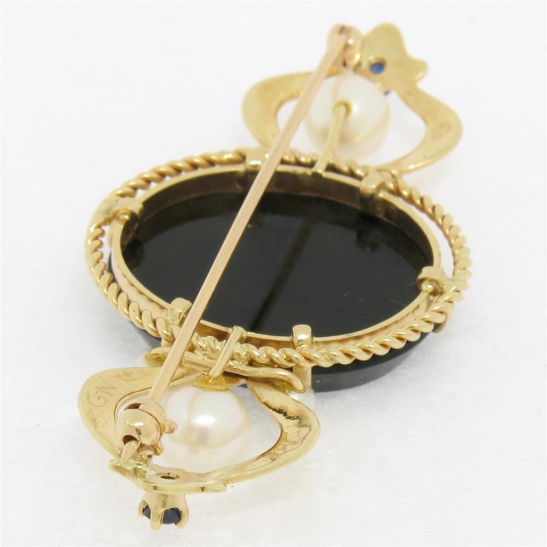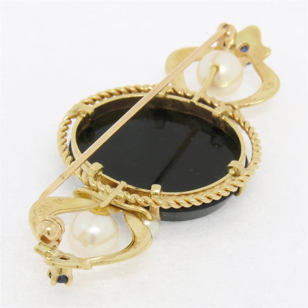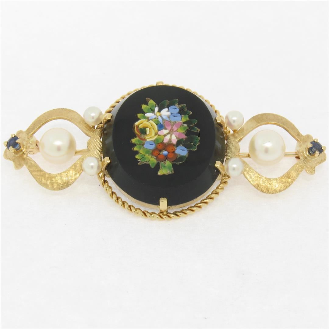 A vintage 14k yellow gold brooch with a 22.75x20.20mm black onyx floral mosaic accented by 0.18ctw of round sapphires and both 6.15mm and 3.20mm pearls. Measures 53.60x26.05mm and weighs a total of 9.24 grams.
