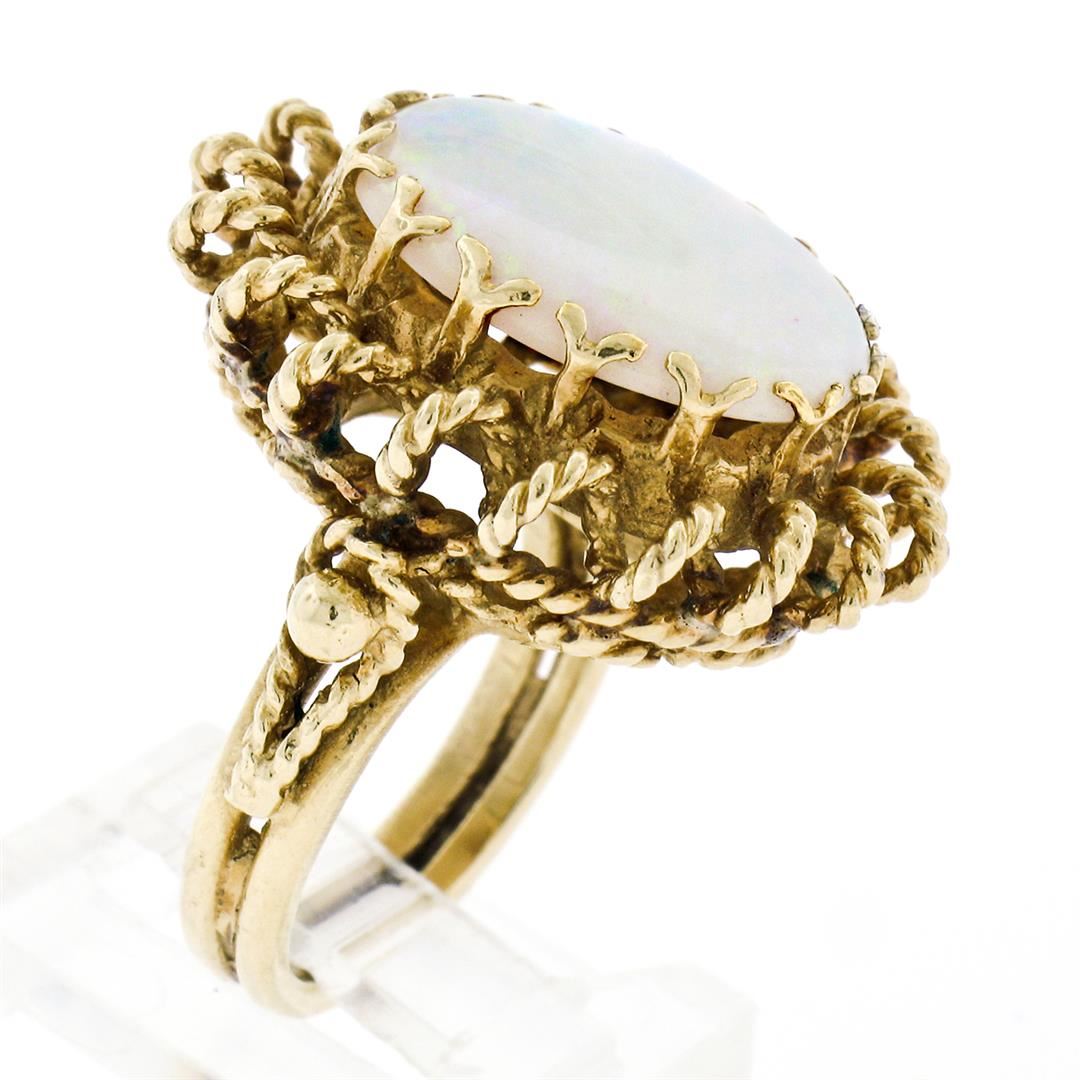 A vintage solid 14k yellow gold ring, with 1 oval cabochon cut natural opal (16.0x12.0mm - 5.75ct ). The ring is size 5.0, weighs a total of 12.48 grams, and measures 25.0mm wide.