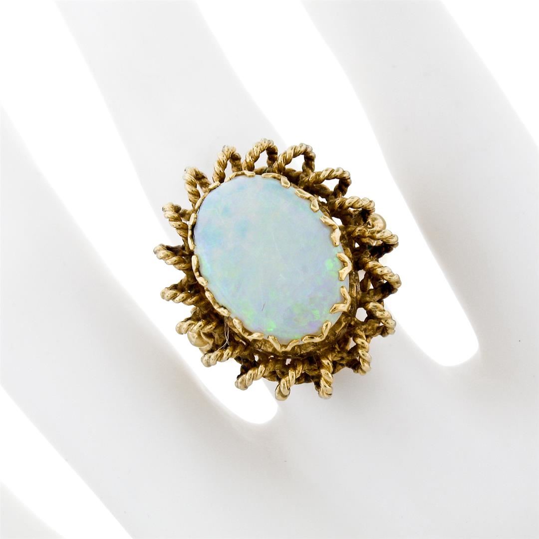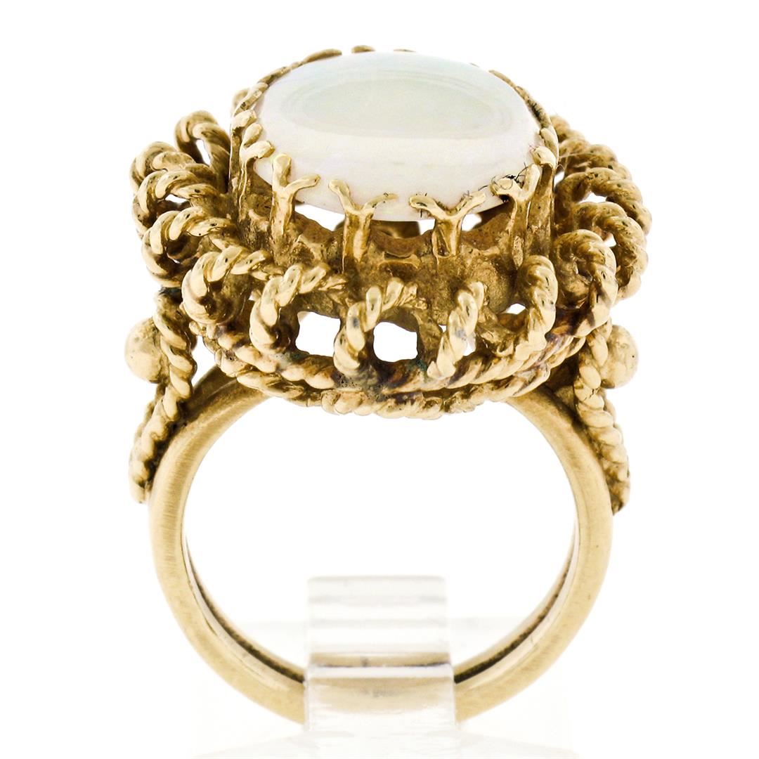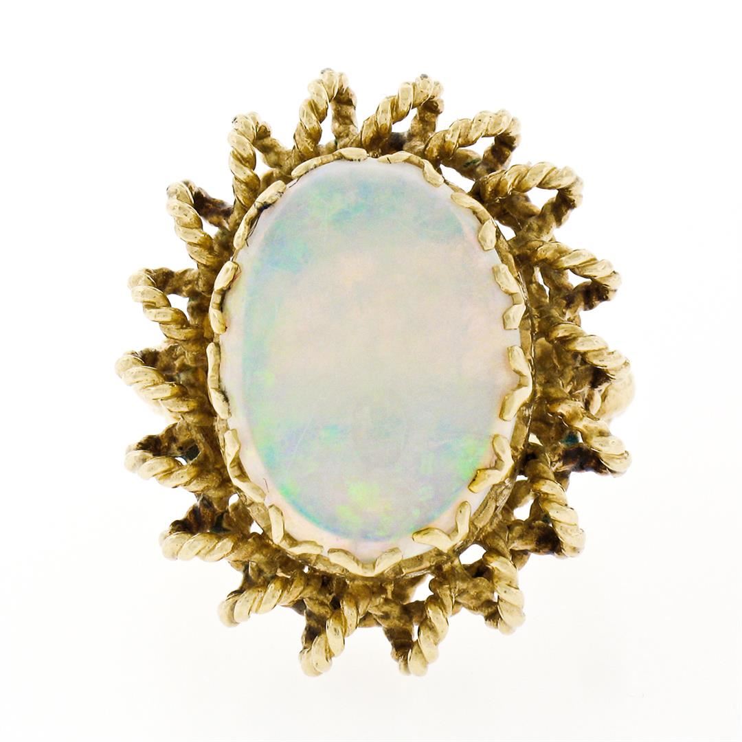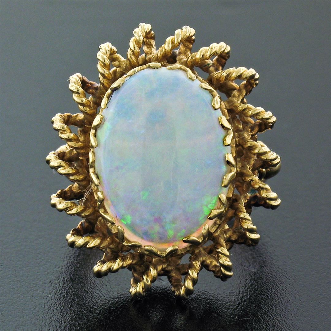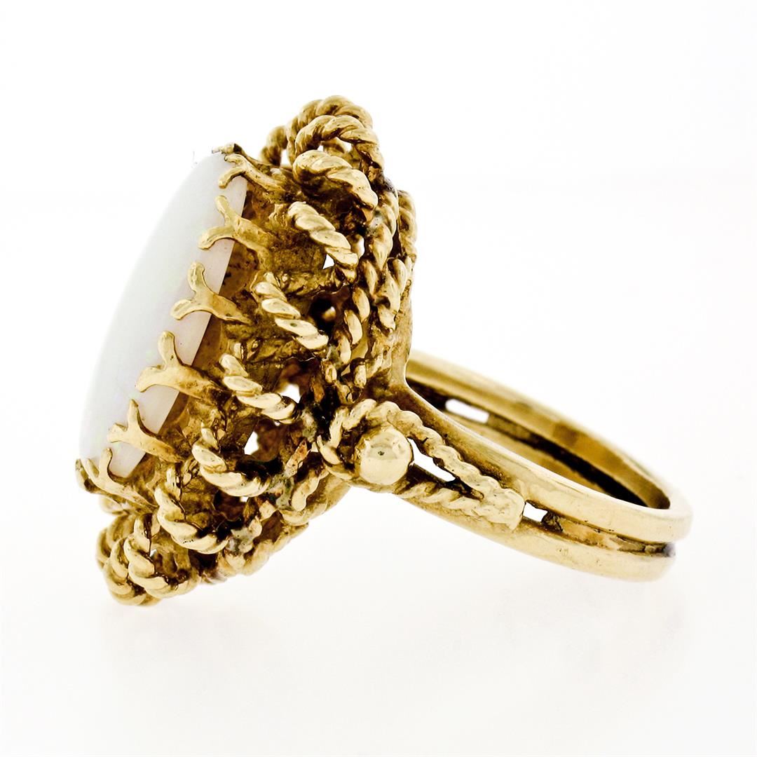 A vintage solid 14k yellow gold ring, with 1 oval cabochon cut natural opal (16.0x12.0mm - 5.75ct ). The ring is size 5.0, weighs a total of 12.48 grams, and measures 25.0mm wide.