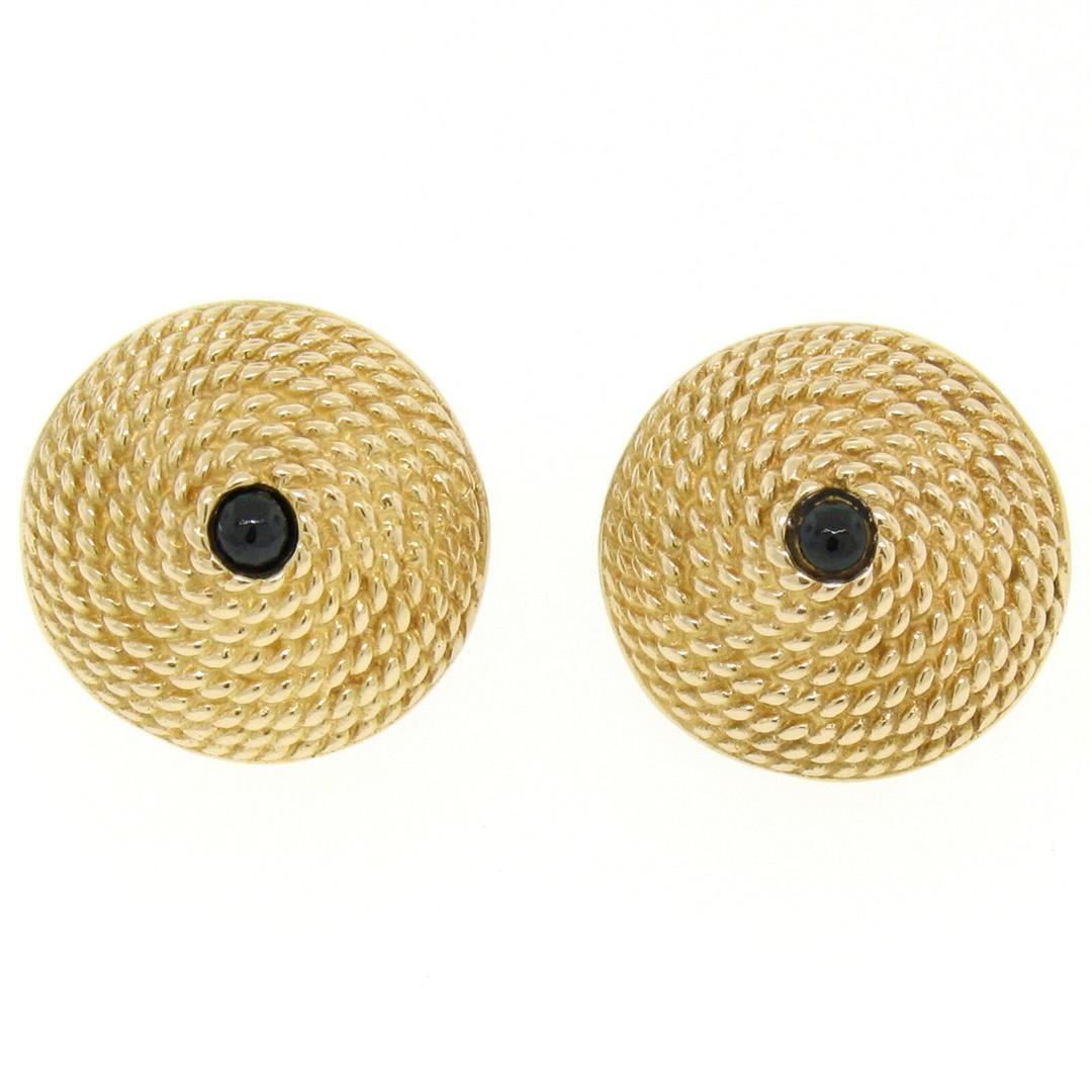 One 14k Yellow Gold Round Cabochon Sapphire Topped Twisted Wire Cone Shaped Earrings. Item Details: Material: 14K Solid Yellow Gold, Weight: 7.6 Grams, Stone(s): (2) Natural Genuine Sapphires - Round Cabochon Cut - Bezel Set - Deep Blue Color, Total Carat Weight: 0.30 (approx.), Backing: Post Backs w/ Butterfly Fastenings (Pierced ears required), Diameter: 14.85mm, Thickness: 7.3mm projection off the ear, Signature: 14K SI 585 MMA ©1995 Condition: Amazing Like New Condition!