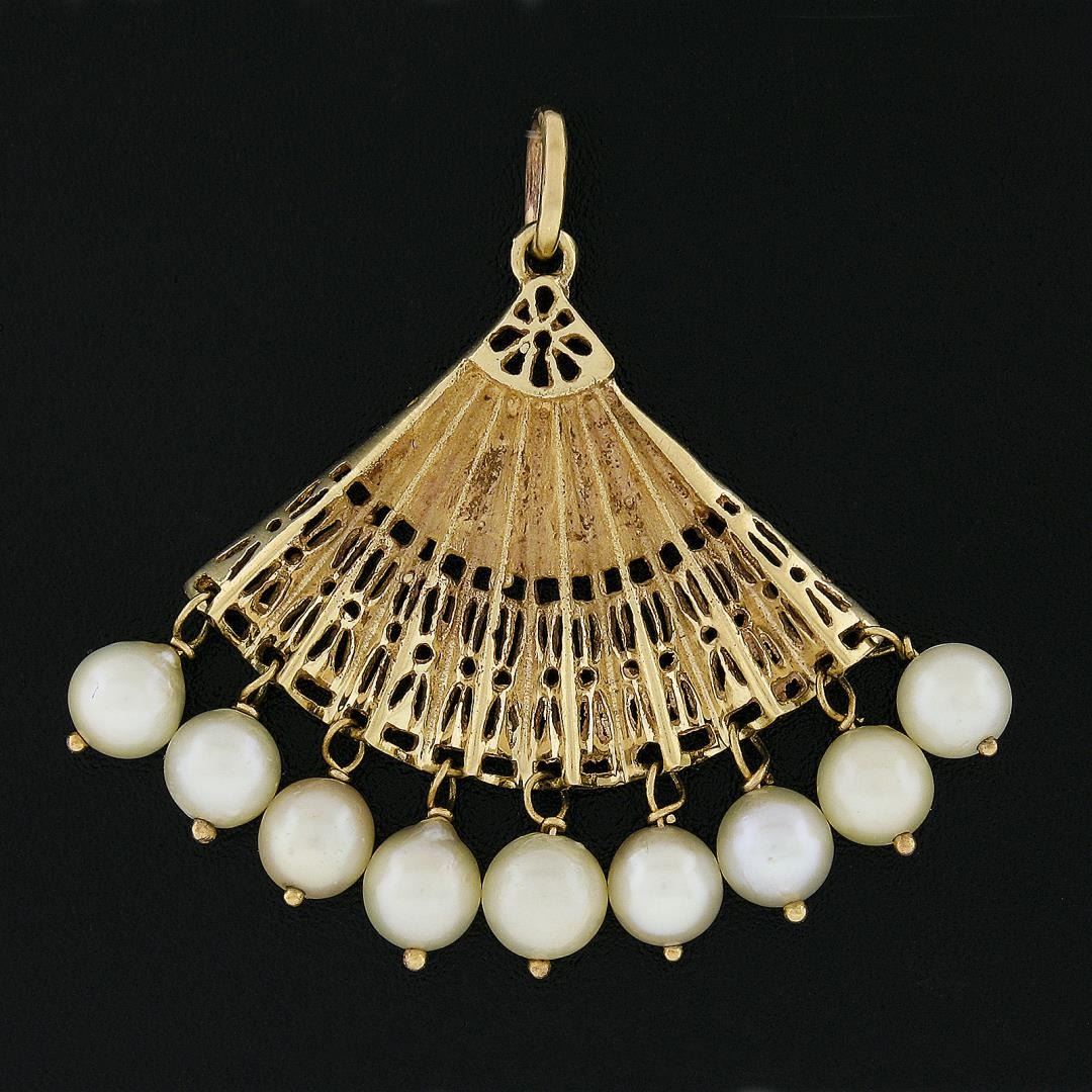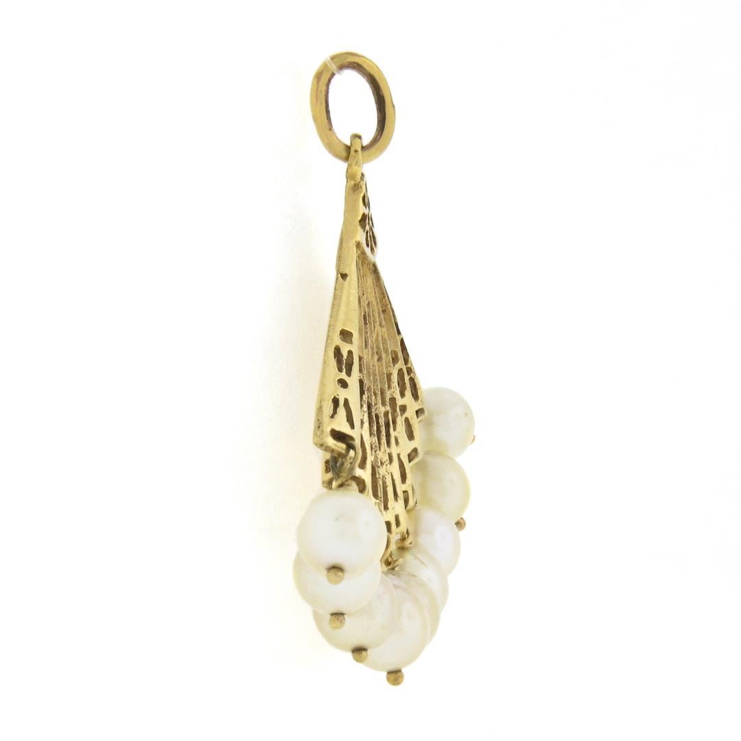A vintage solid 14k yellow gold pendant, with 9 round bead shape cultured pearls (5mm each). The pendant weighs a total of 5.11 grams, measures 37.8x30.9mm including the bail, and the inside of the bail measures 3.7x2.9mm.