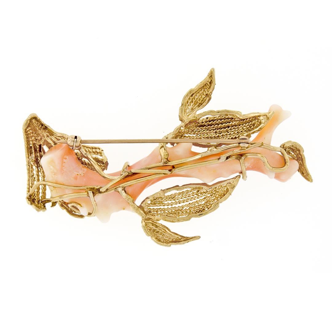 A vintage 14k yellow gold brooch featuring a piece of natural angel skin coral and twisted wire work. Measures 67.0x40.8mm and weighs a total of 17.22 grams.