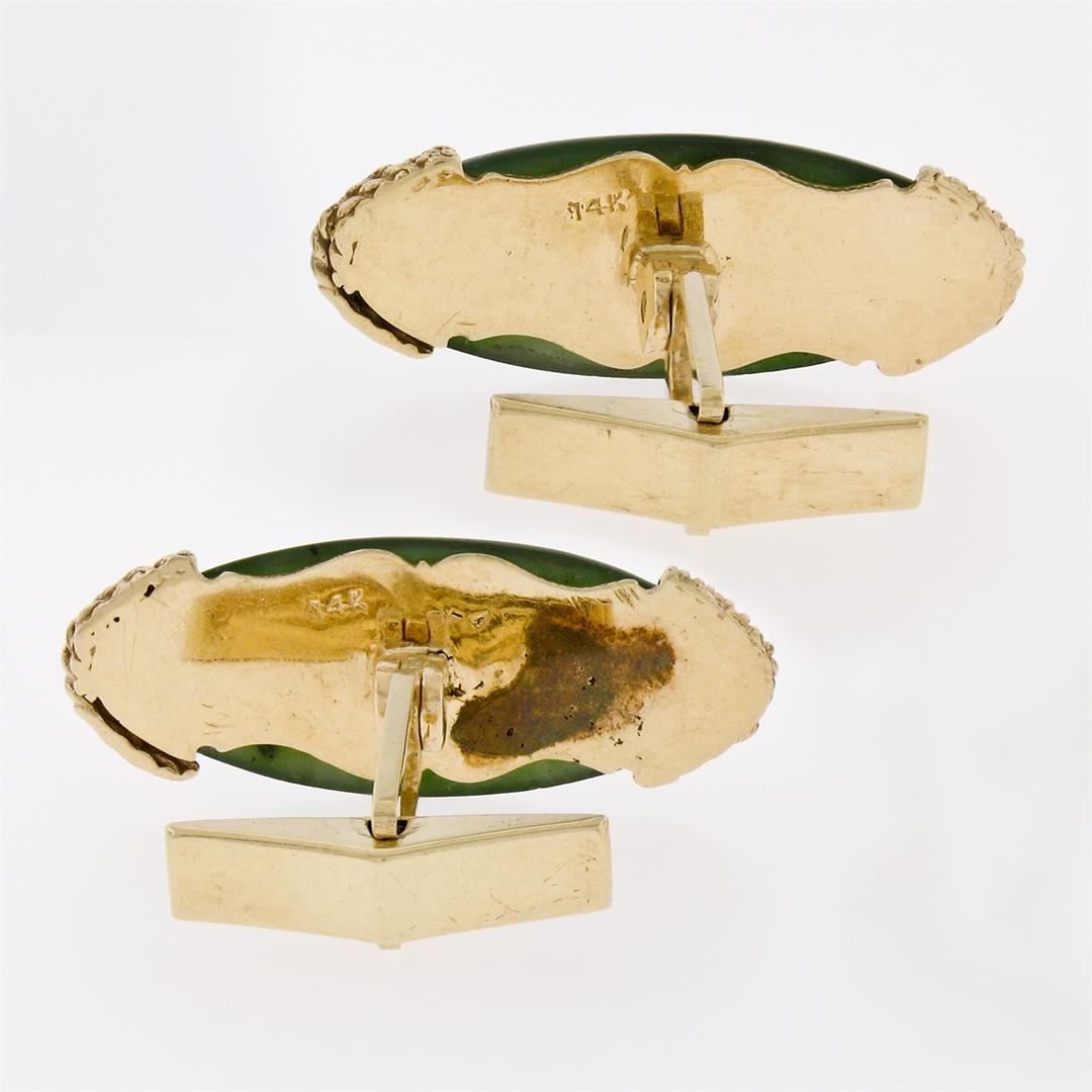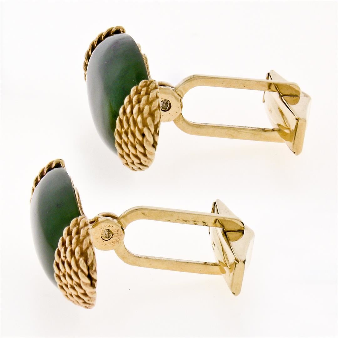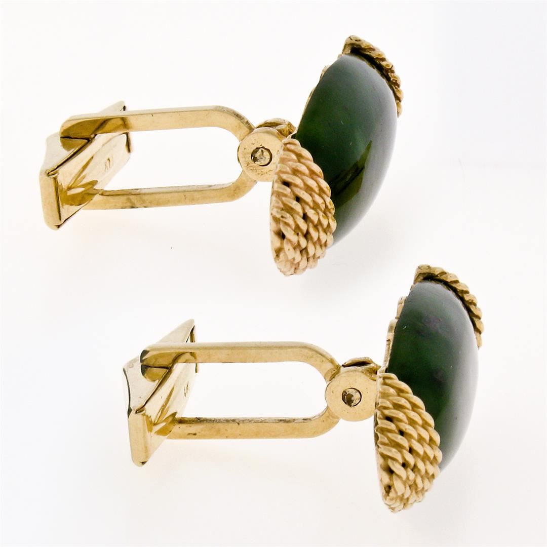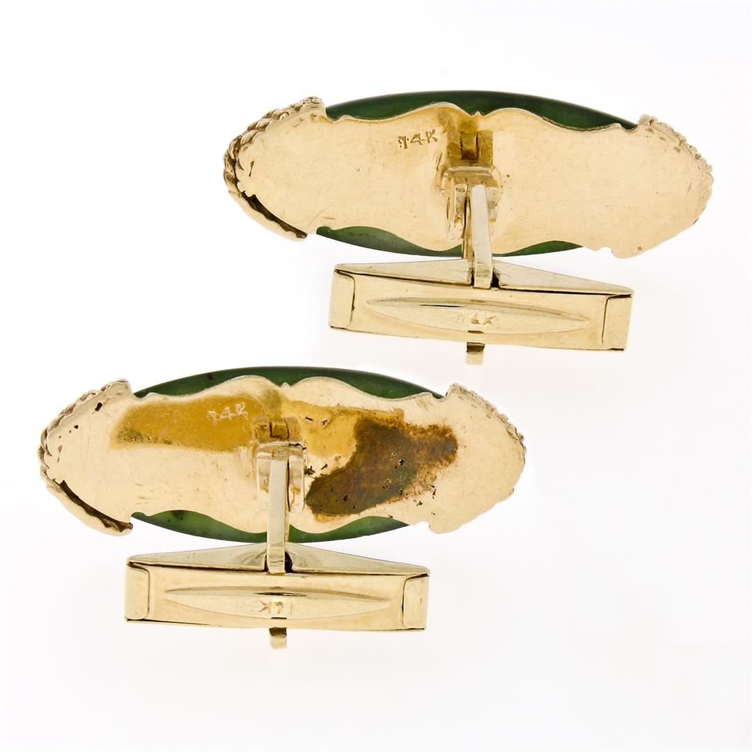 A vintage solid 14k yellow gold marquise shape cufflinks, with 2 elongated marquise cabochon cut natural jade (11.52x20.55mm). These cuff links have a swivel design with a clearance of 14.64mm, weigh a total of 11.85 grams, and the front panels measure 11.52x30.97mm.
