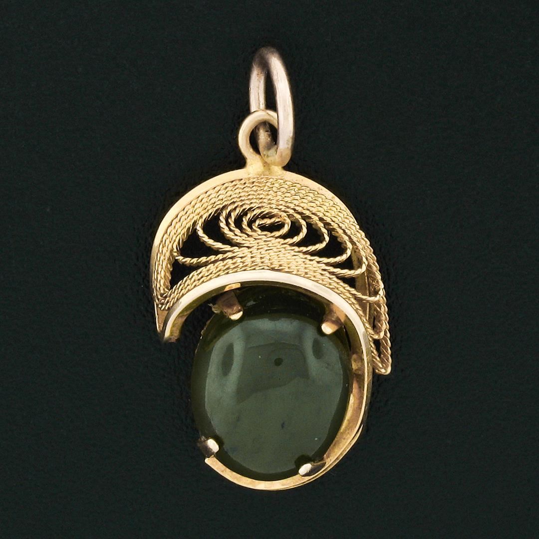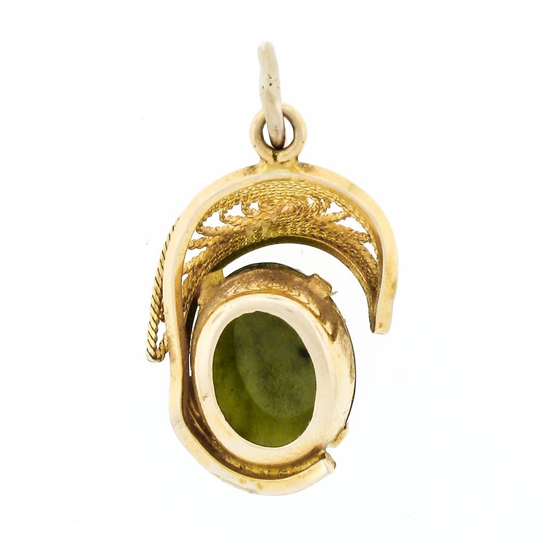 A vintage solid 14 yellow gold pendant, with oval cabochon cut natural jade (10.15x8.2mm). The pendant weighs a total of 1.7 grams, measures 24.55x12mm including the bail, and the inside of the bail measures 3.50x3.65mm.