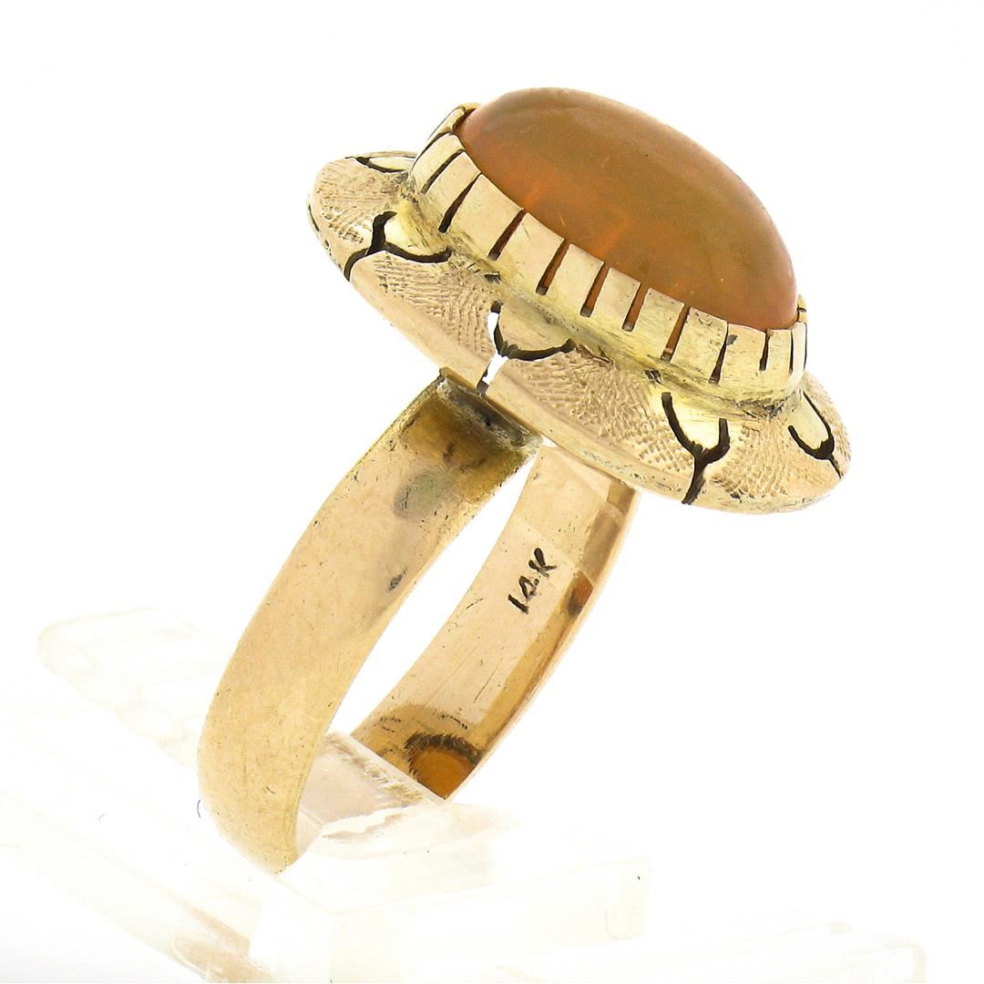 A vintage solid 14 yellow gold platter ring, with 1 oval cabochon cut natural jelly opal (12.2x8.1mm). The ring is size 6.5, weighs a total of 4.38 grams, and measures 18.60mm wide.
