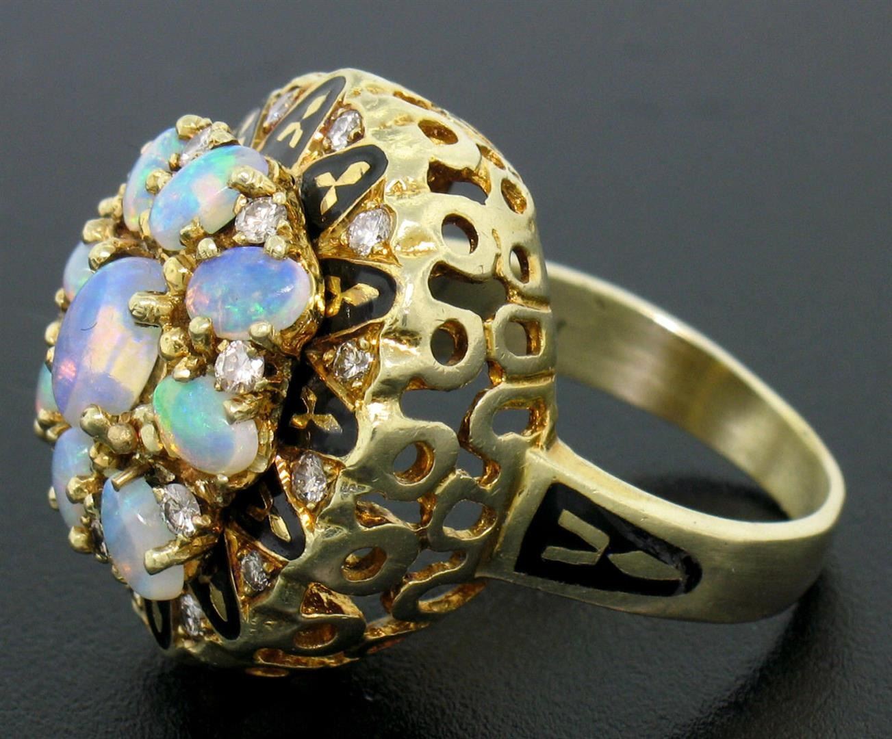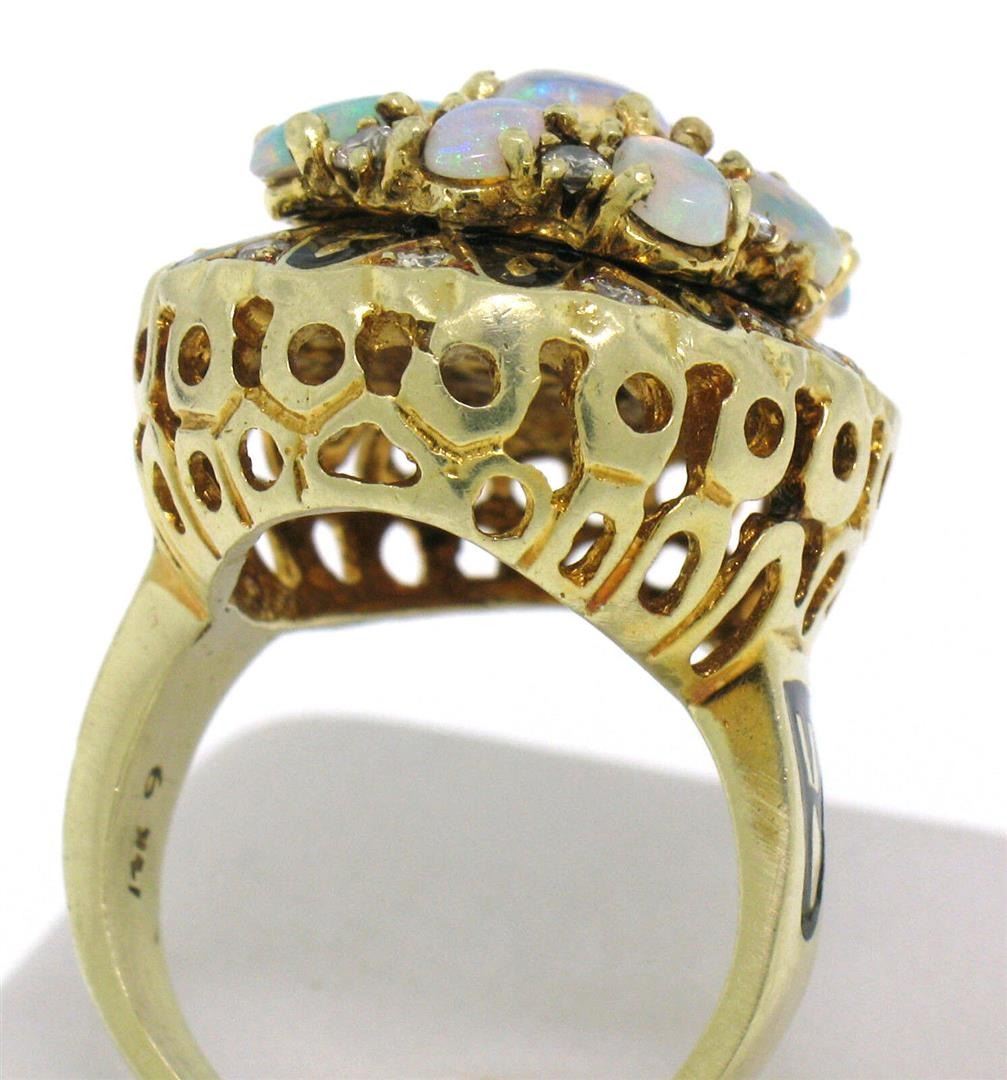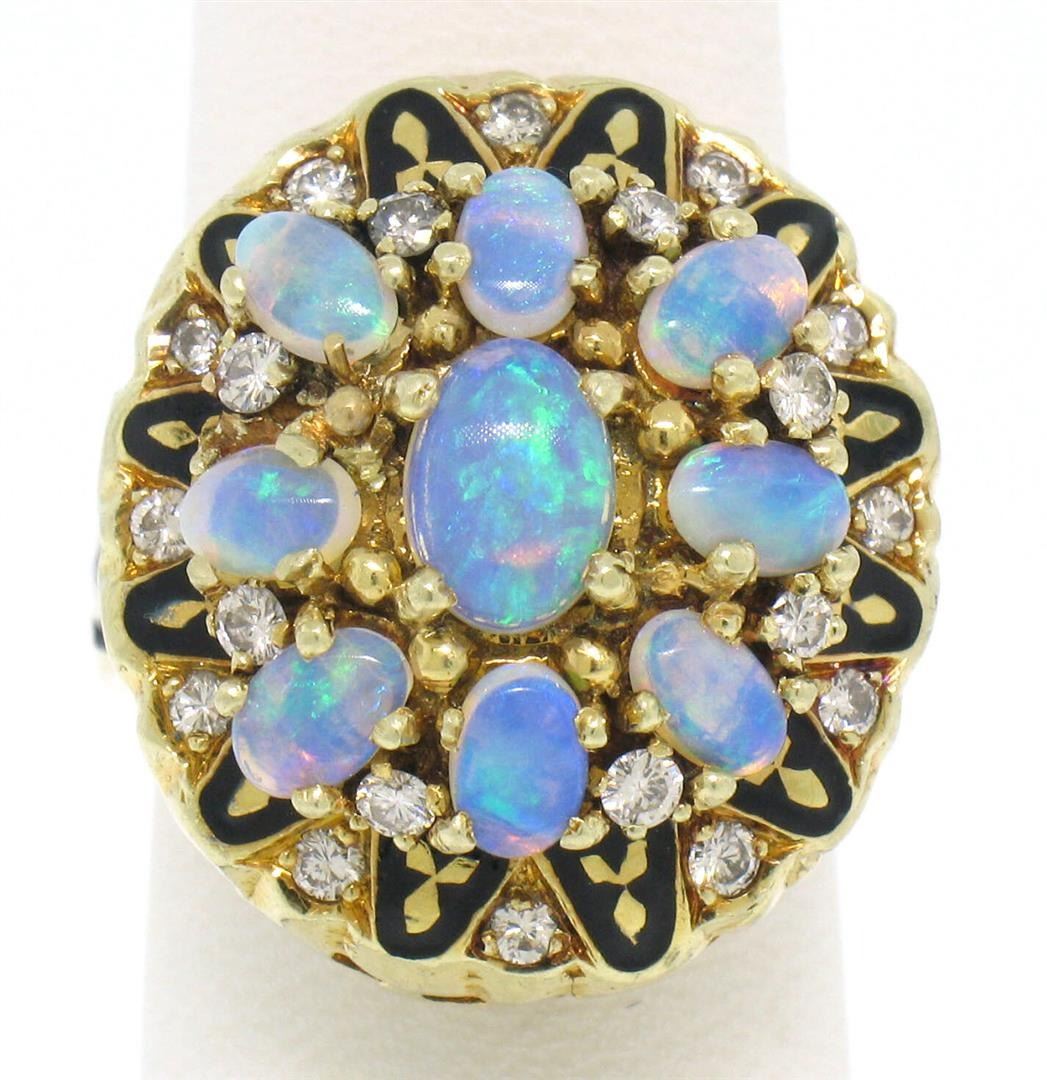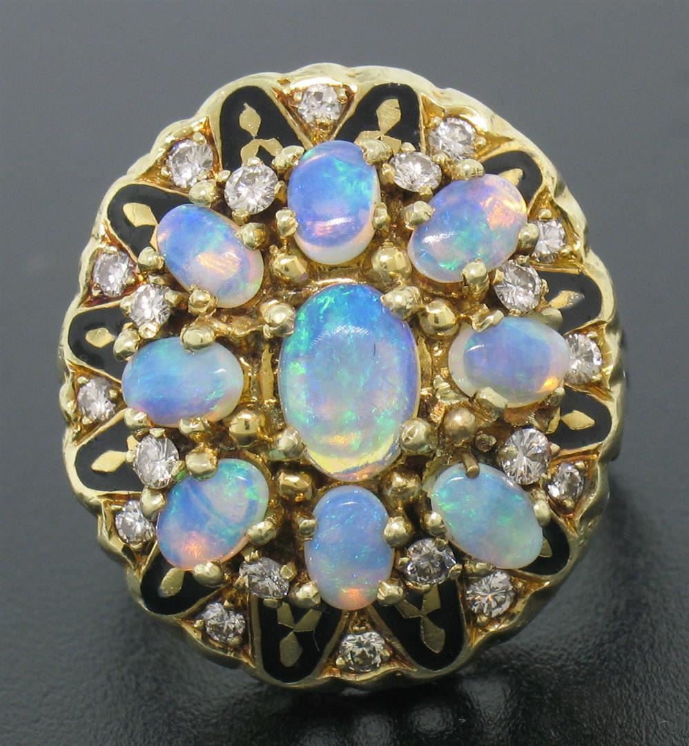 A vintage solid 14k yellow gold cocktail ring, featuring 9 oval cabochon cut natural crystal opal (2.50ctw), and 20 round brilliant cut natural diamonds (F/G- VS1/VS2; 0.40ctw), and balck enamel work. The ring is size 7.0, weighs a total of 18.0 grams, and measures 21.0mm wide.