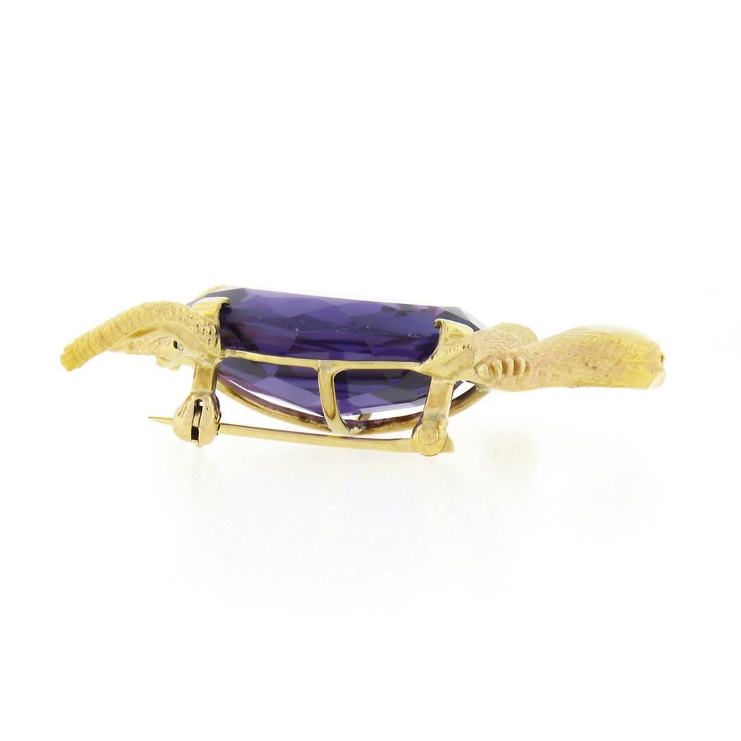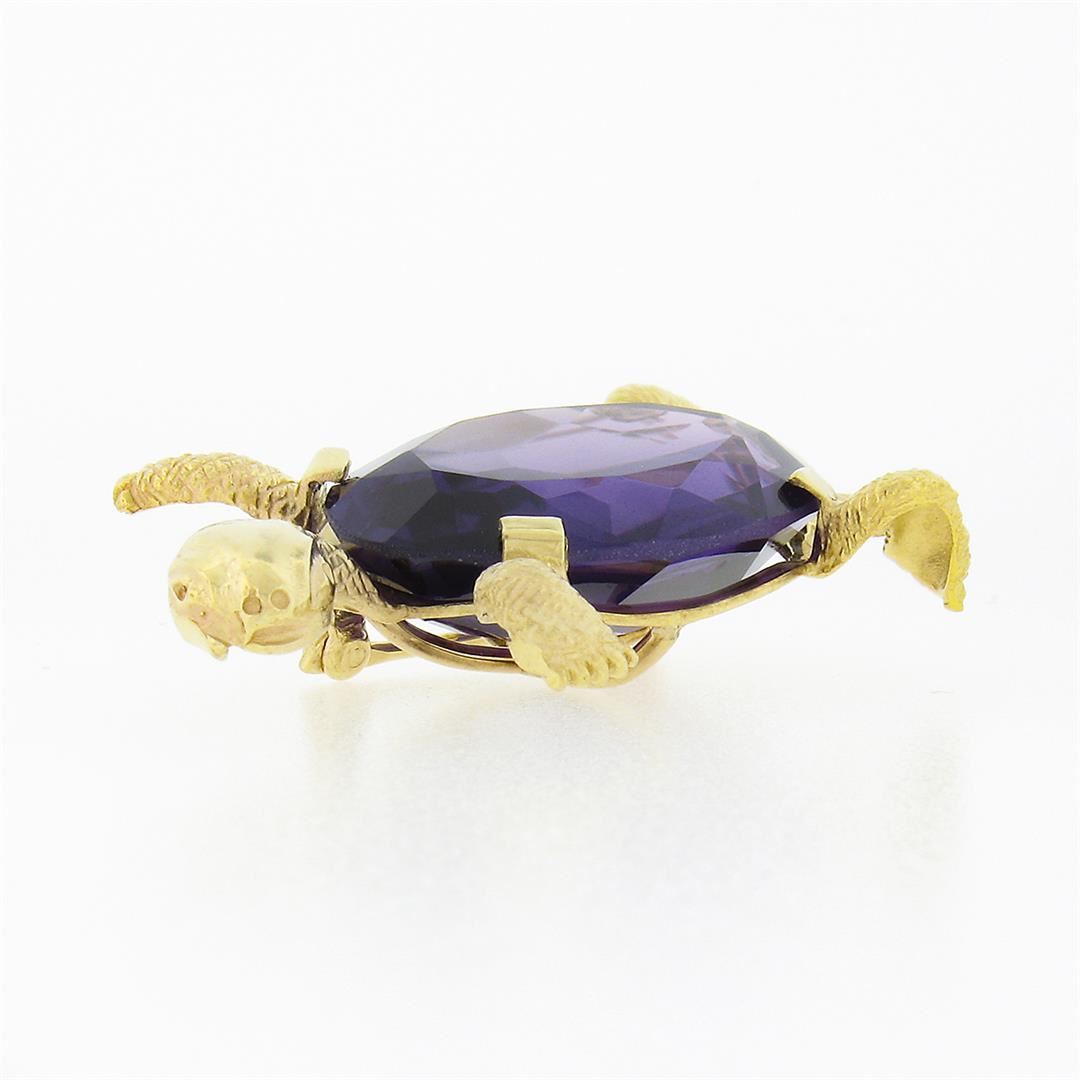 A vintage solid 14k yellow gold turtle pin brooch, with 1 oval brilliant cut purple stone (24.1x16.4mm). Measures 28.0x41.90mm and weighs a total of 11.40 grams.