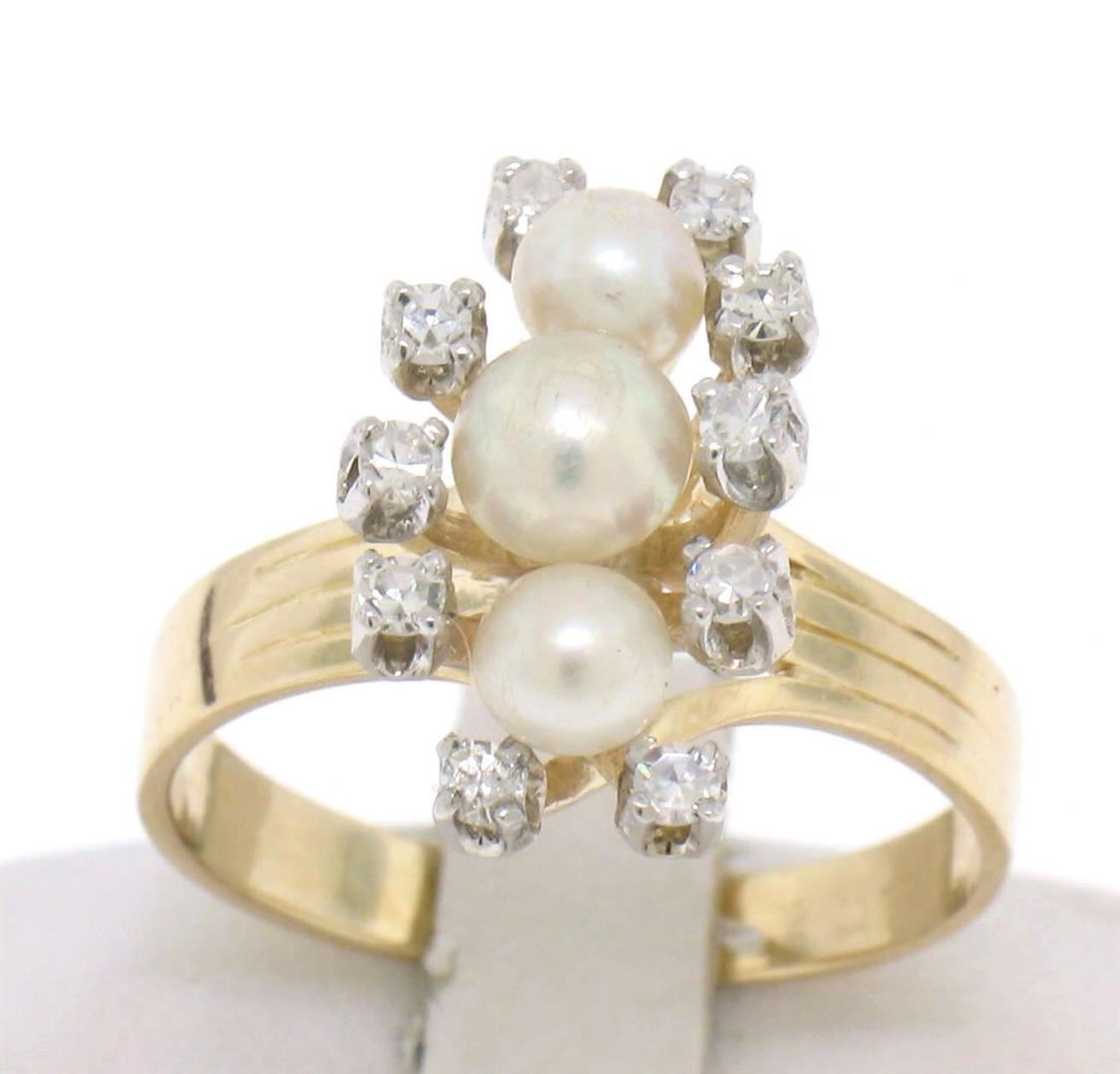 A vintage solid 14k yellow gold elongated dinner ring, with 3 natural genuine cultured akoya pearls (), surrounded with 10 single cut natural diamonds (F- VS1; 0.20ctw). The ring is size 7.75, weighs a total of 4.08 grams, and measures 10.03mm wide.
