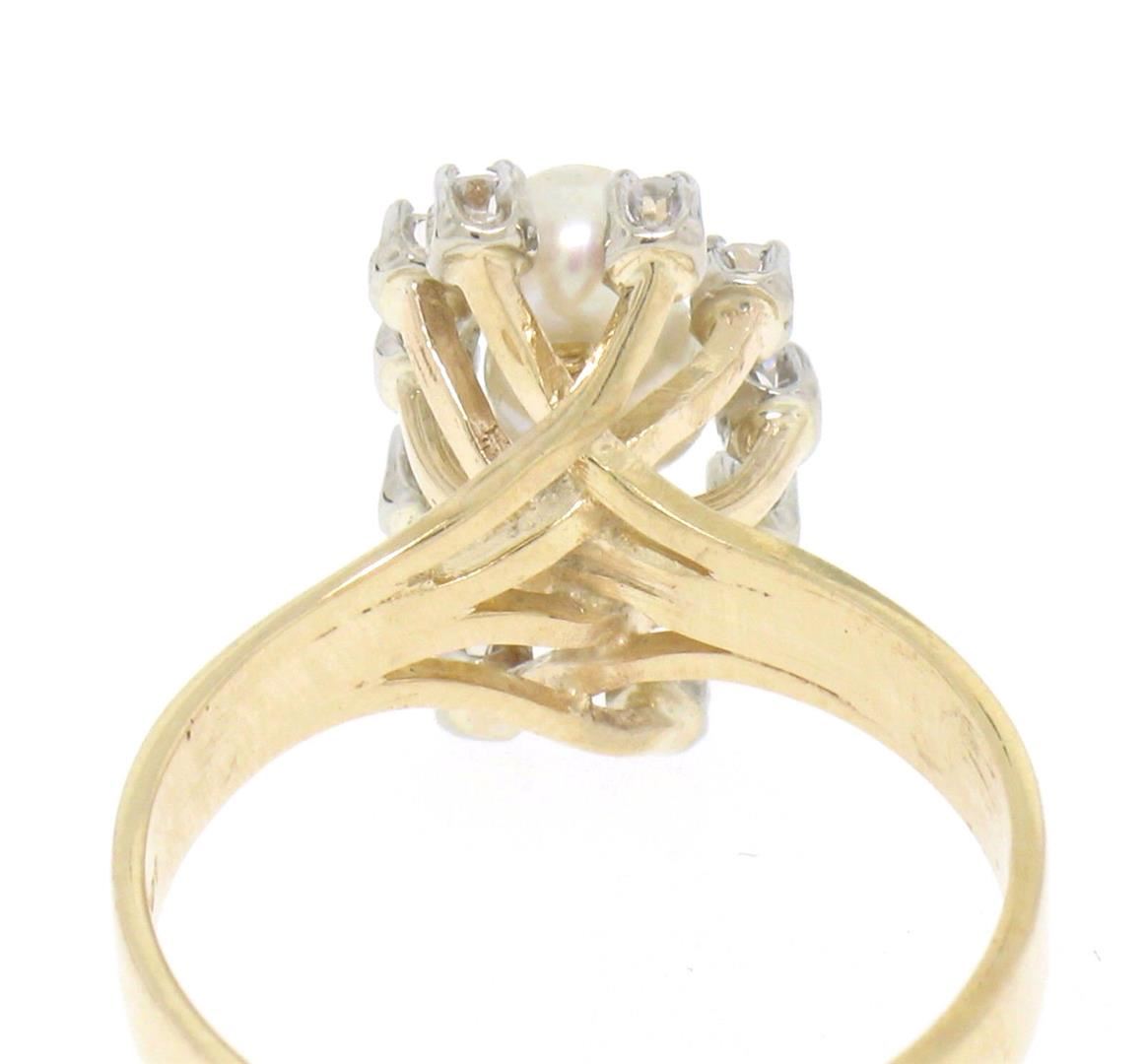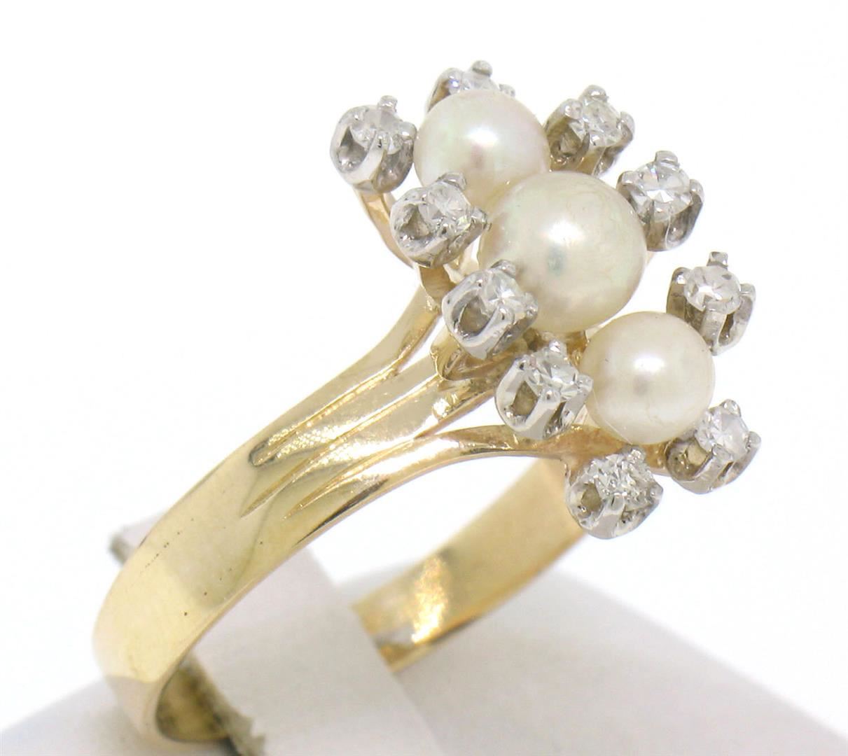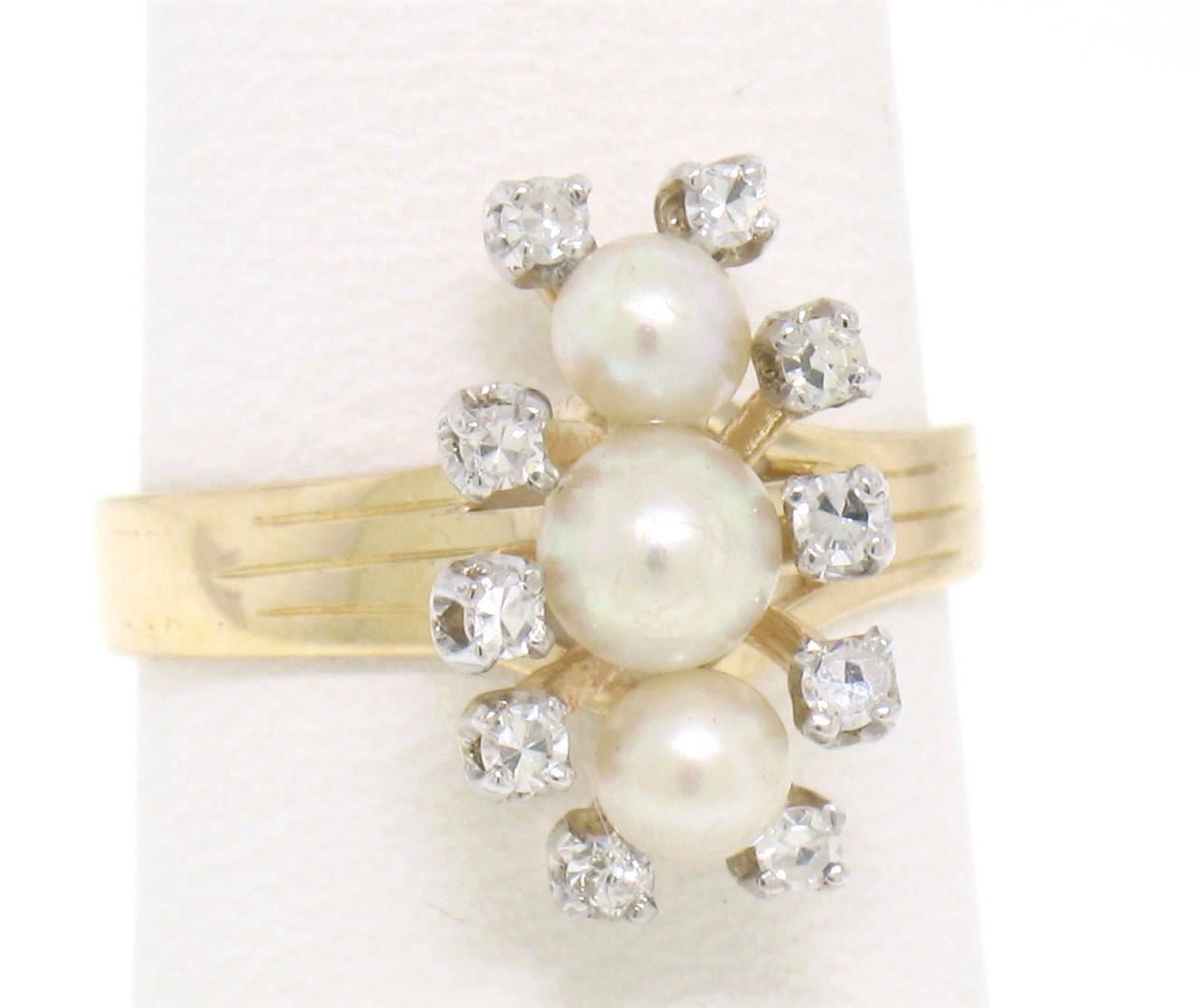 A vintage solid 14k yellow gold elongated dinner ring, with 3 natural genuine cultured akoya pearls (), surrounded with 10 single cut natural diamonds (F- VS1; 0.20ctw). The ring is size 7.75, weighs a total of 4.08 grams, and measures 10.03mm wide.