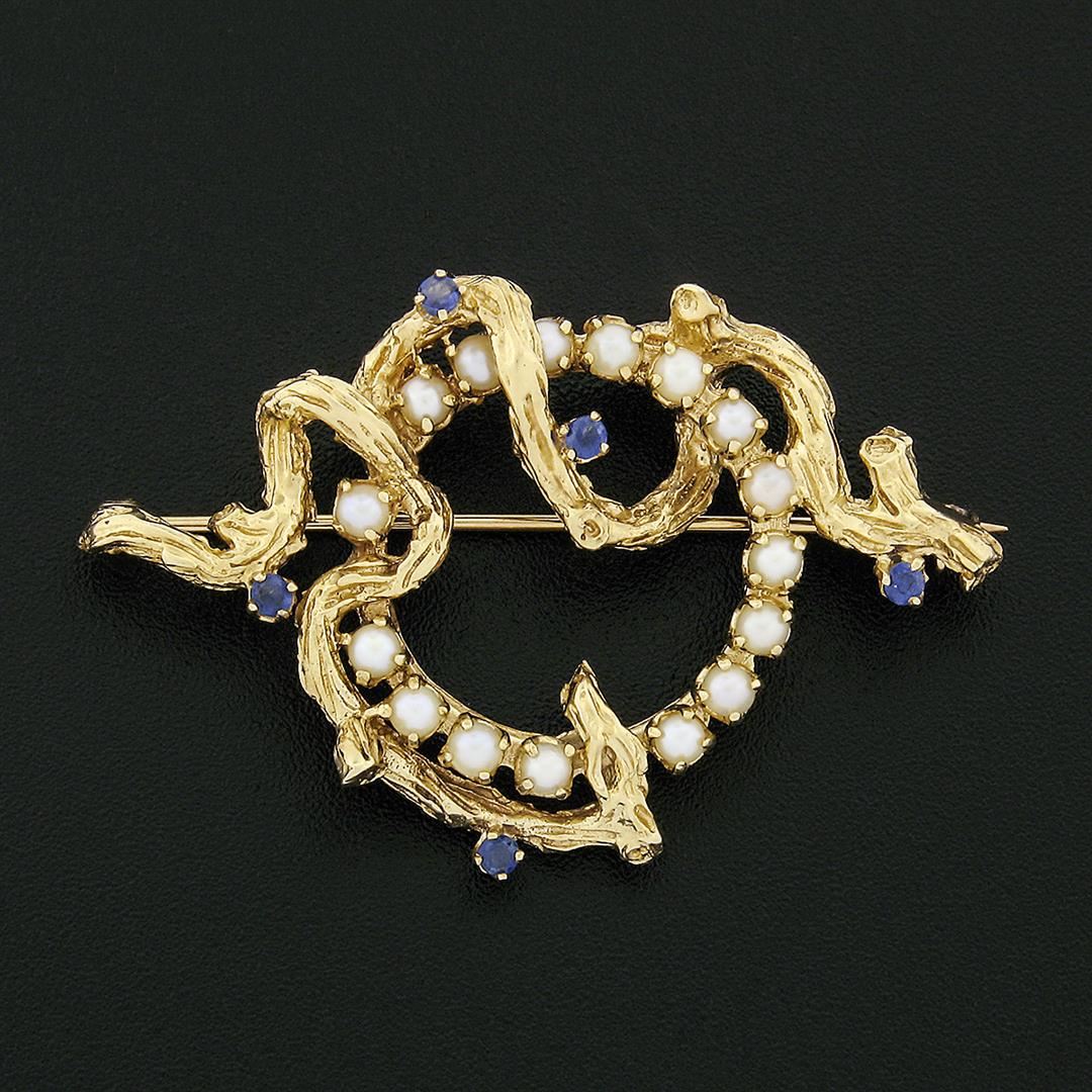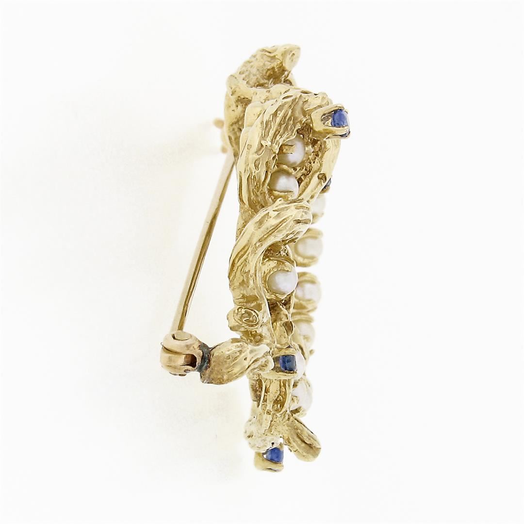 A vintage solid 14k yellow gold vine pin brooch, with 16 round shape natural pearls (2.5-2.7mm), and 5 round brilliant cut natural sapphires (0.15ctw ). Measures 30.4x46.8mm and weighs a total of 11.57 grams.