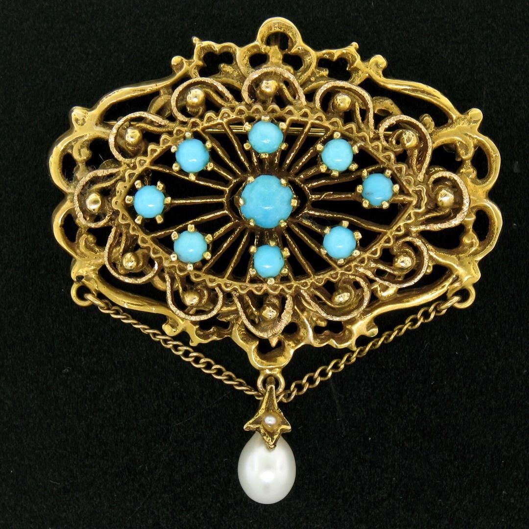 One Vintage 14k Yellow Gold Round Turquoise & Pearl Open Work Brooch Pin Pendant. Item Details: Material: 14K Solid Yellow Gold, Total Weight: 11.7 Grams, Stone(s): (9) Natural Genuine Turquoise - Round Cabochon Cut - Prong Set - Matching Turquoise Color - 2.5 to 4.5mm, (1) Natural Genuine Pearl - Pear Shape - Pure White Color w/ Soft Pink Overtones - 5.31x7.18mm, (1) Natural Genuine Seed Pearl - 1.5mm (approx.), Overall Height: 44.6mm (including the pearl dangle), Overall Width: 41.4mm, Overall Thickness: 8.6mm (not including the pin) Bail Measurements (Inside): 4.18x2.55mm Clasp: Pin Back w/ Rotating Lock Mechanism Condition: Vintage piece. Original patina has been preserved. Excellent overall condition!