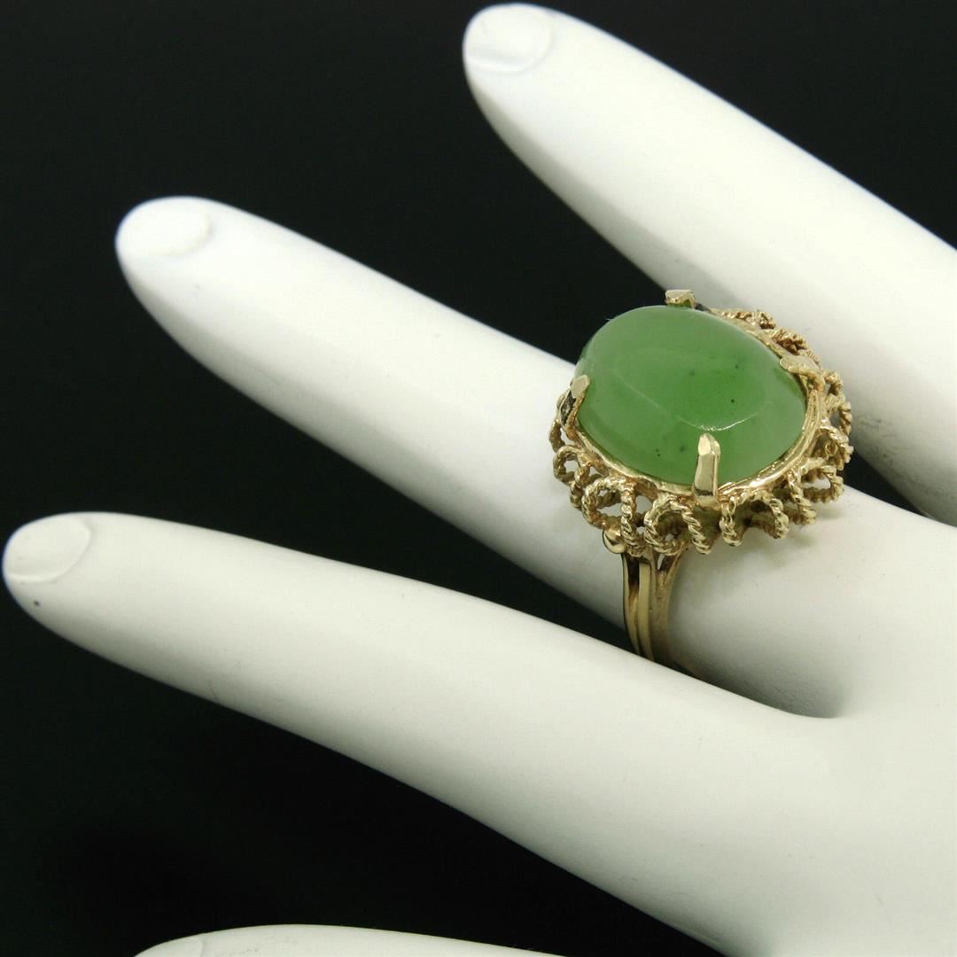 A vintage solid 14k yellow gold solitaire statement ring, with 1 oval cabochon cut natural jade (16.2x11.8mm ). The ring is size 5.5, weighs a total of 6.10 grams, and measures 20.20mm wide.